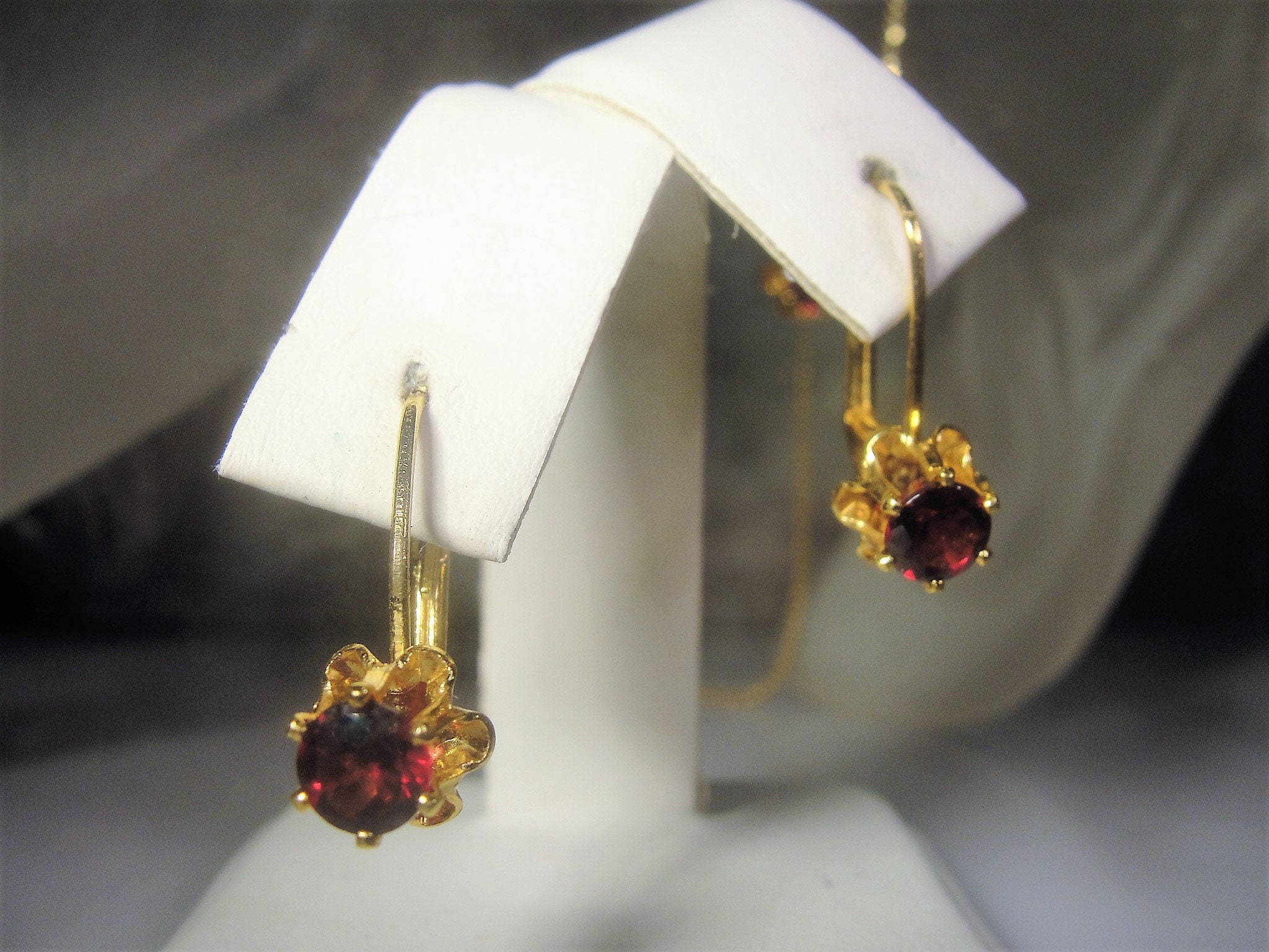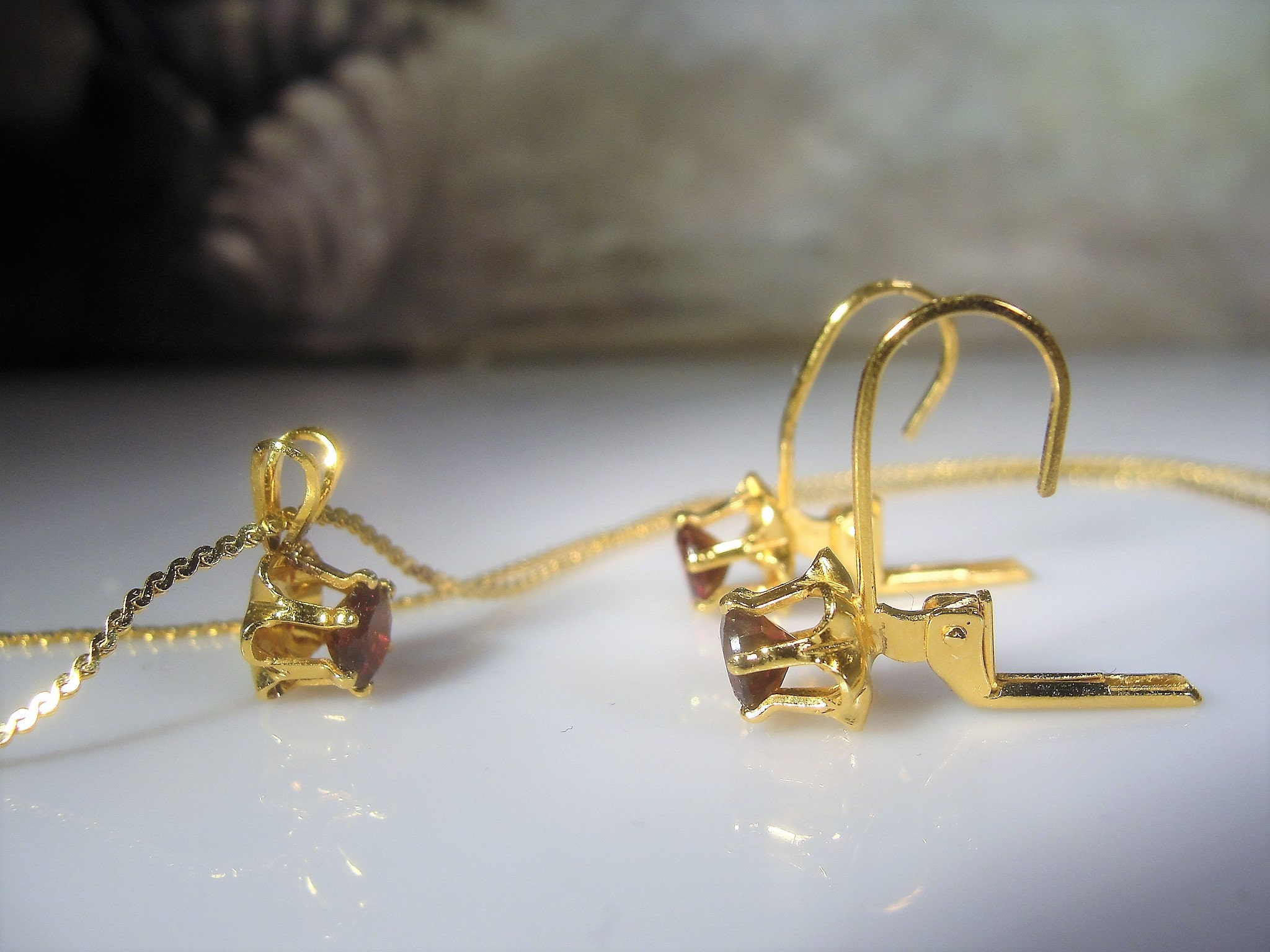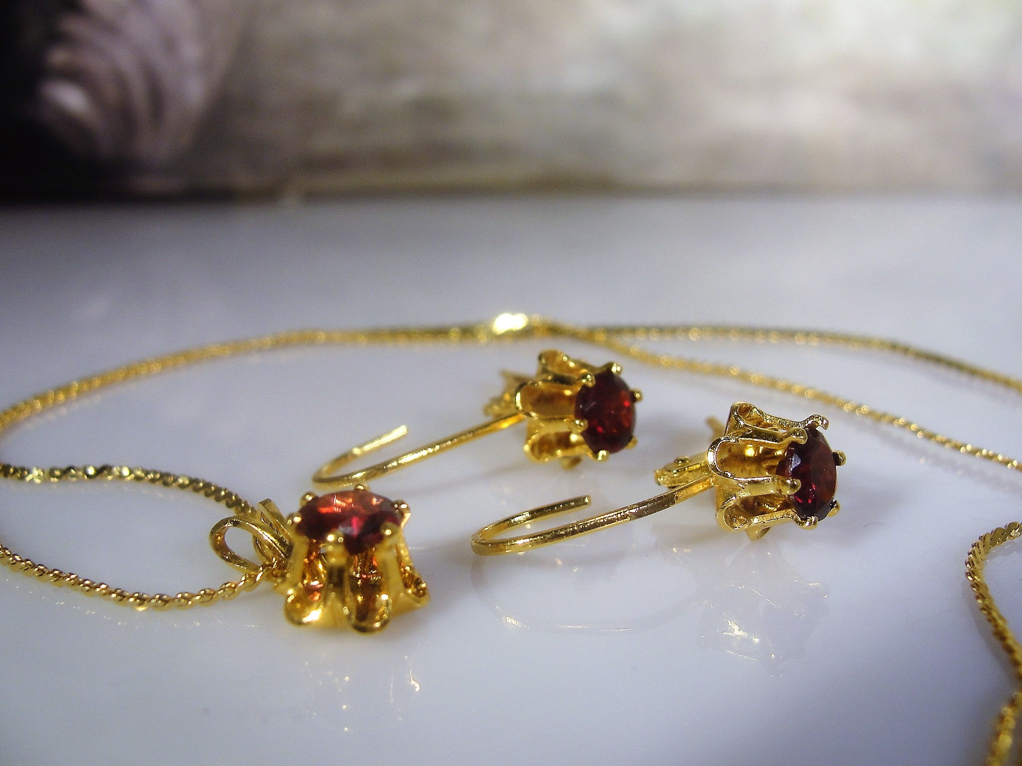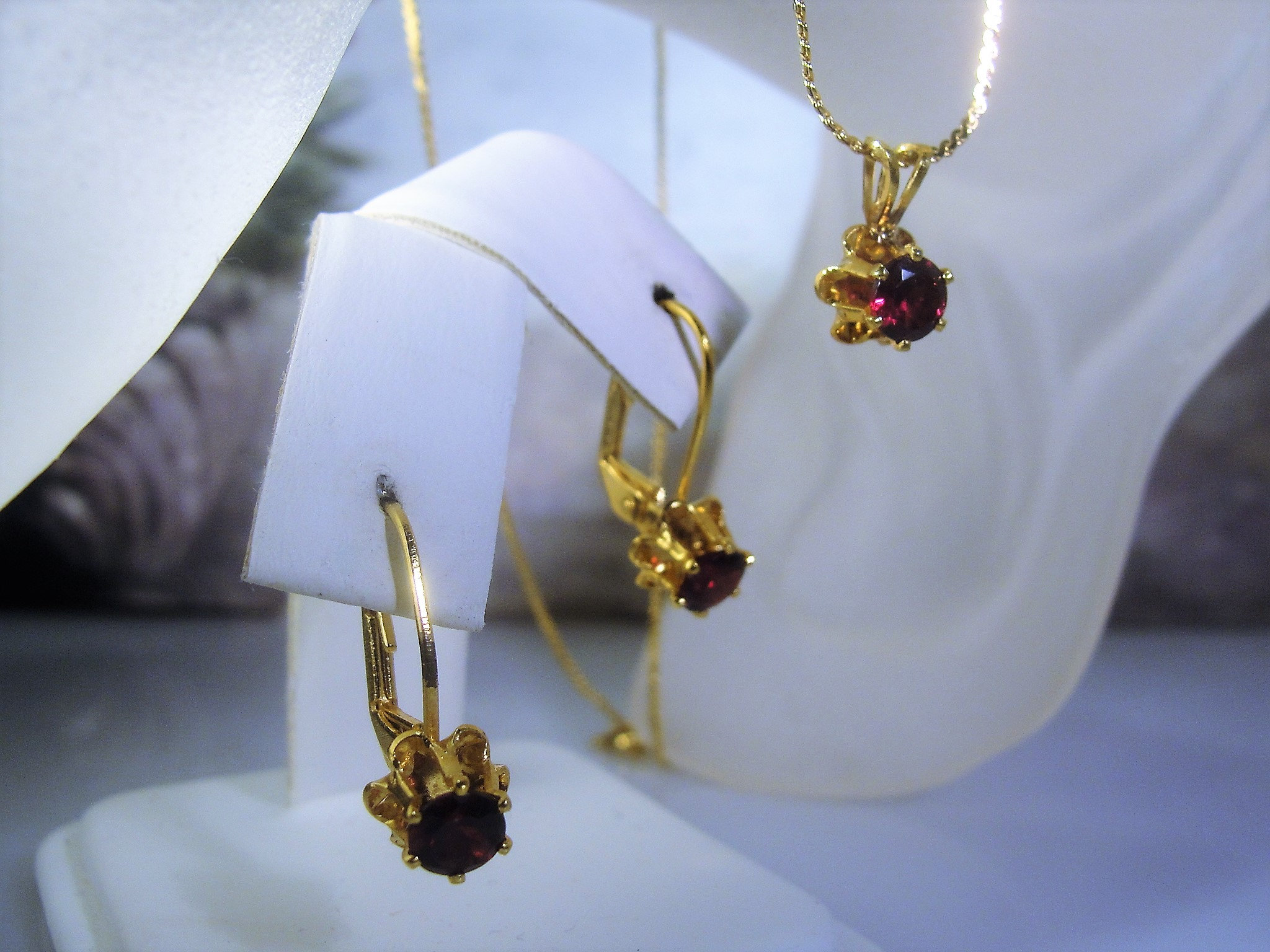 This is a lovely genuine Garnet Necklace and Earrings Set. The necklace has a solitaire round garnet gem that is set in a Buttercup Belcher Setting. It has a nice Cable Chain that measures 16 inches in length. The earrings are lever back earrings made for pierced ears. They too have a lovely Buttercup Belcher Setting. Just a lovely gold plated Garnet Jewelry set for the special January birthday girl or for that special person that love the garnet gem. These garnet have quite a bit of purple in them and are very close to a Rhodolite garnet. The color is deep and rich!