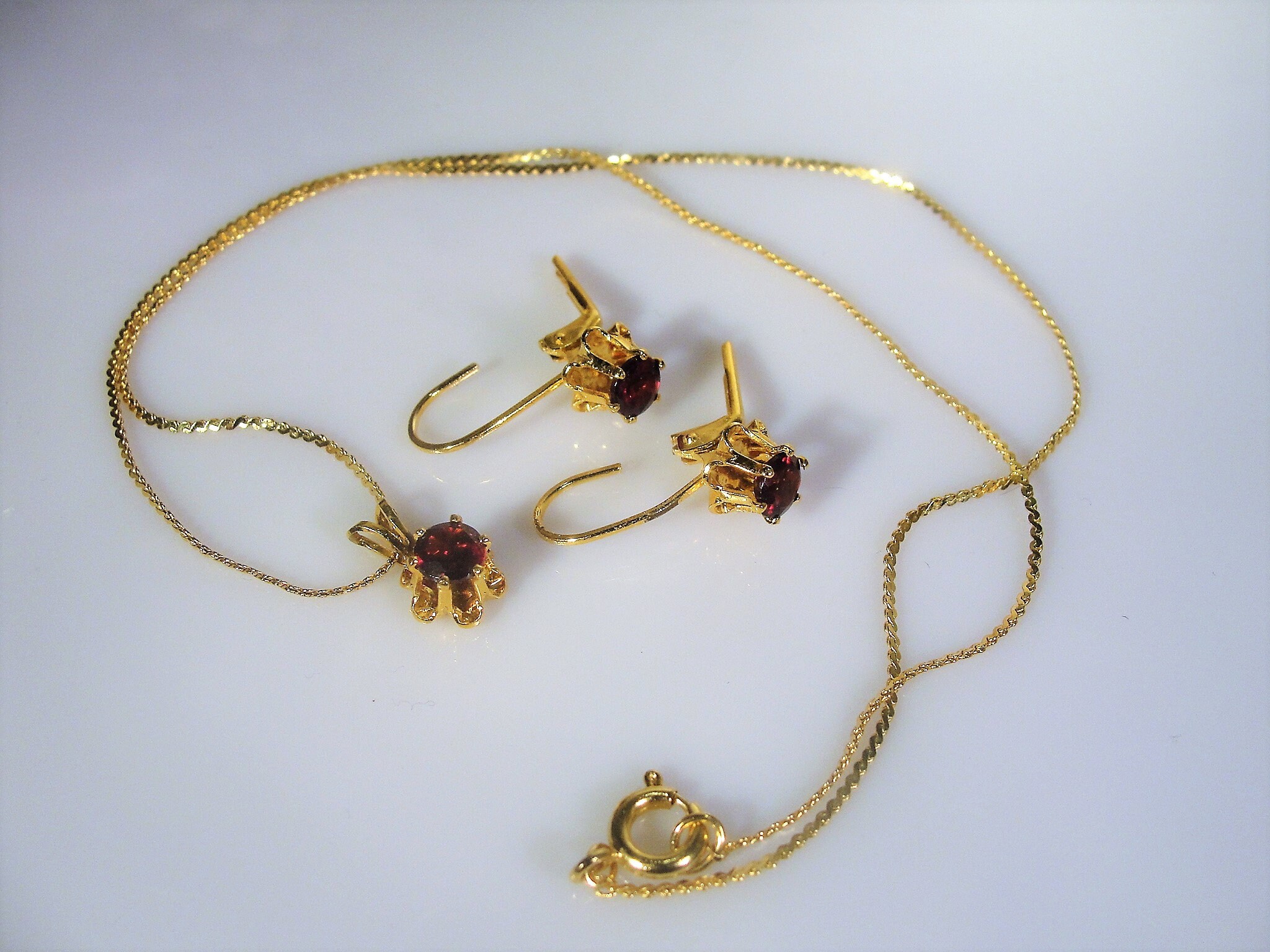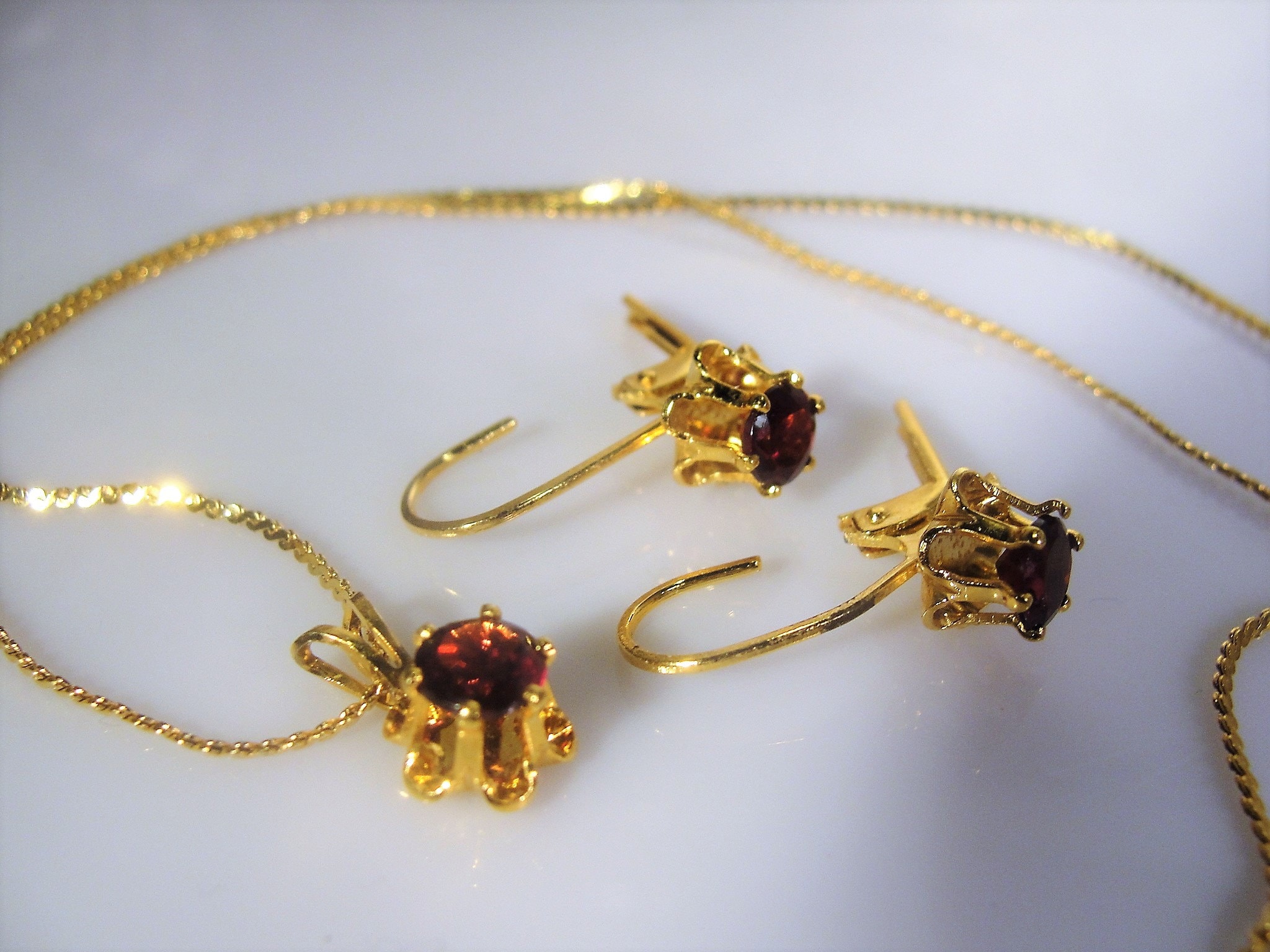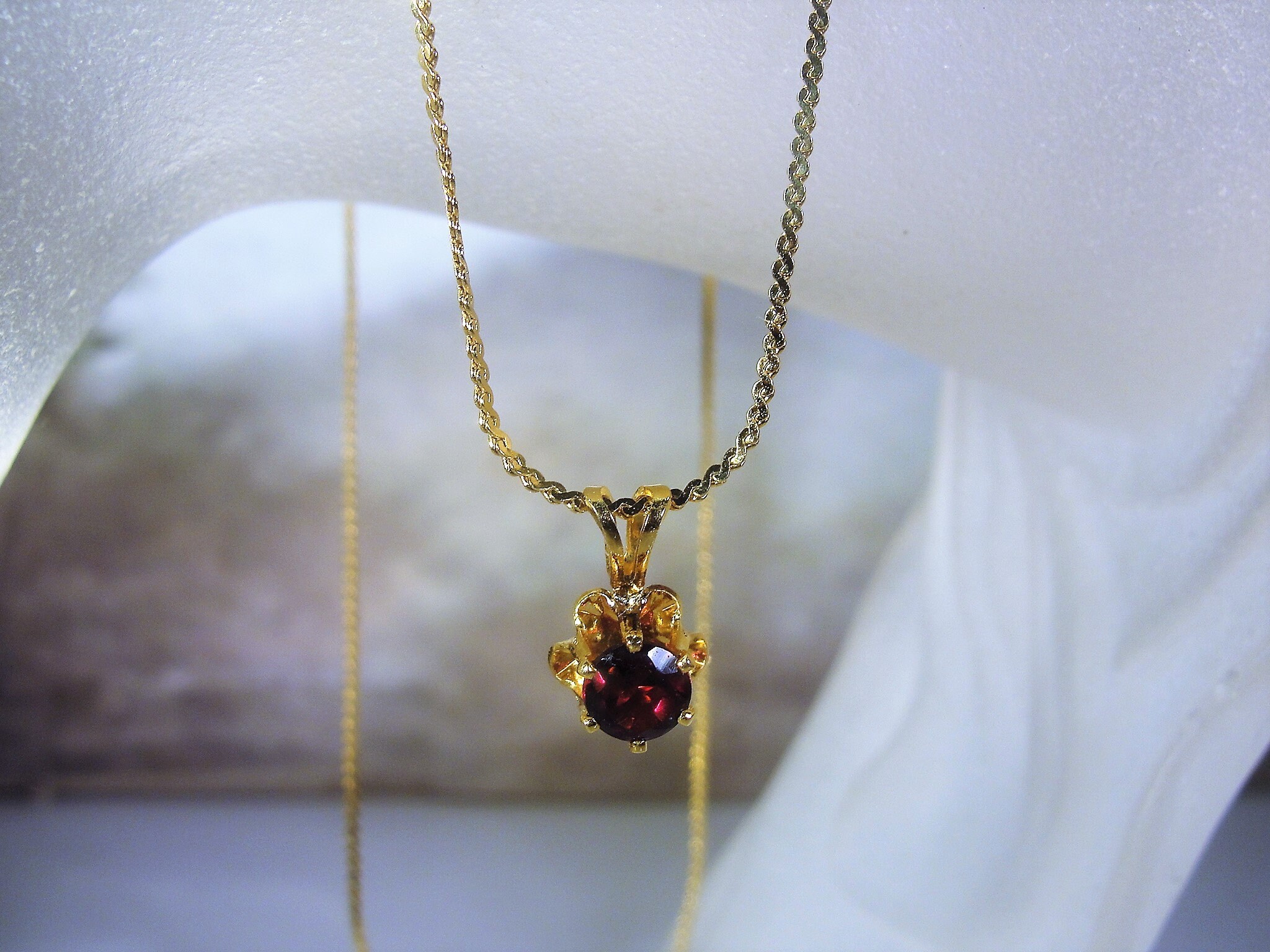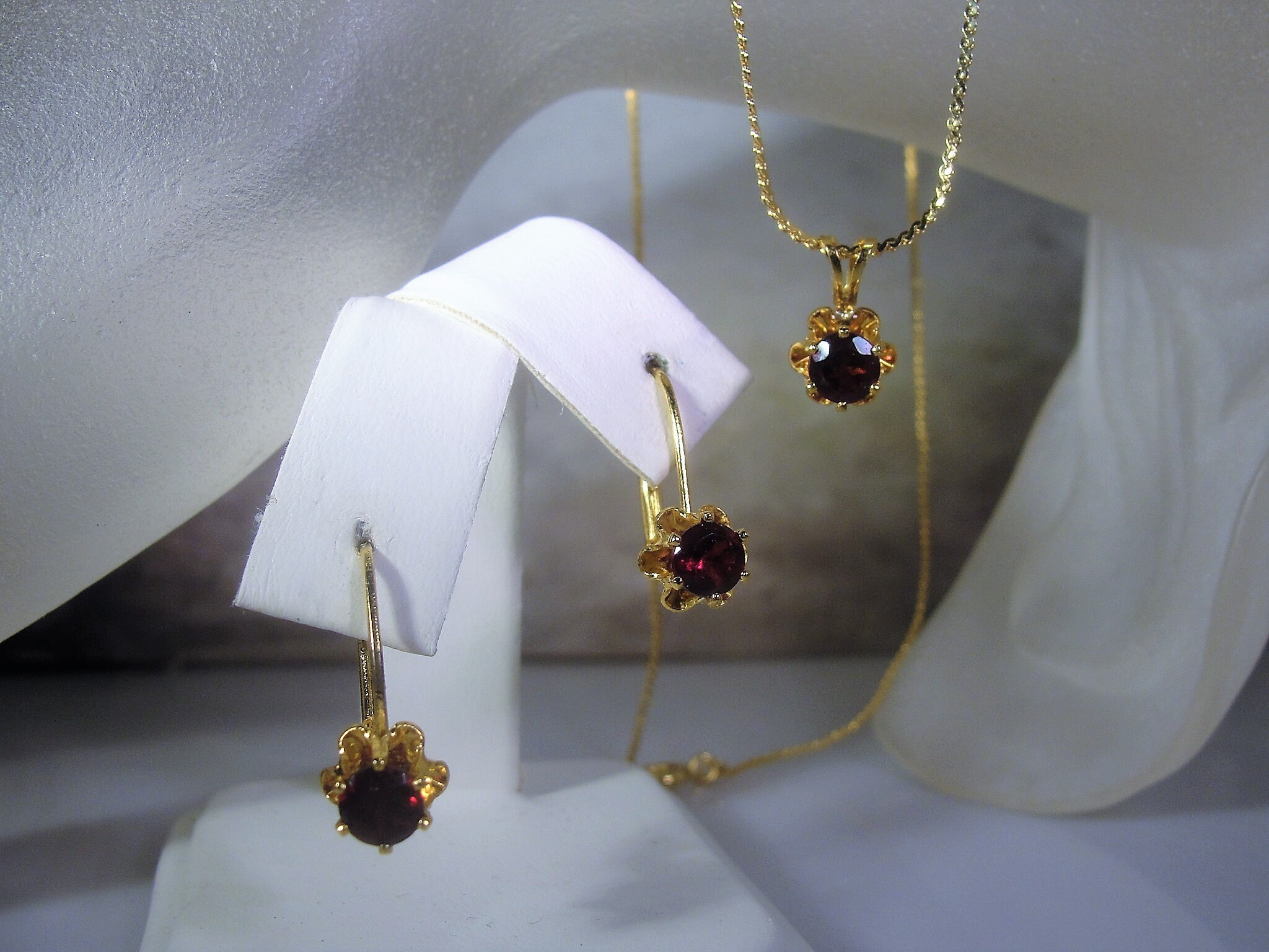 This is a lovely genuine Garnet Necklace and Earrings Set. The necklace has a solitaire round garnet gem that is set in a Buttercup Belcher Setting. It has a nice Cable Chain that measures 16 inches in length. The earrings are lever back earrings made for pierced ears. They too have a lovely Buttercup Belcher Setting. Just a lovely gold plated Garnet Jewelry set for the special January birthday girl or for that special person that love the garnet gem. These garnet have quite a bit of purple in them and are very close to a Rhodolite garnet. The color is deep and rich!