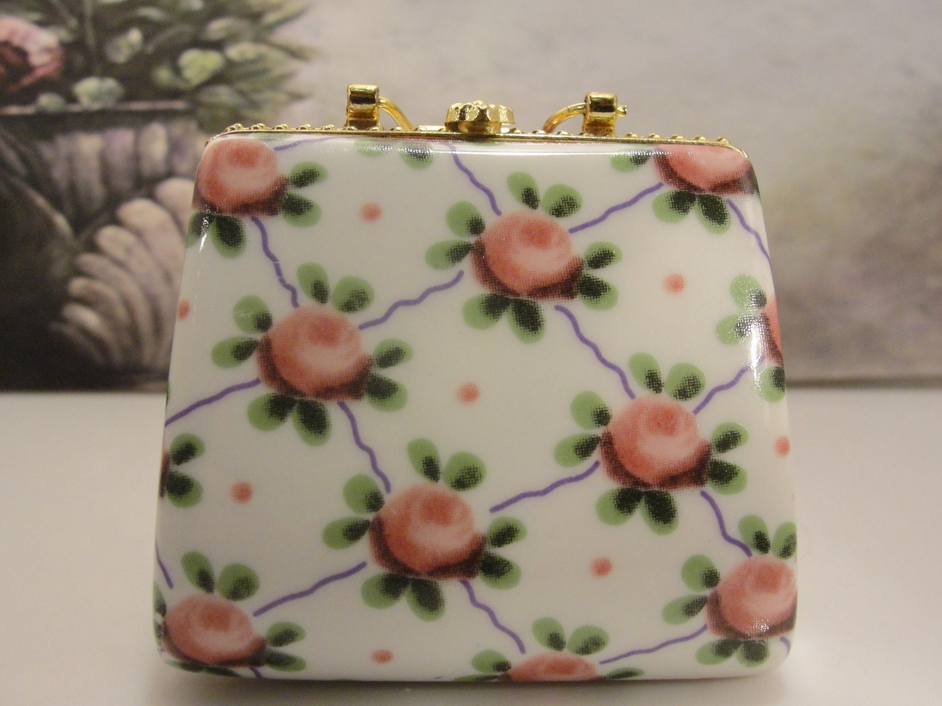 This is a very pretty porcelain Trinket Box that is a petite purse with lovely pink roses on both sides of the purse. The roses appear to be transfer prints and not hand painted. This purse measures 2 1/8 inches in height and 1.5 inches in width. It can easily accommodate a variety of small jewelry accessories or other small objects. It is also the perfect size for a pill box as well. Simply slip it in your purse when you venture out.