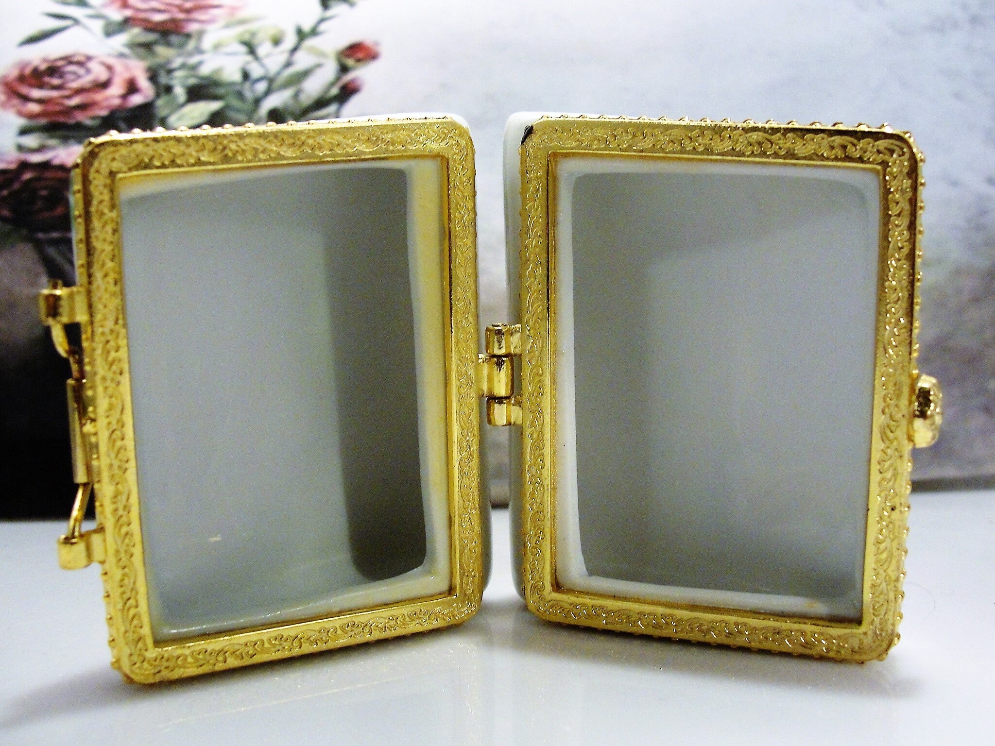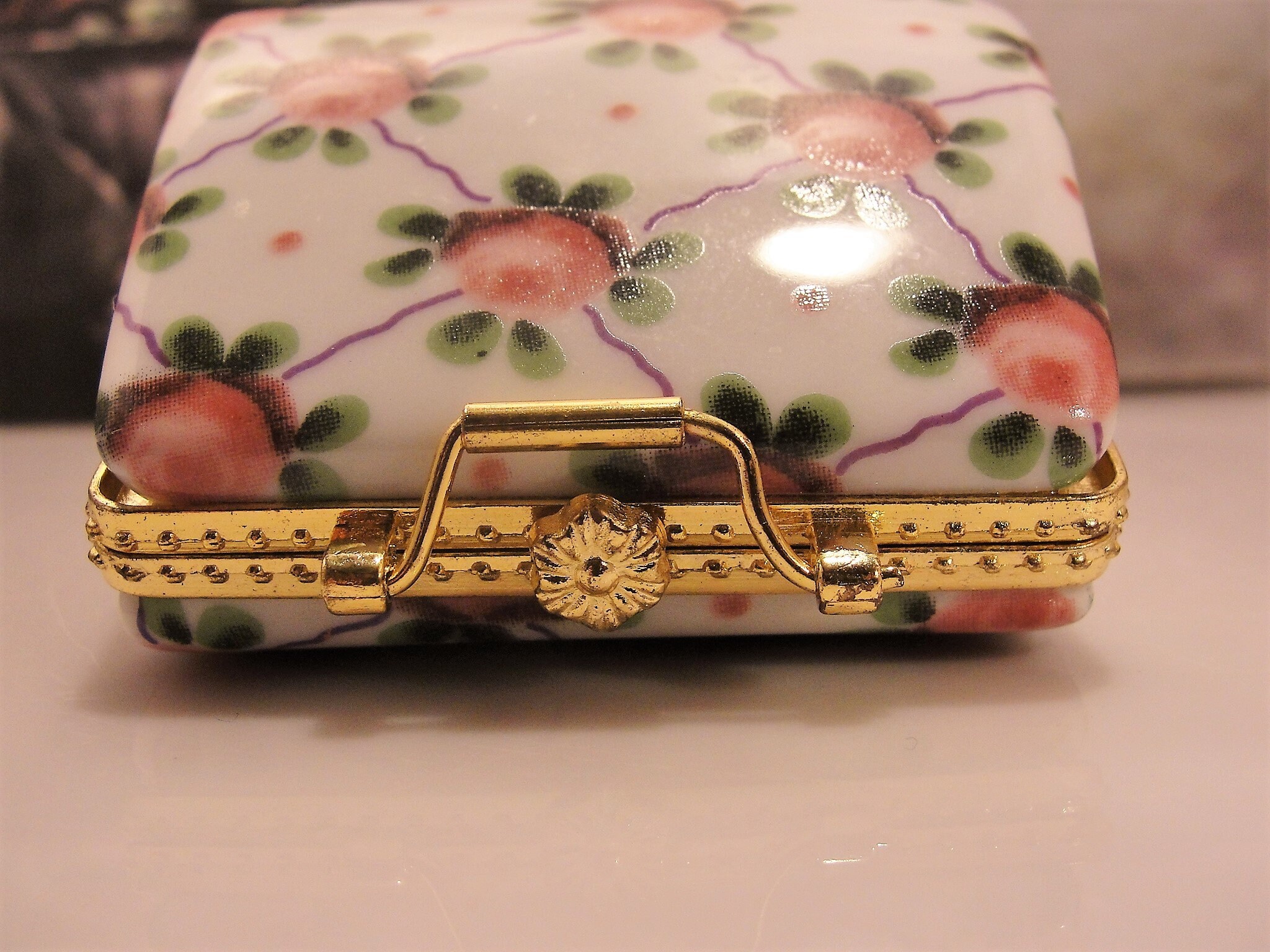 A beautiful petite Trinket Box with a Porcelain Rose Floral motif outside and gold gilt is handles and frame. It has a nice snap shut closure and a little handle that does move up and down. This item is a collectible treasure! This item is in “Like New” Condition, however there is no box or original packaging, it is strictly the porcelain purse.