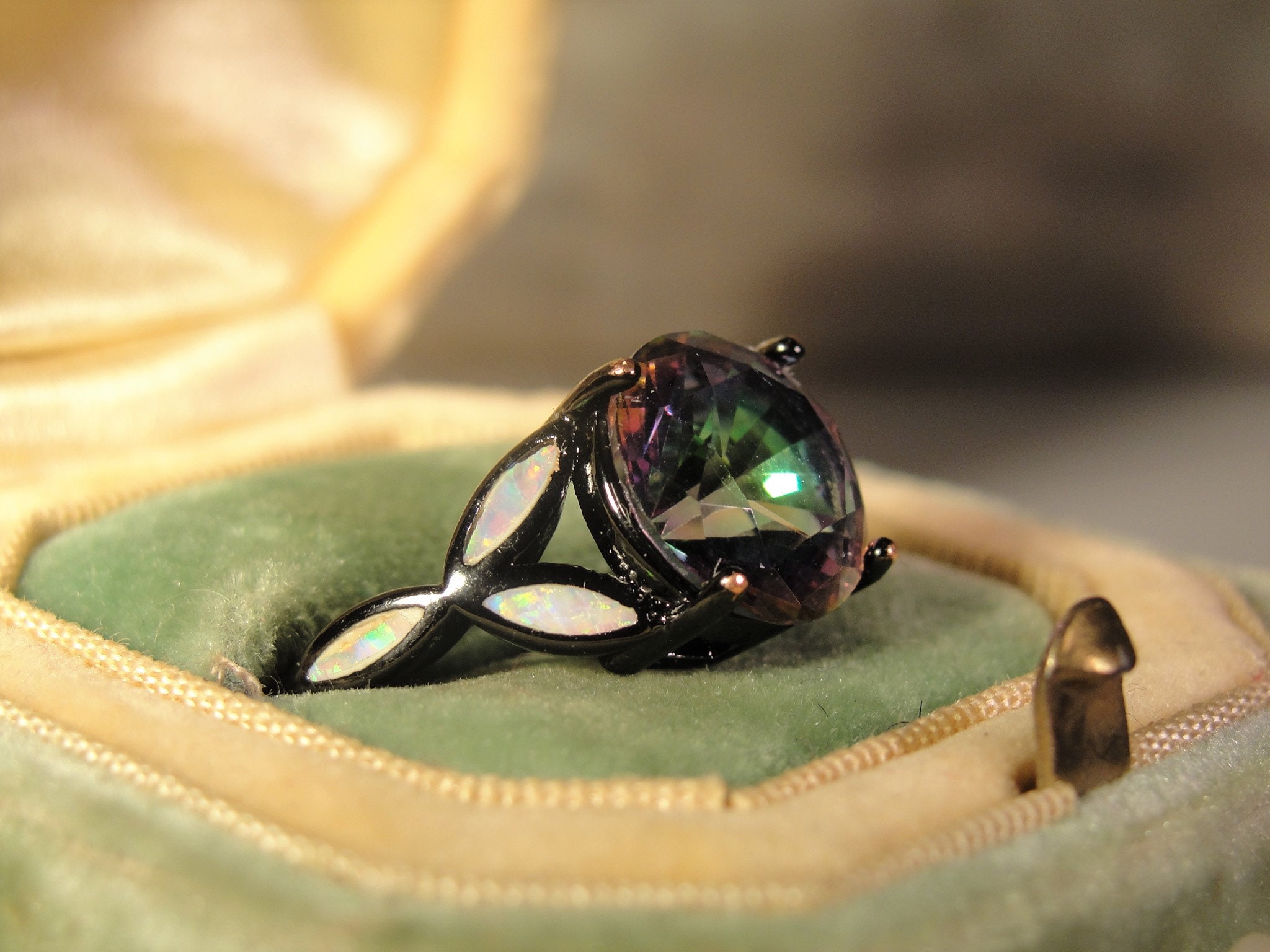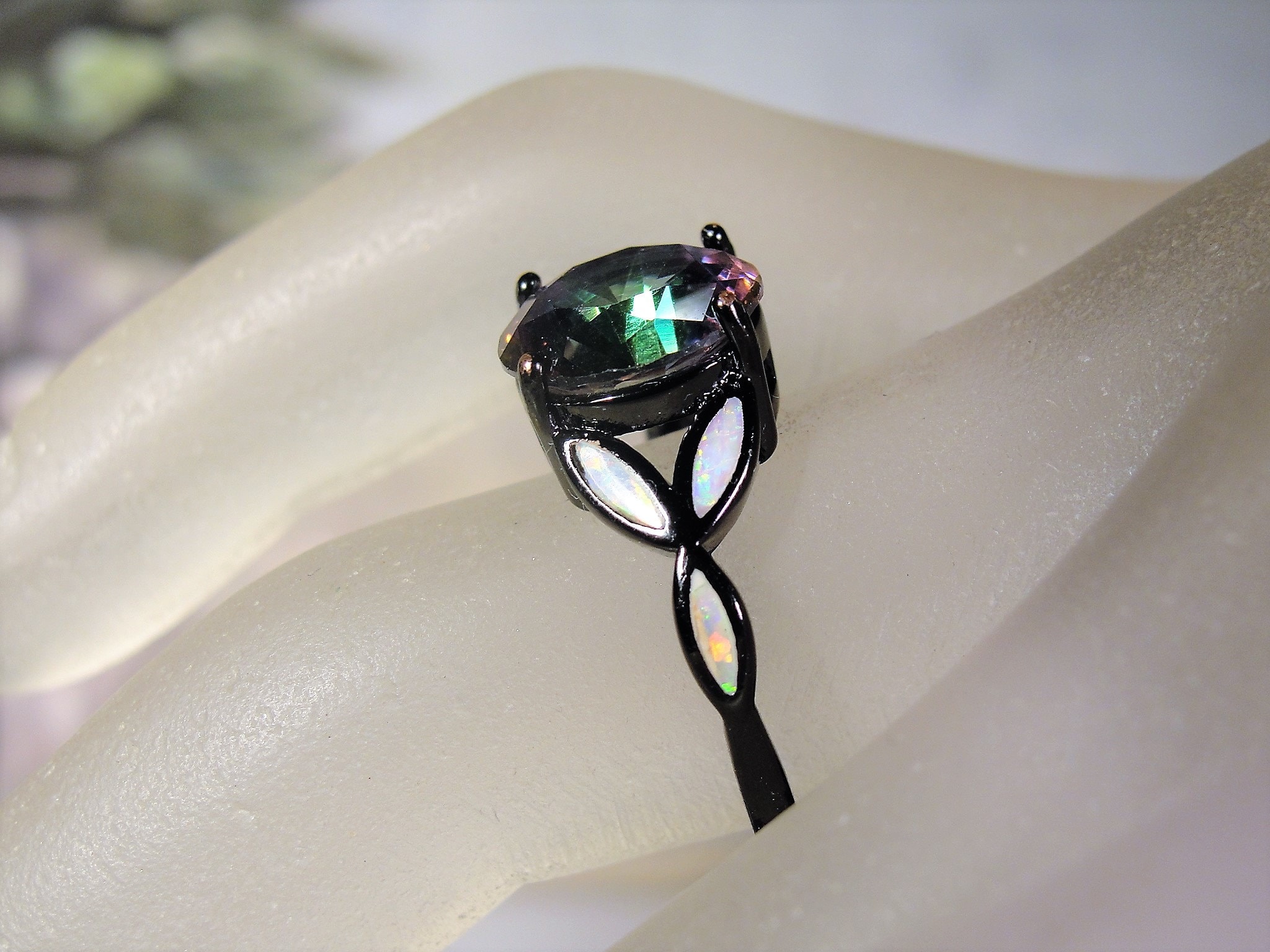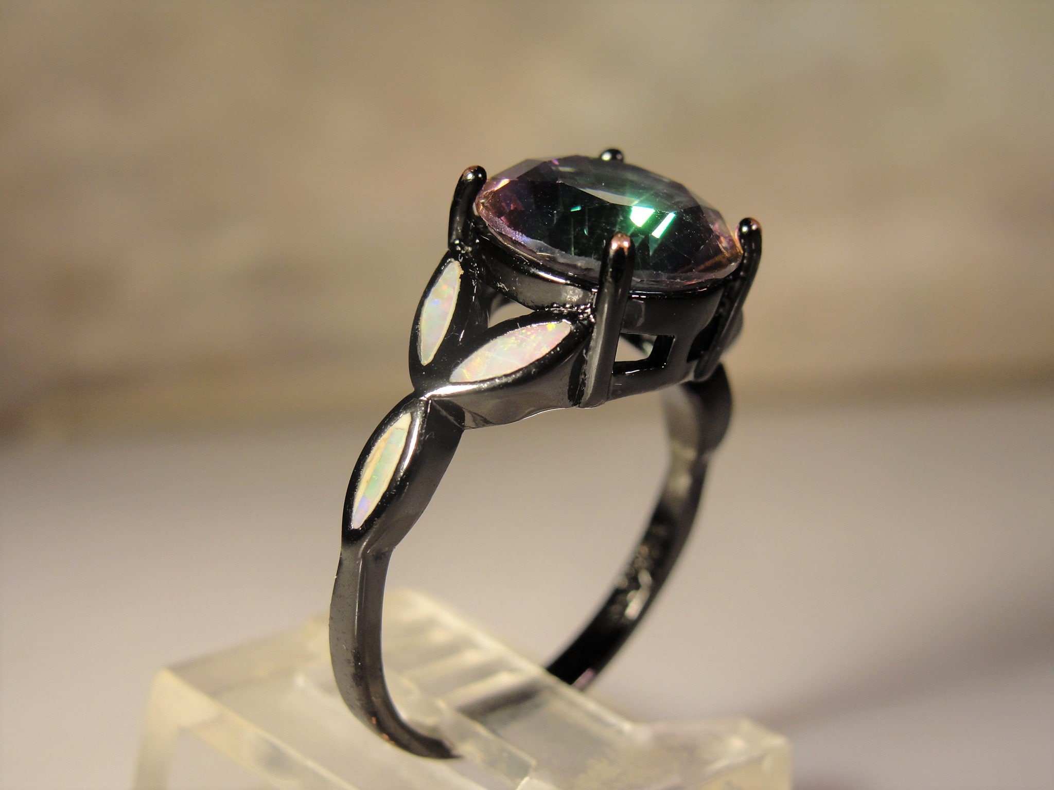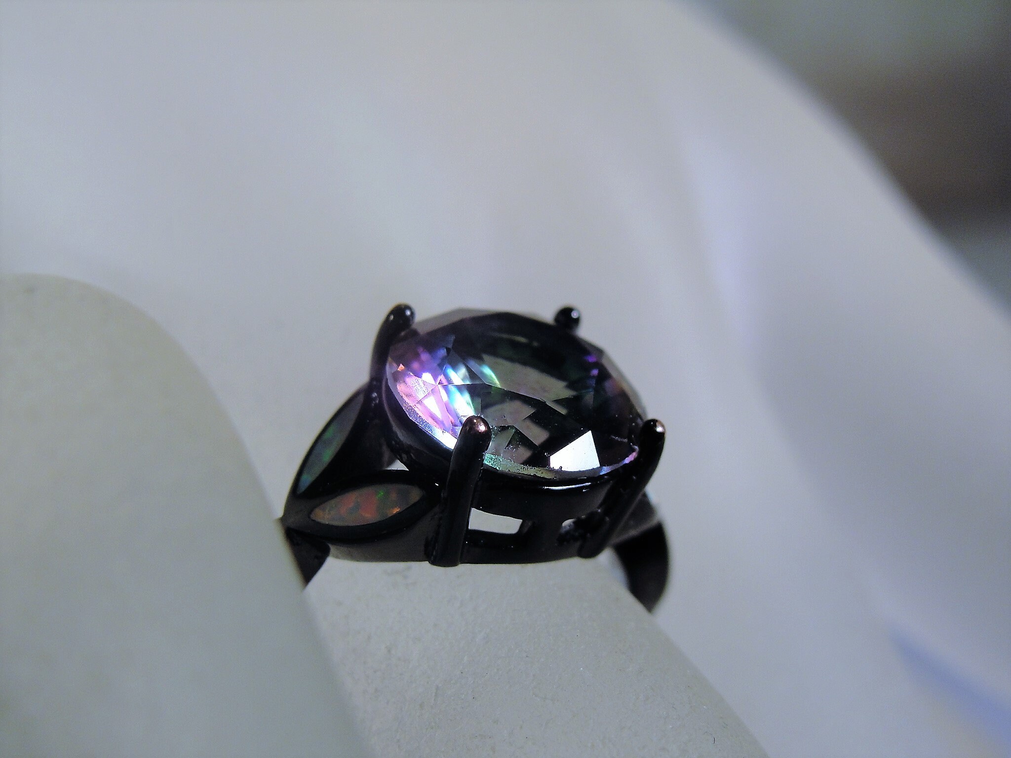 • Gem Information: The Mystic Topaz is Synthetic, with beautiful coloring. Size of the gem is approximately 3.5 Carats; The Opal Inlay are slivers of Genuine Opals with lots of fire!
