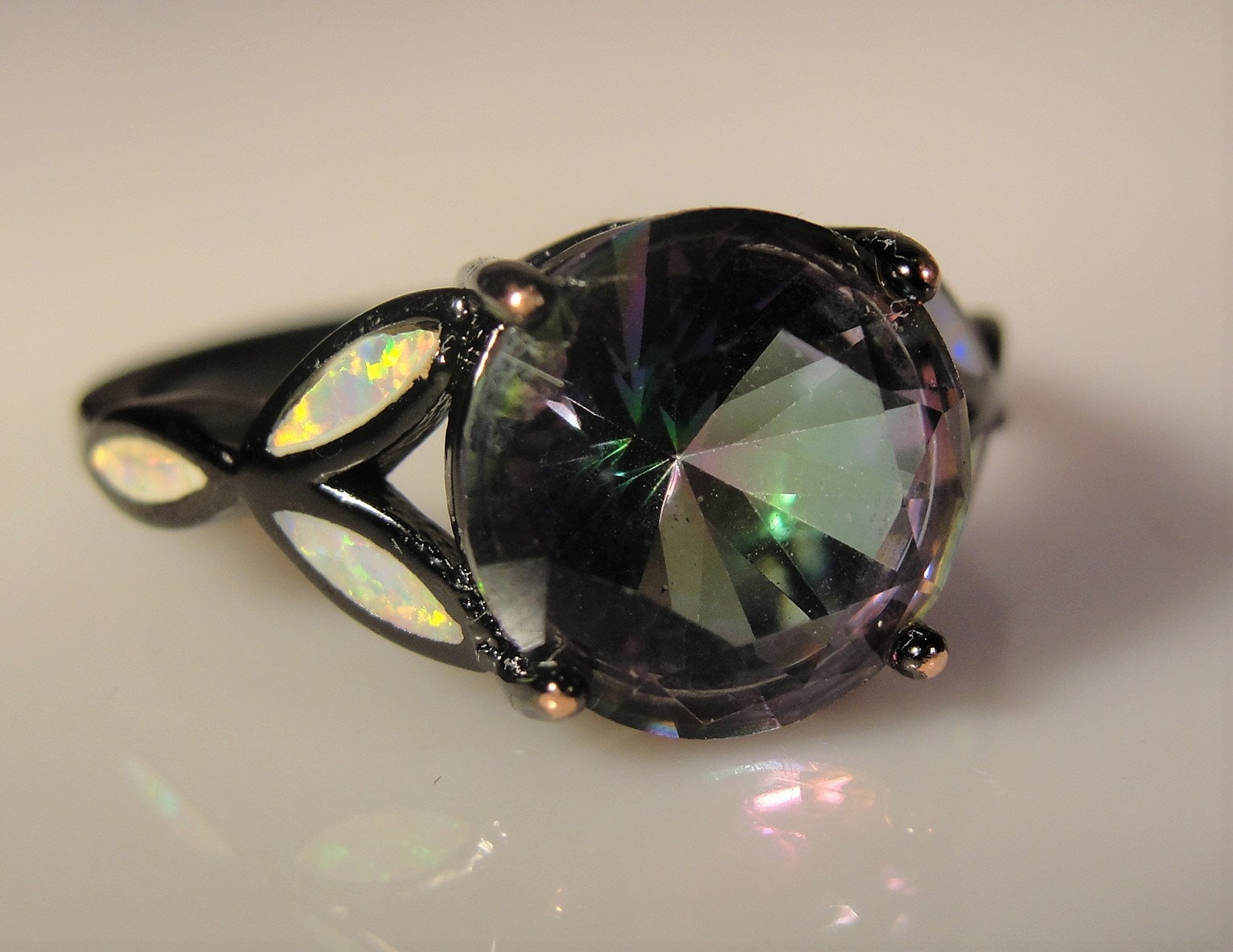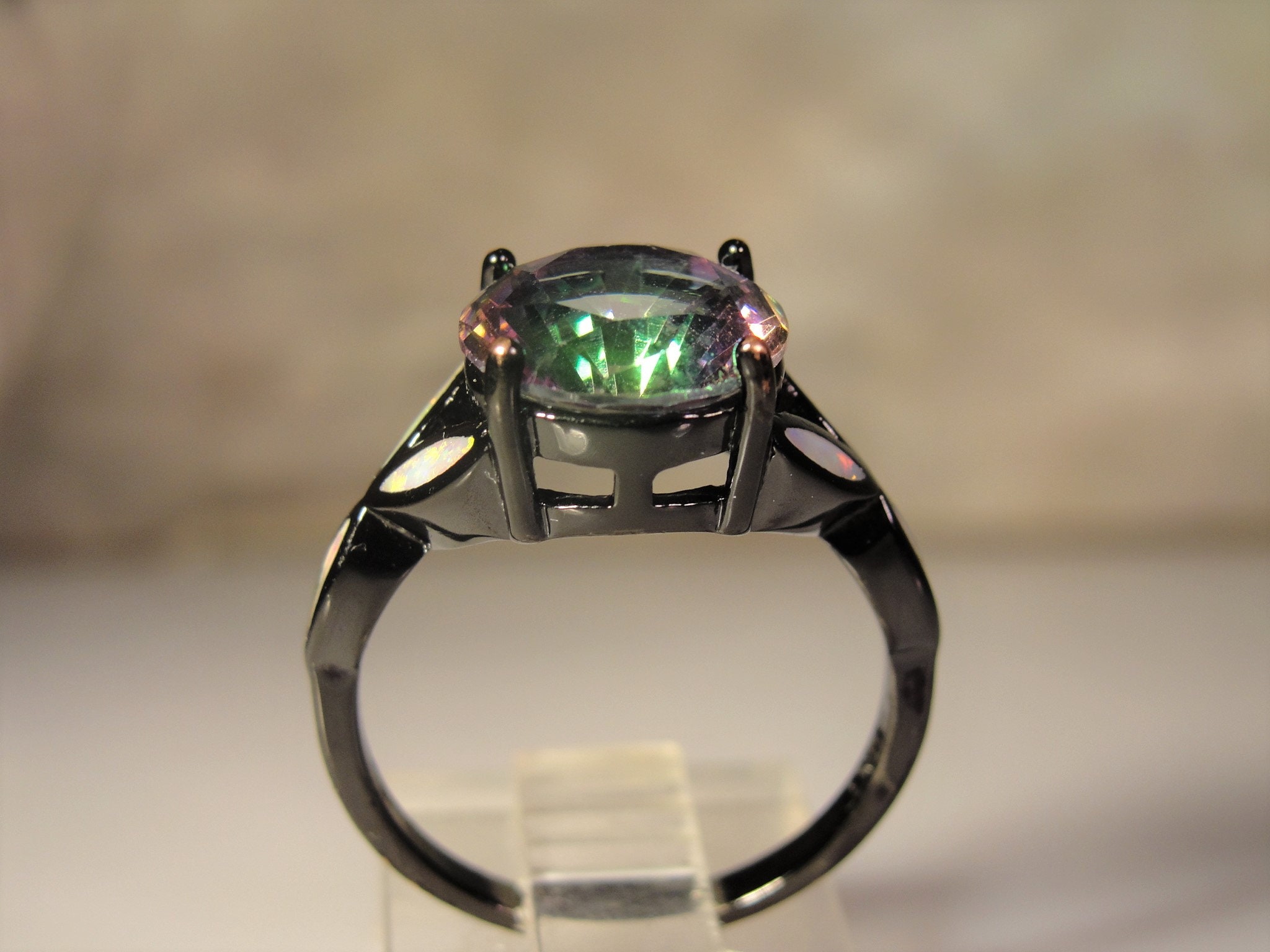 This is a very striking Gunmetal Rhodium Plated Mystic Topaz Ring that has Opal Inlay slivers at the shoulders of the ring. This Mystic Topaz is registering as a Synthetic Gem, however the Opal Inlay appears to be genuine opals. The base metal of this ring is 10K Yellow Gold with Gunmetal Rhodium Plating over it. The Mystic Topaz measures 9.8mm in diameter which gives this gem an approximately Carat Weight of 3.25 carats. This ring provides a very striking presentation and is certain to garnish compliments!