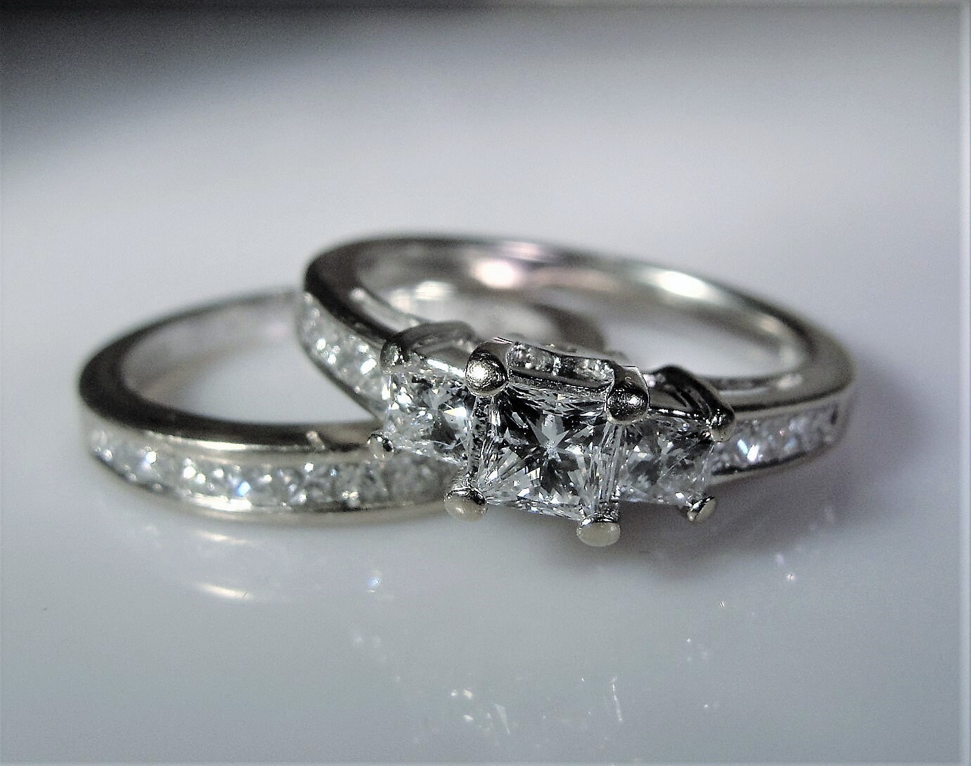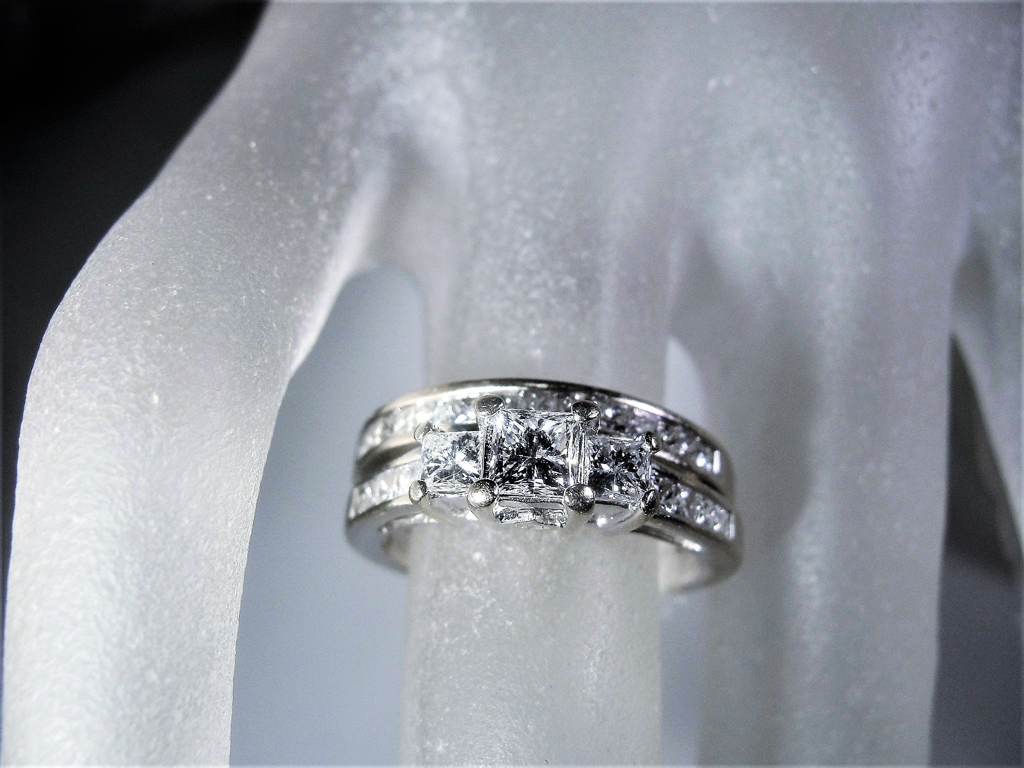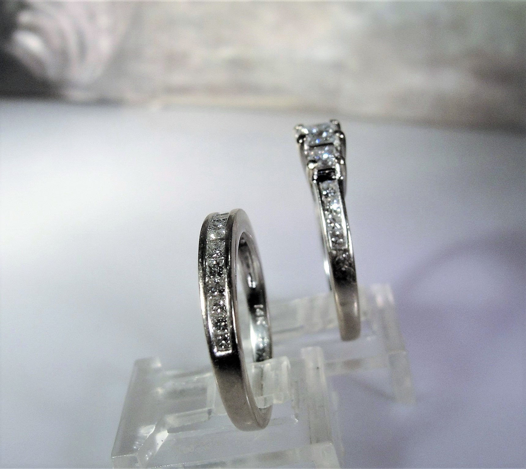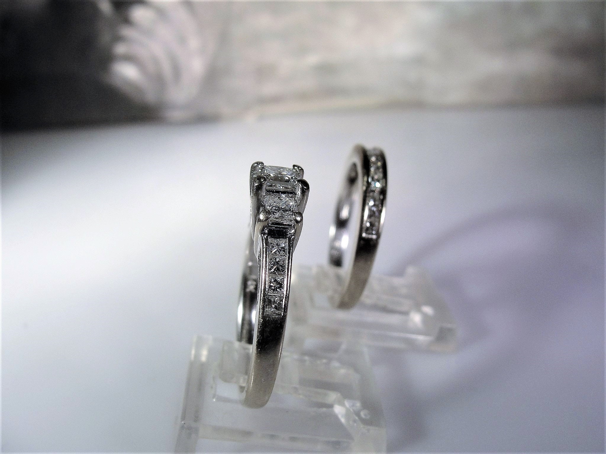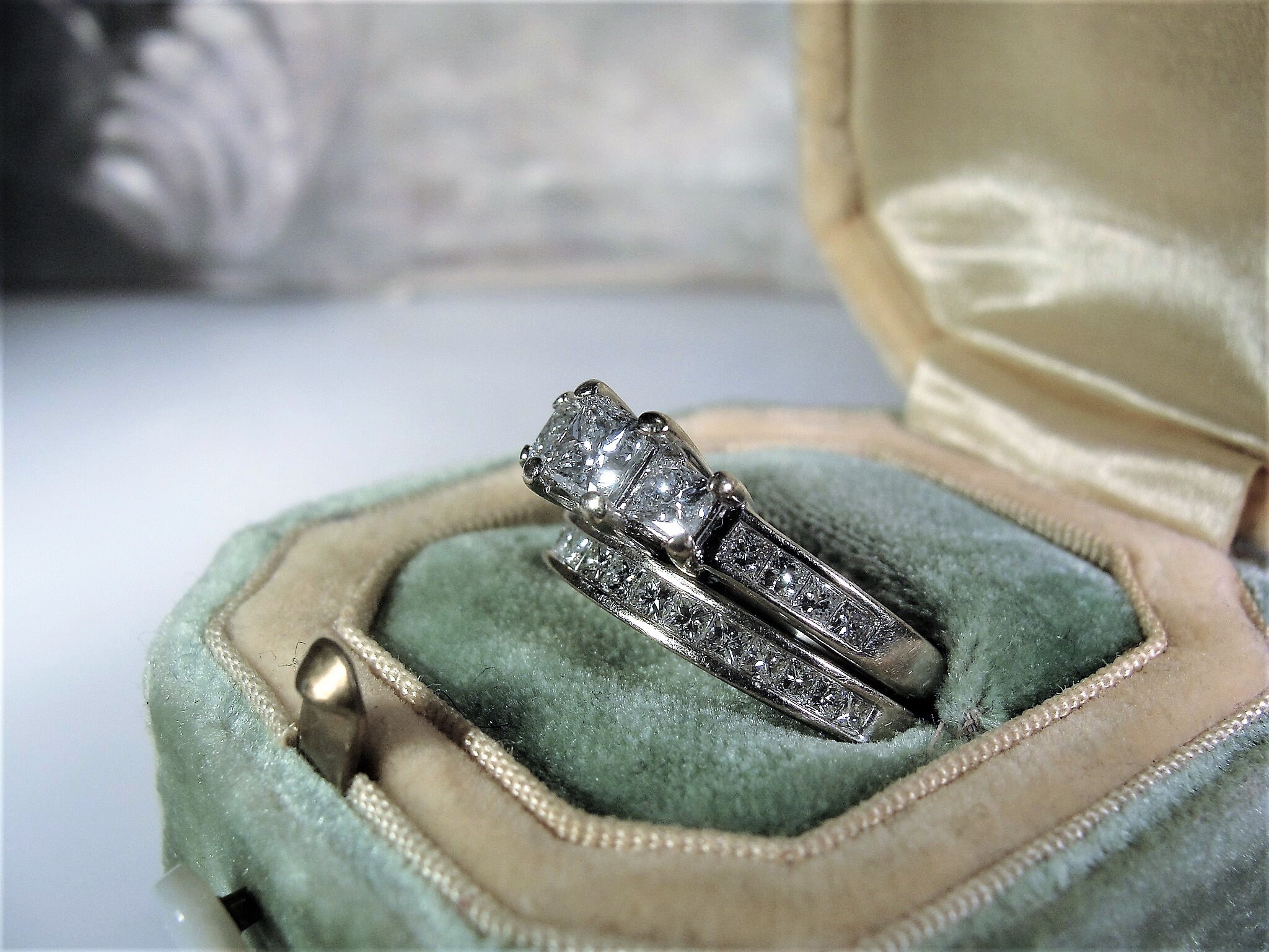 This is a beautiful bridal ring set that consists a Trilogy Style Engagement Ring and Eternity Style Wedding Band set in 14K White Gold Mountings. These rings are a matched set and look beautiful together. Both rings have square Princess Cut Diamonds that are within the Trilogy Setting of the Engagement Ring and Channel set into the Wedding Band. A very classic look that is simply timeless and gorgeous every day!!