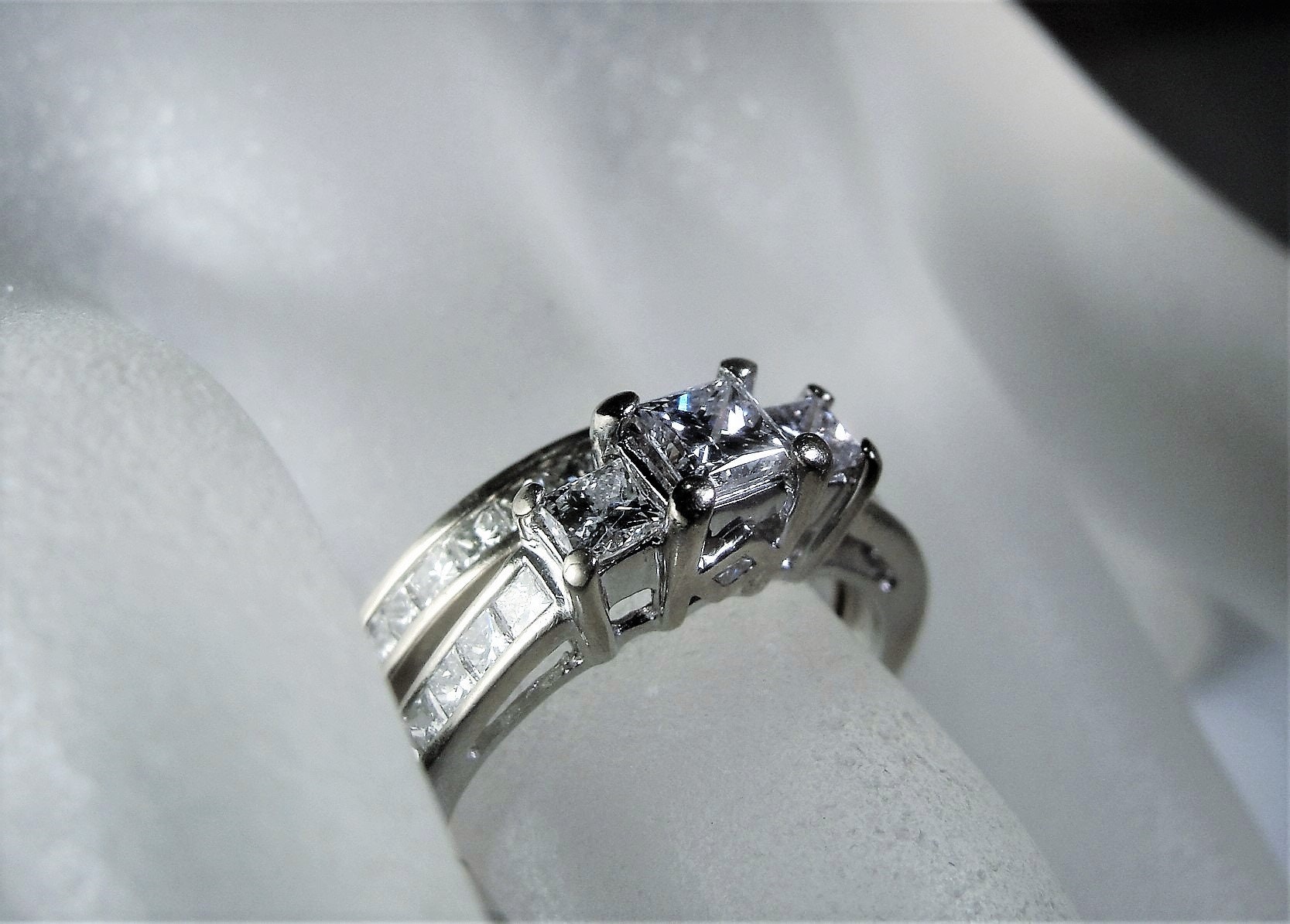 • Gem Info: All diamonds are genuine diamonds mined from the earth; All diamonds are Square Princess Cut Diamonds; Center Diamond is 1/3 of a carat (.34pts) and the side diamonds total .30pts; Quality of the diamonds are “VS” for the center diamonds and all others range from “VS” to “SI” in quality; There are an additional 8 square diamonds that are pave set on the shoulders of the band and measure approximately 1.5mm each. Total carat weight is approximately .76 of a Carat (TCW)