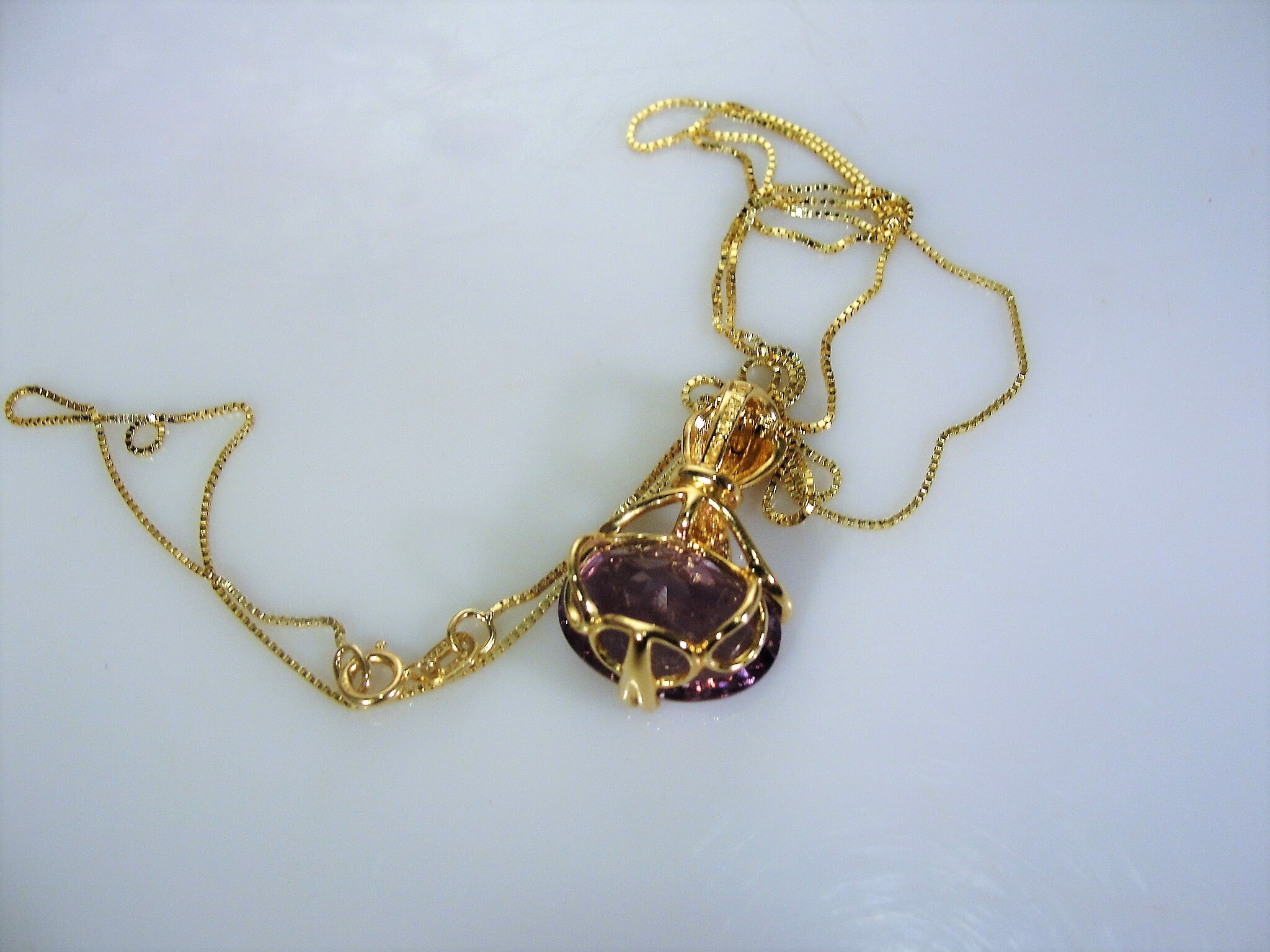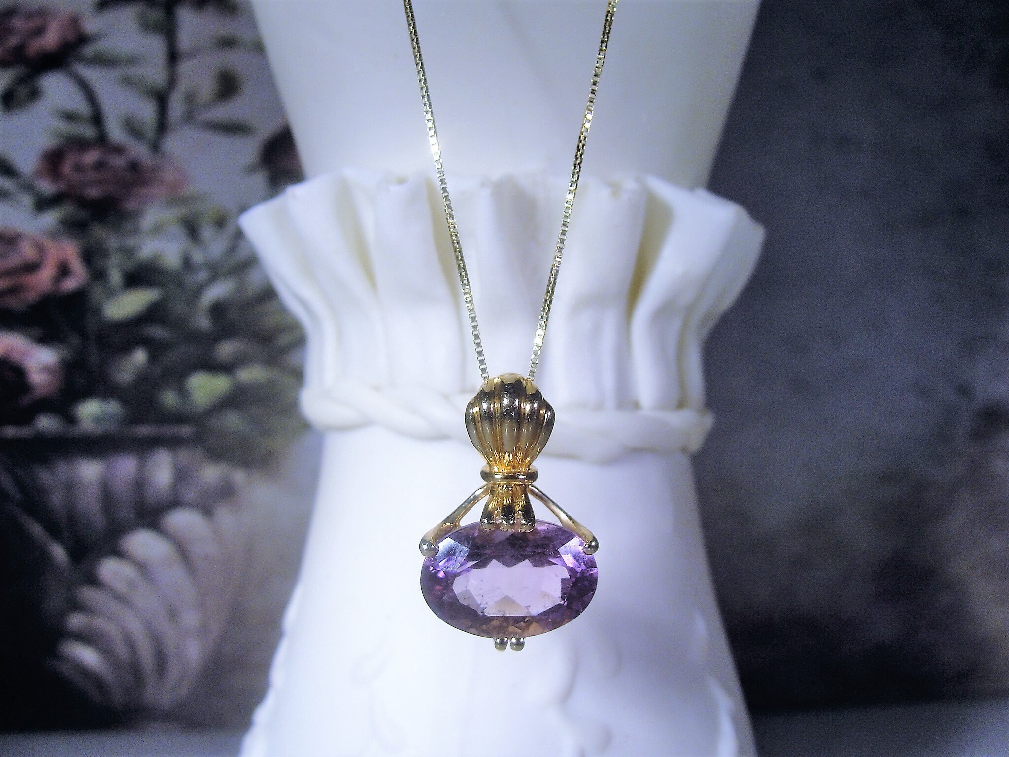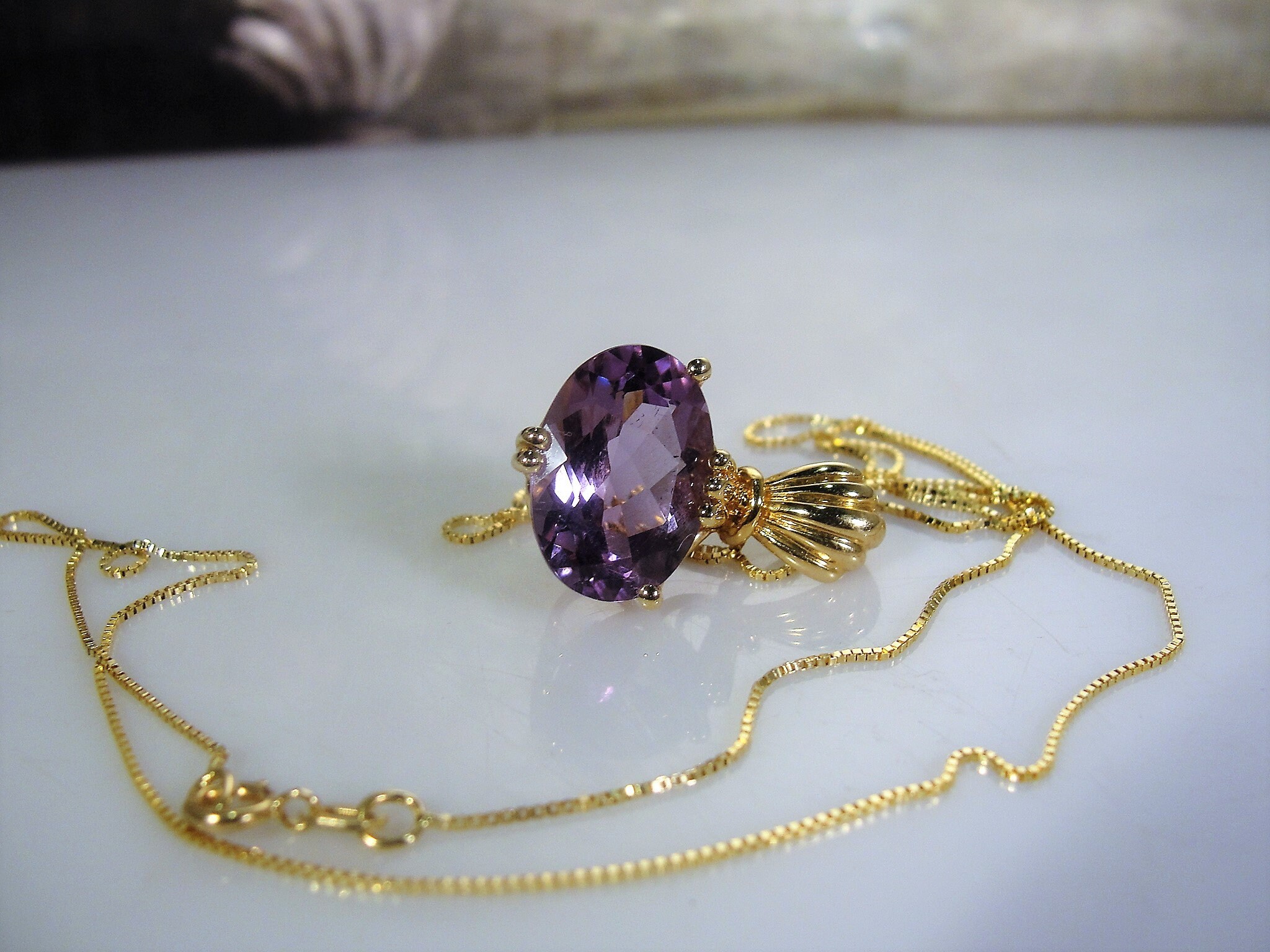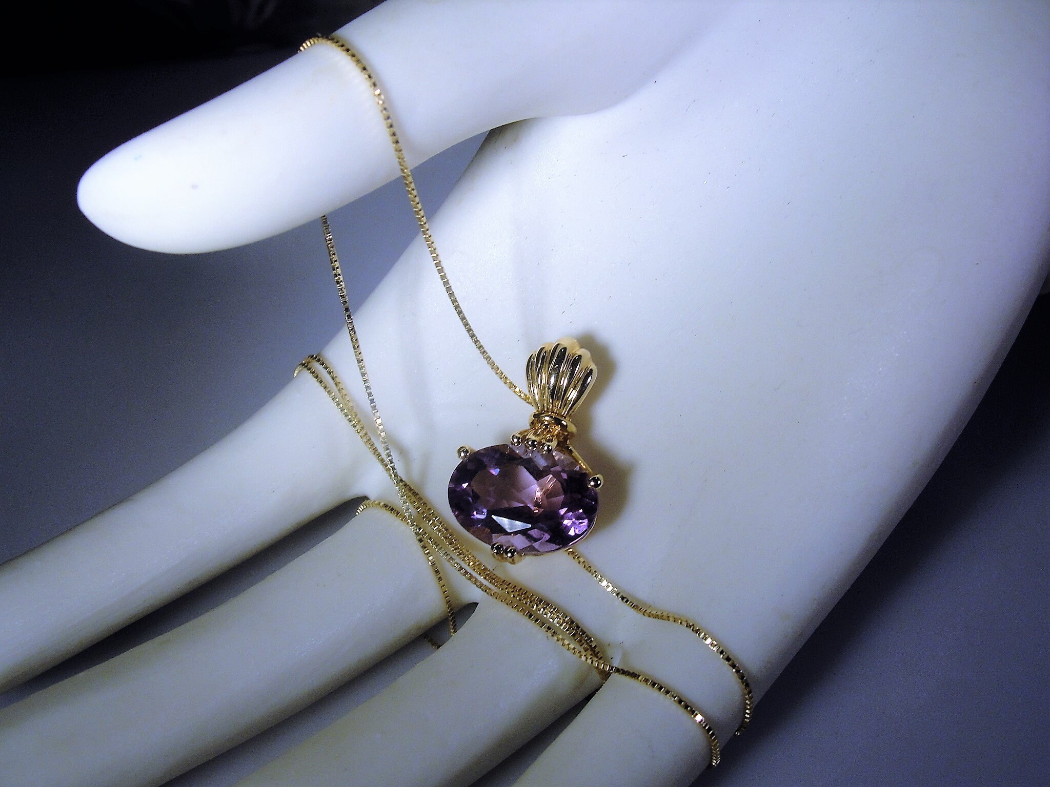 This is a gorgeous 3 Carat Purple Amethyst Necklace that is done in 14K Gold. This pendant has a nice intricate basket setting with 4 prongs to hold this beautiful Amethyst Gem securely in place. The color of the Amethyst is a medium purple with flashes of lighter purple. Just a stunning presentation when worn. The bail is a wonderful shell shaped bail that enhances the richness of the mounting. The prongs are placed in such a way that they become part of the Art Deco Motif of this pendant. The Gem is an oval faceted genuine Amethyst that is set sideways in the mounting. Just beautifully made and a lovely nice weighted 20 inch chain is also provided with this necklace.
