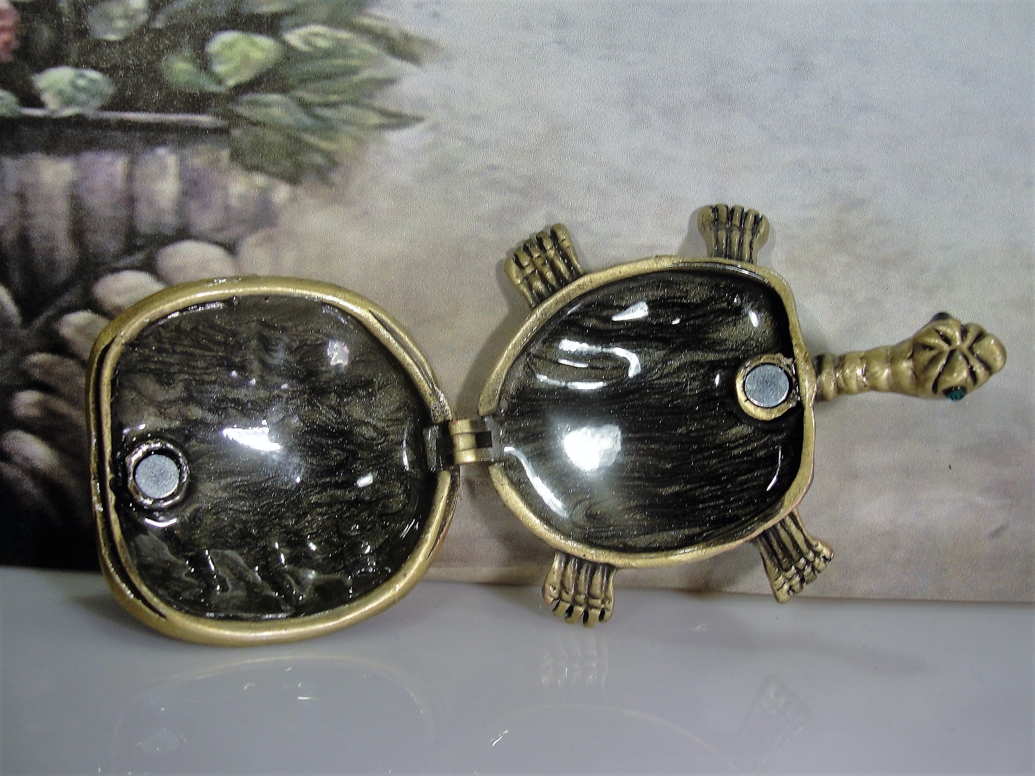 This is just the cutest little rhinestone turtle trinket box. It is brass with a rhinestone encrusted shell and green enamel Accents within the tiles of the turtle’s shell. It has bright green rhinestone eyes. On the inside of the shell is a dark grey enamel coating where you can place your rings for safe keeping. There is also a magnet closure so that it closes securely. Just a wonderful trinket box to add to any collection or a super night stand accessory where you can remove your jewelry just prior to sleep.