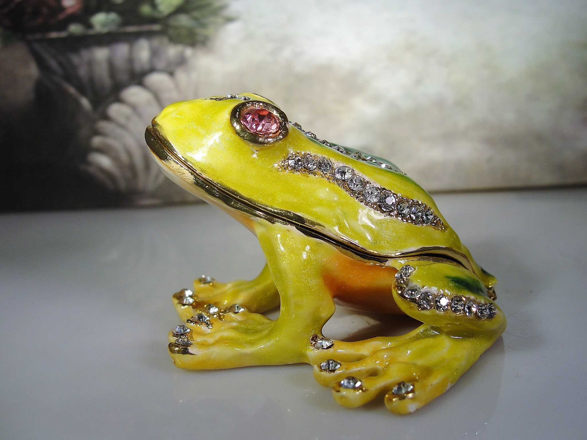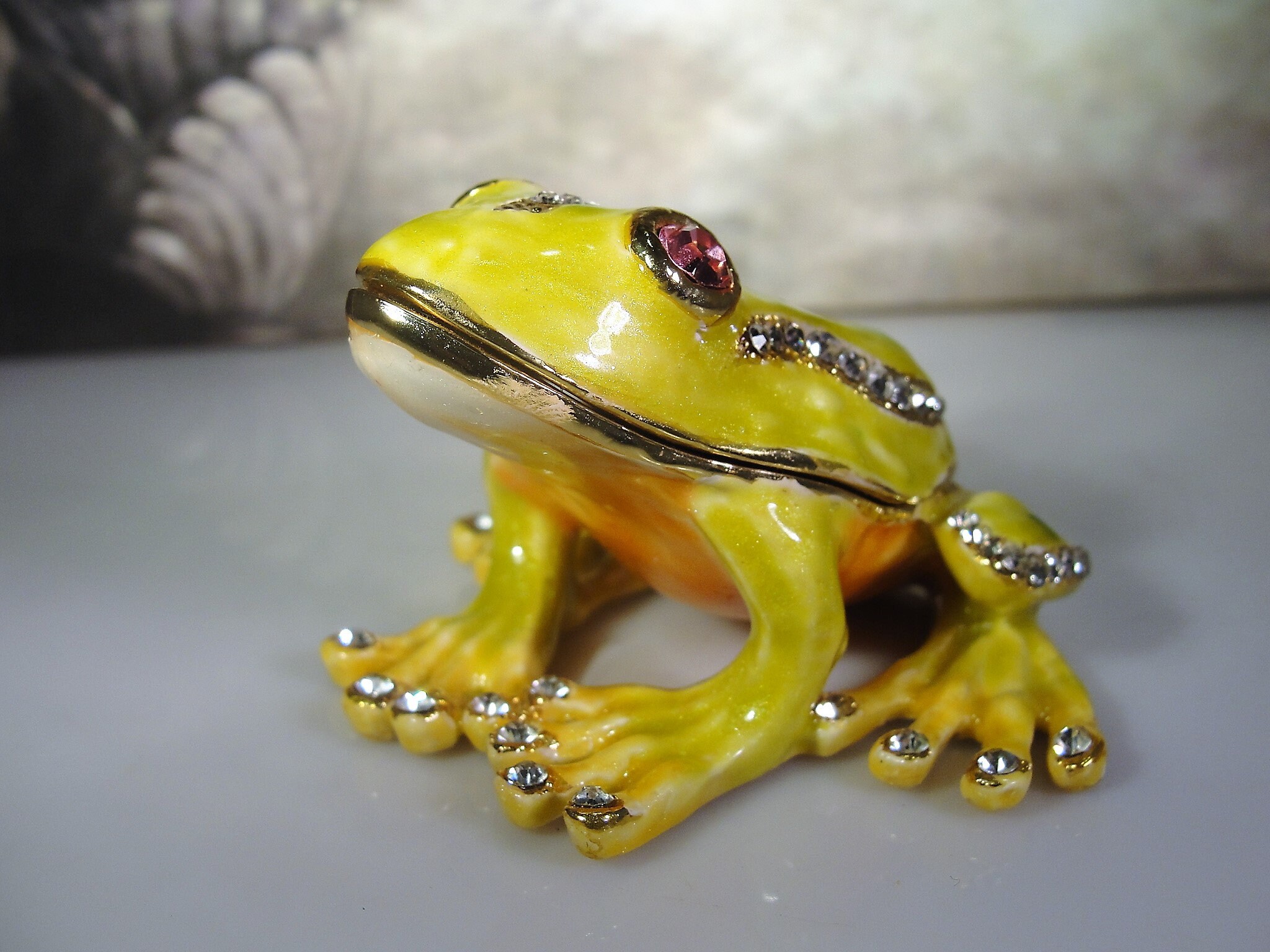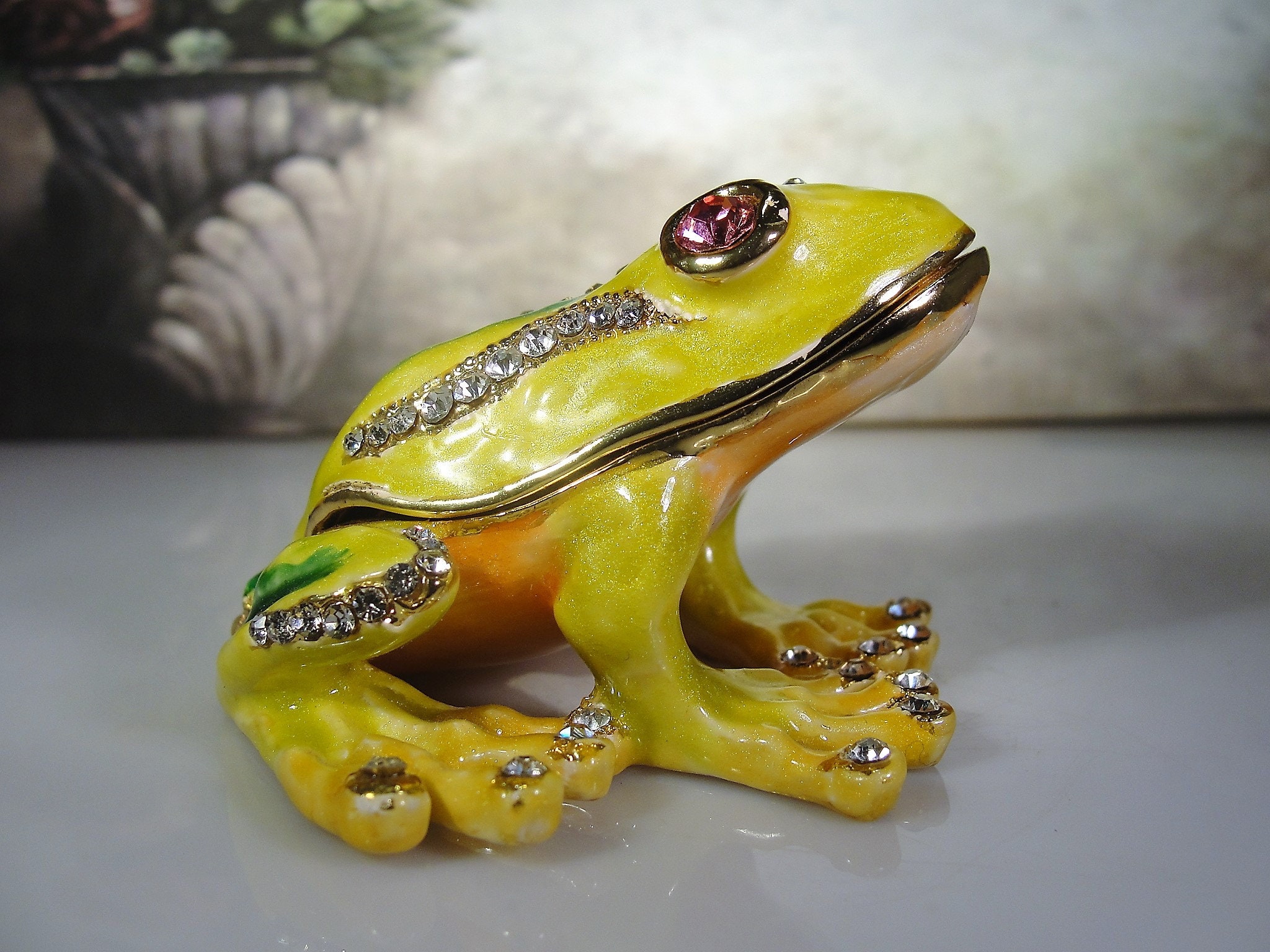 The frog is a nice bright yellow and green metallic color with clear round rhinestones that accent the design work on his back. His eyes are large pink rhinestones and his feet and stomach are a shiny gold tone metal and shaded coloring of pink and orange. The cutest thing about this little frog trinket box is that he has sparkly rhinestone finger nails and toe nails. It just makes the piece!! So Cute!!