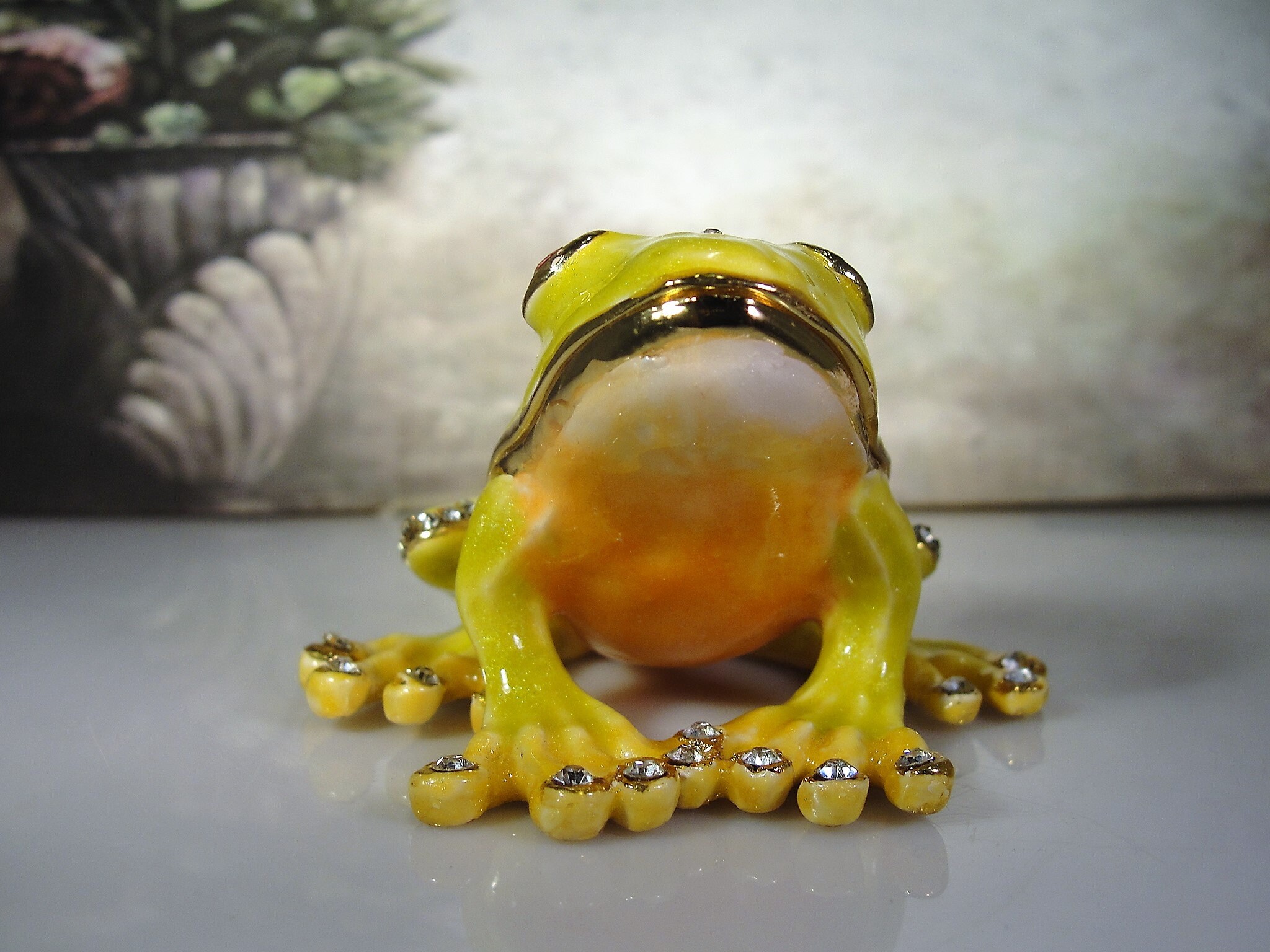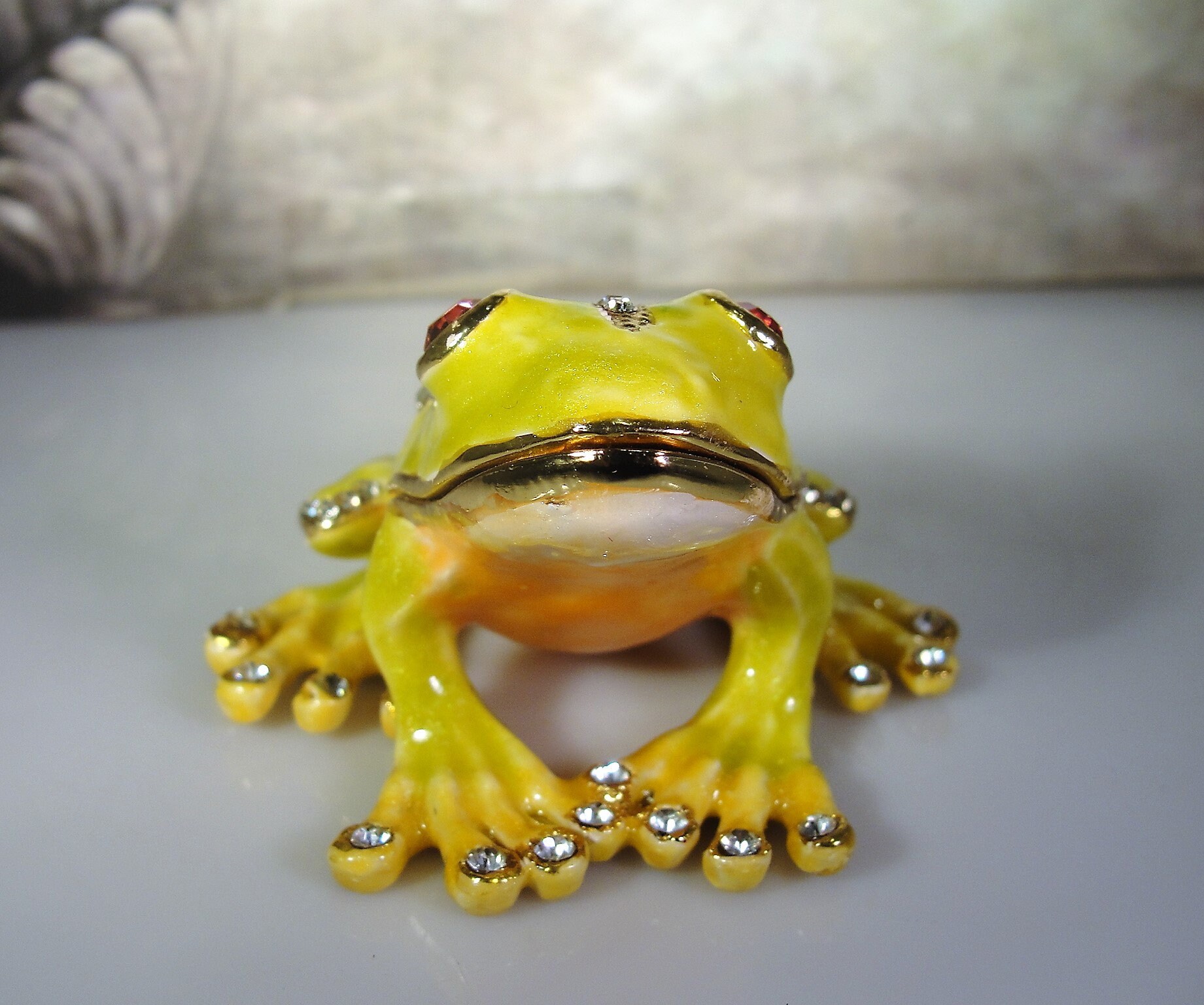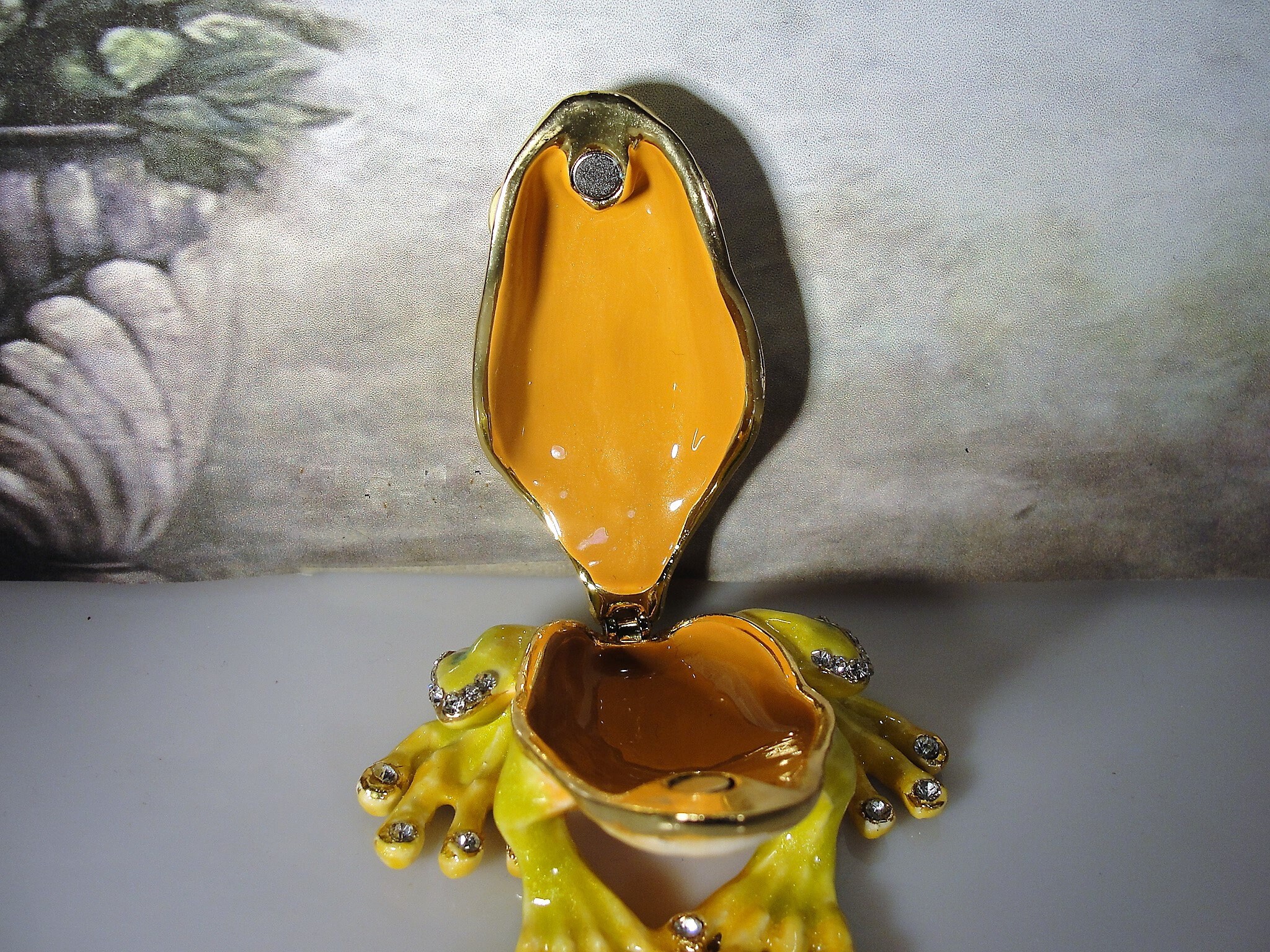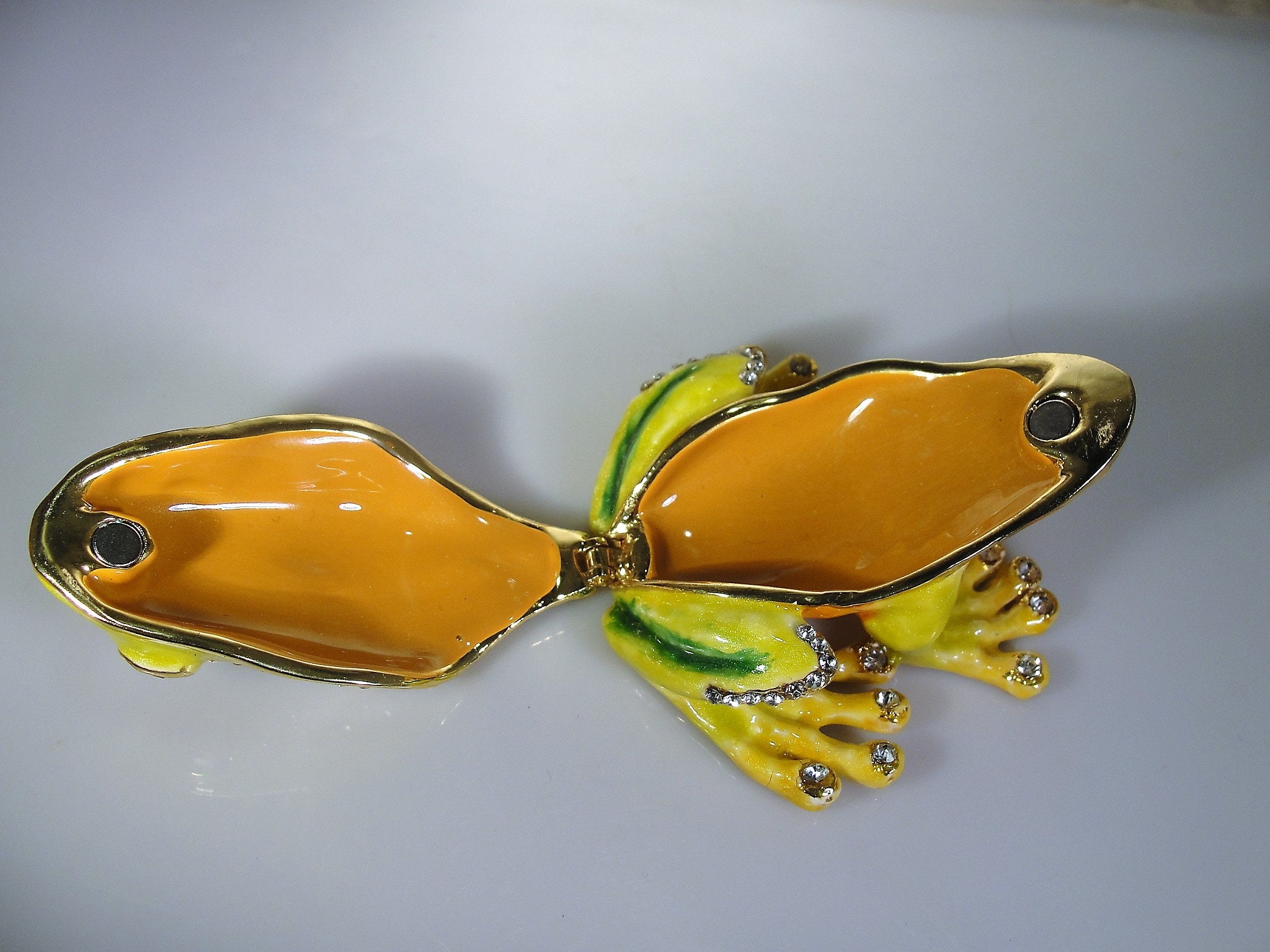 Inside the trinket box it has orange gold metallic enamel with a magnetic lock. Very fun and a great addition to any collection! Just a great little frog trinket box.