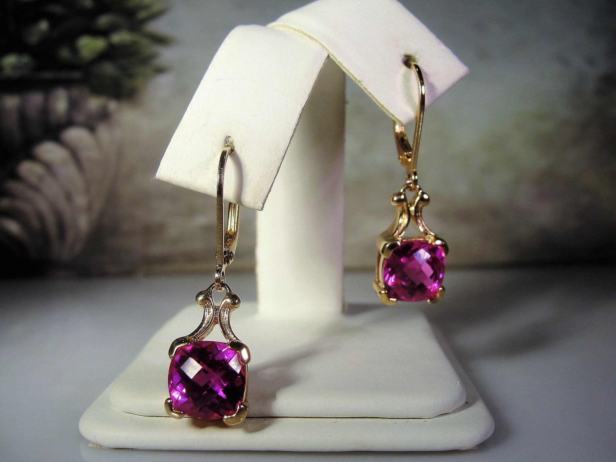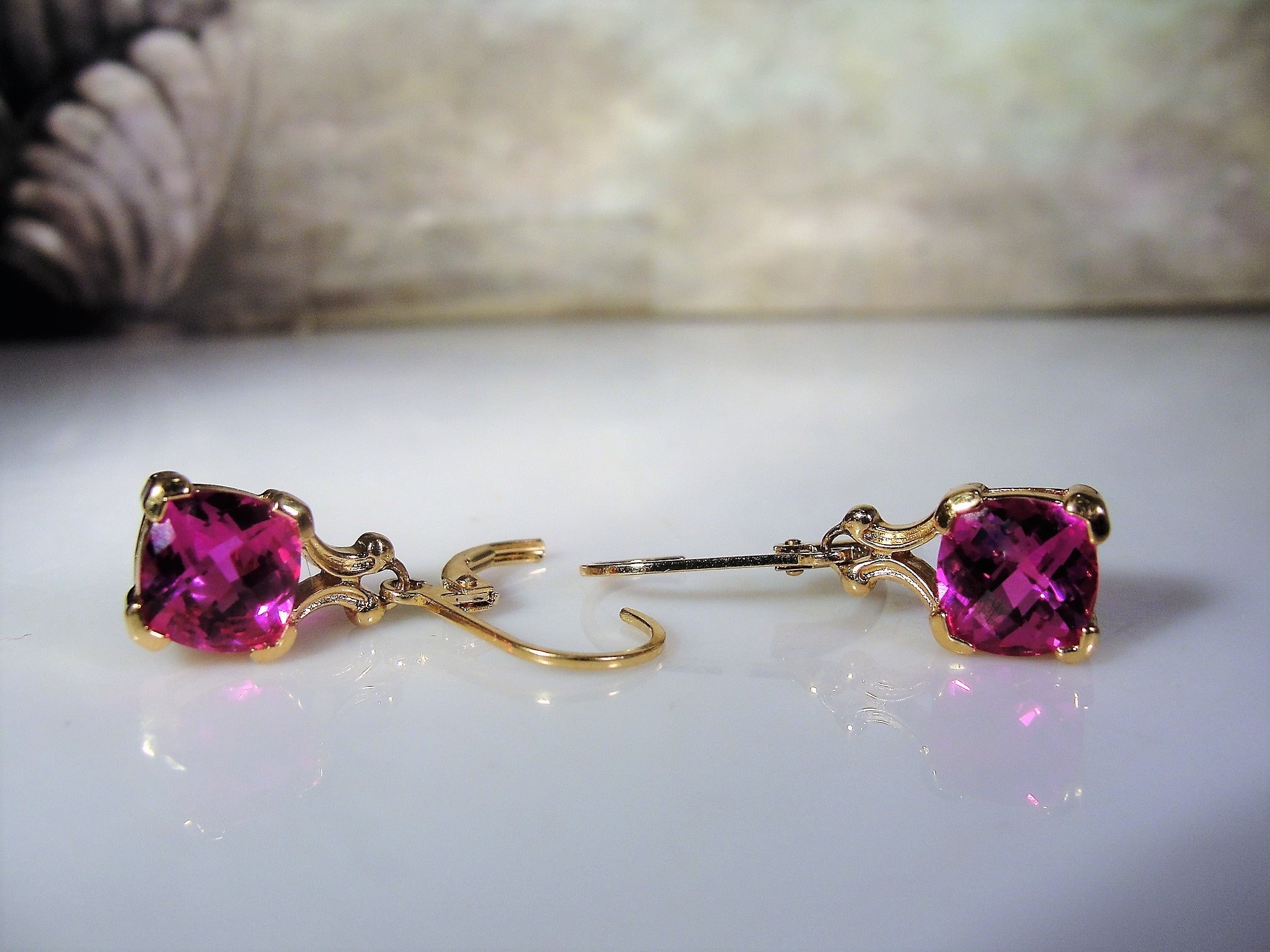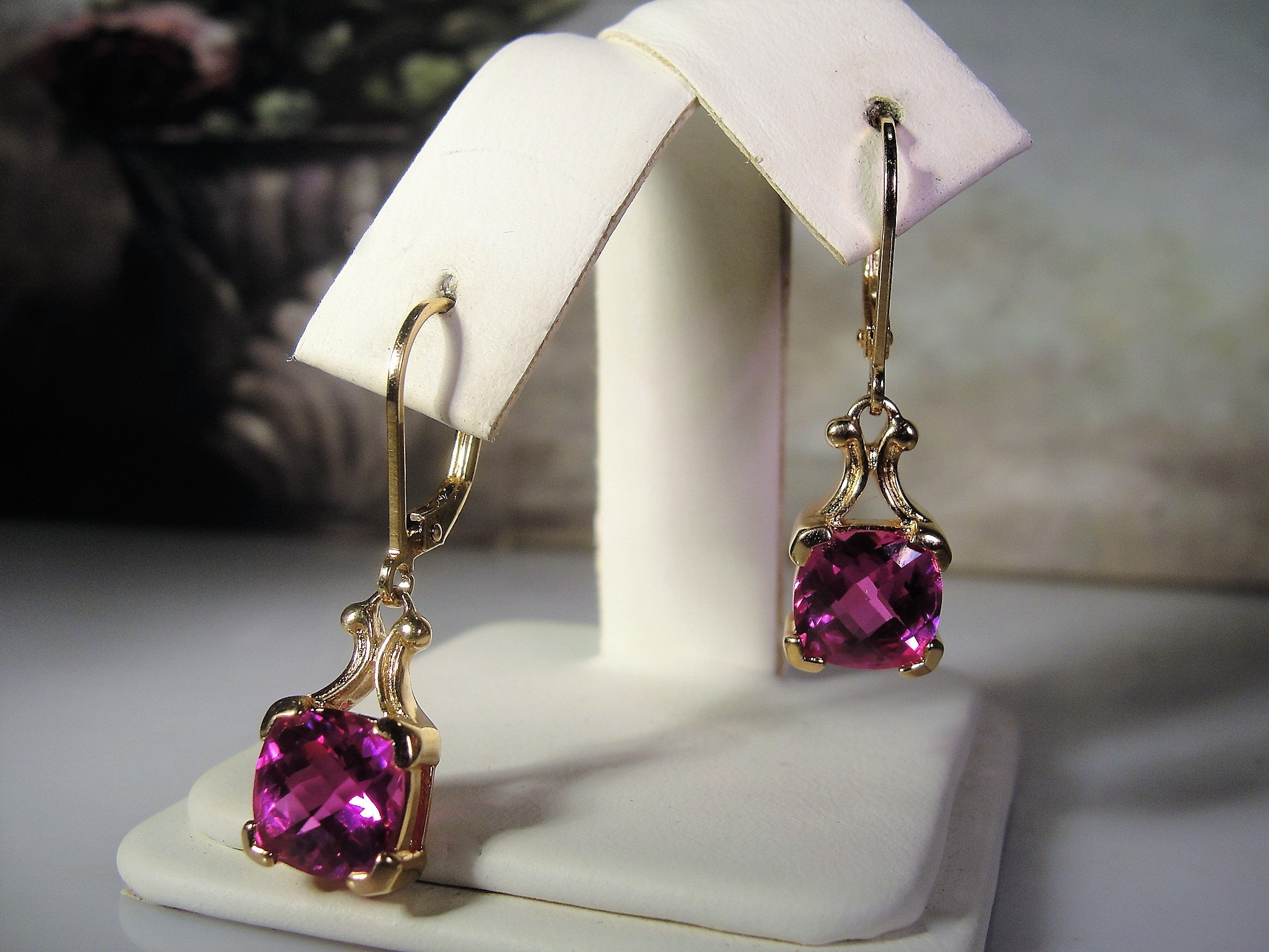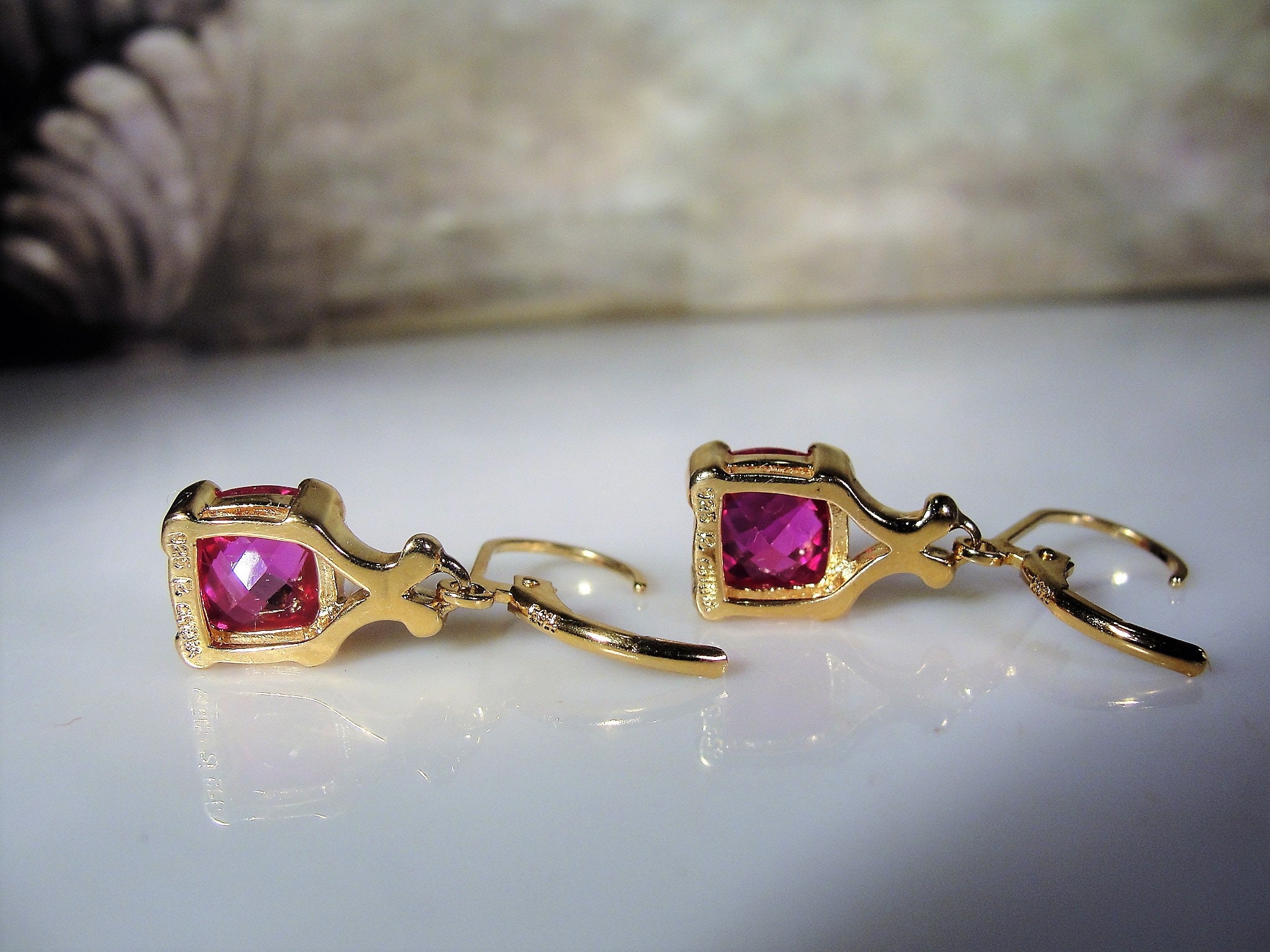 This is a very striking Pink Sapphire Earrings that have a Cushion Cut Pink Sapphire Gem set in each earring. The earrings are made for pierced ears and are a drop dangle style earring. This earrings set is a Gold Vermeil Sterling Silver pair. The pink sapphires are lab created sapphires that are of high quality and they have a beautiful depth of ruby pink color. The Cushion Cut Style provides for each gem to pick up the light from a variety of different angles, giving the pink a variety of different hues… so very pretty!!