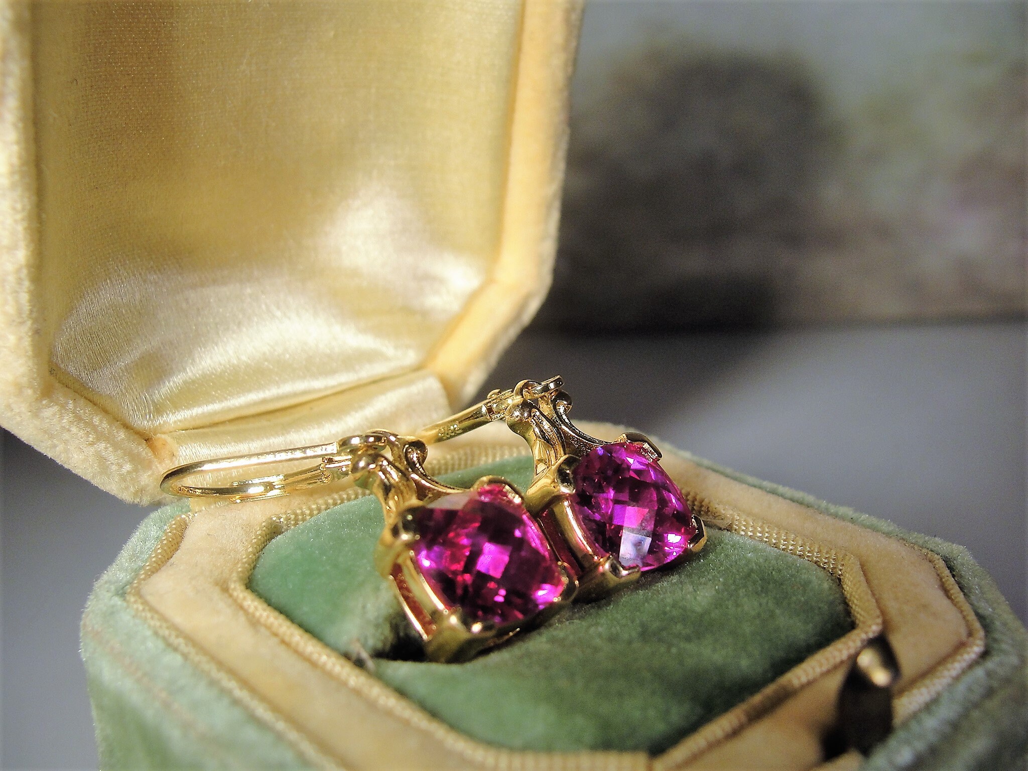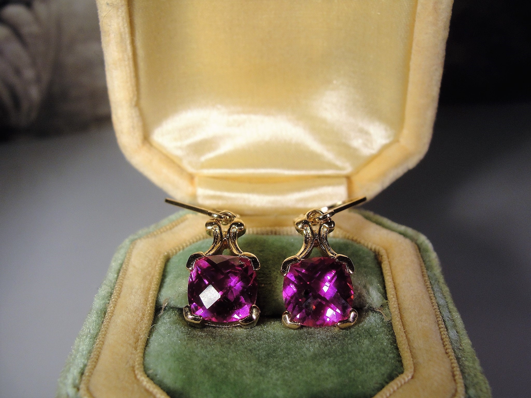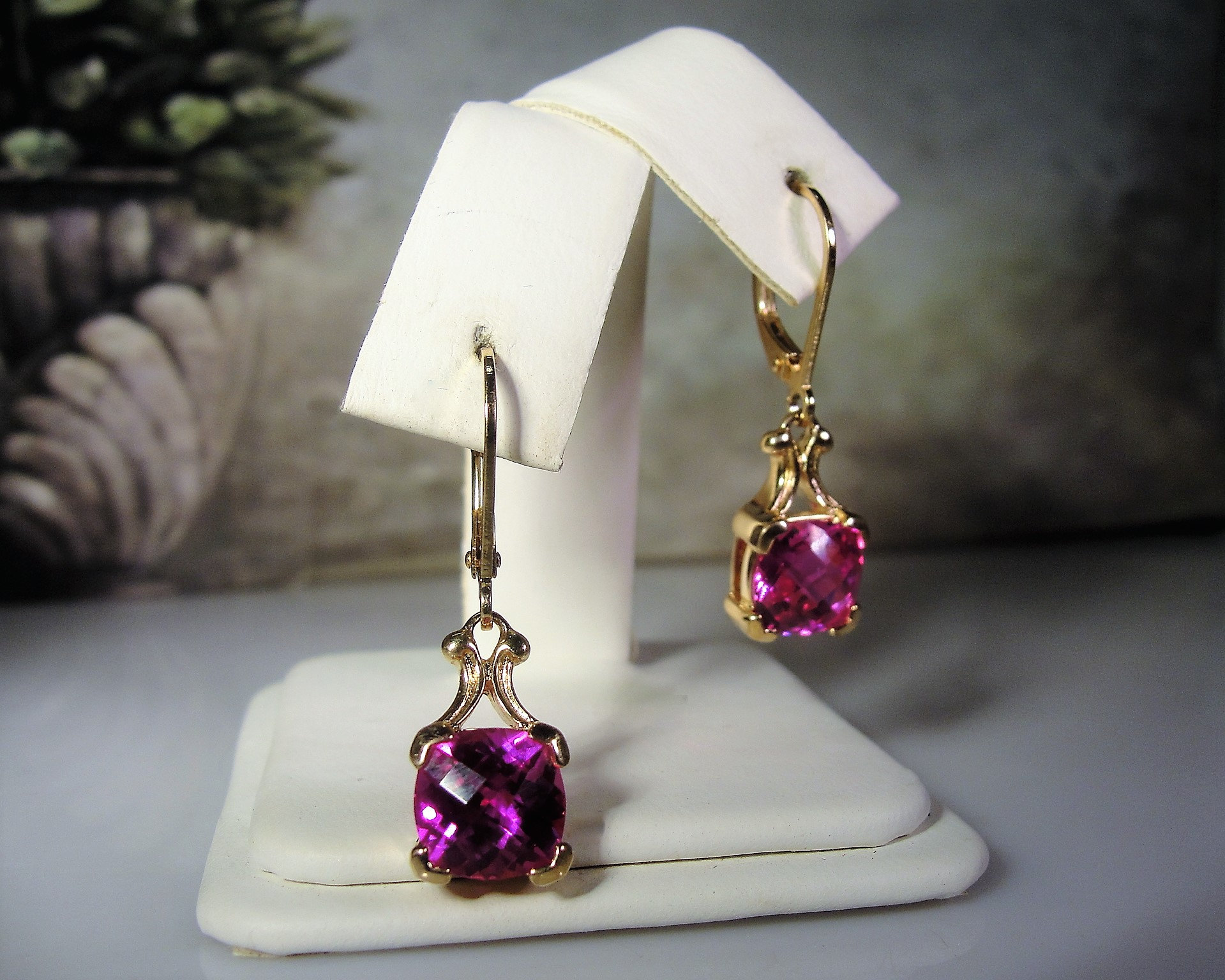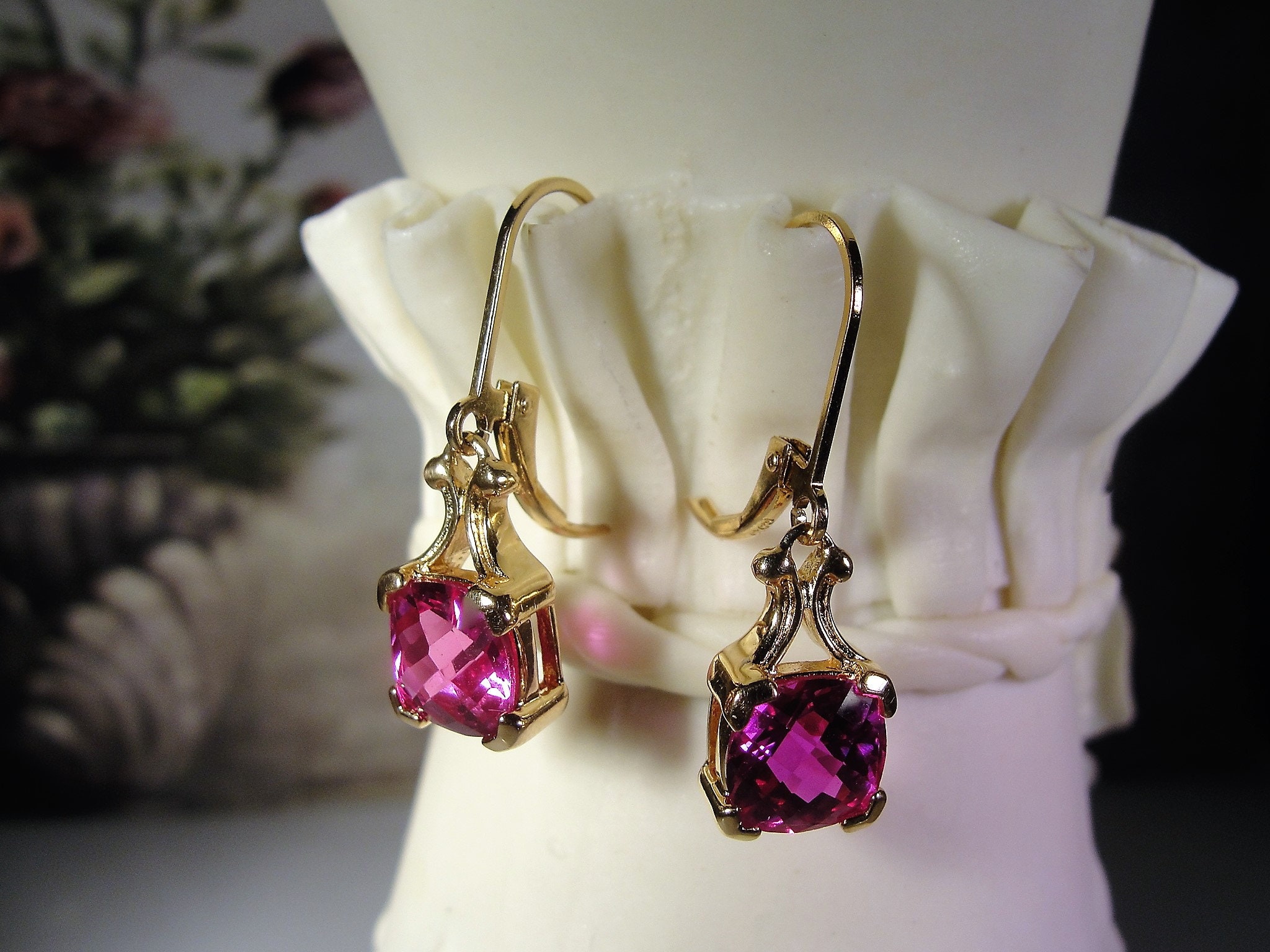 This is a very striking Pink Sapphire Earrings that have a Cushion Cut Pink Sapphire Gem set in each earring. The earrings are made for pierced ears and are a drop dangle style earring. This earrings set is a Gold Vermeil Sterling Silver pair. The pink sapphires are lab created sapphires that are of high quality and they have a beautiful depth of ruby pink color. The Cushion Cut Style provides for each gem to pick up the light from a variety of different angles, giving the pink a variety of different hues… so very pretty!!