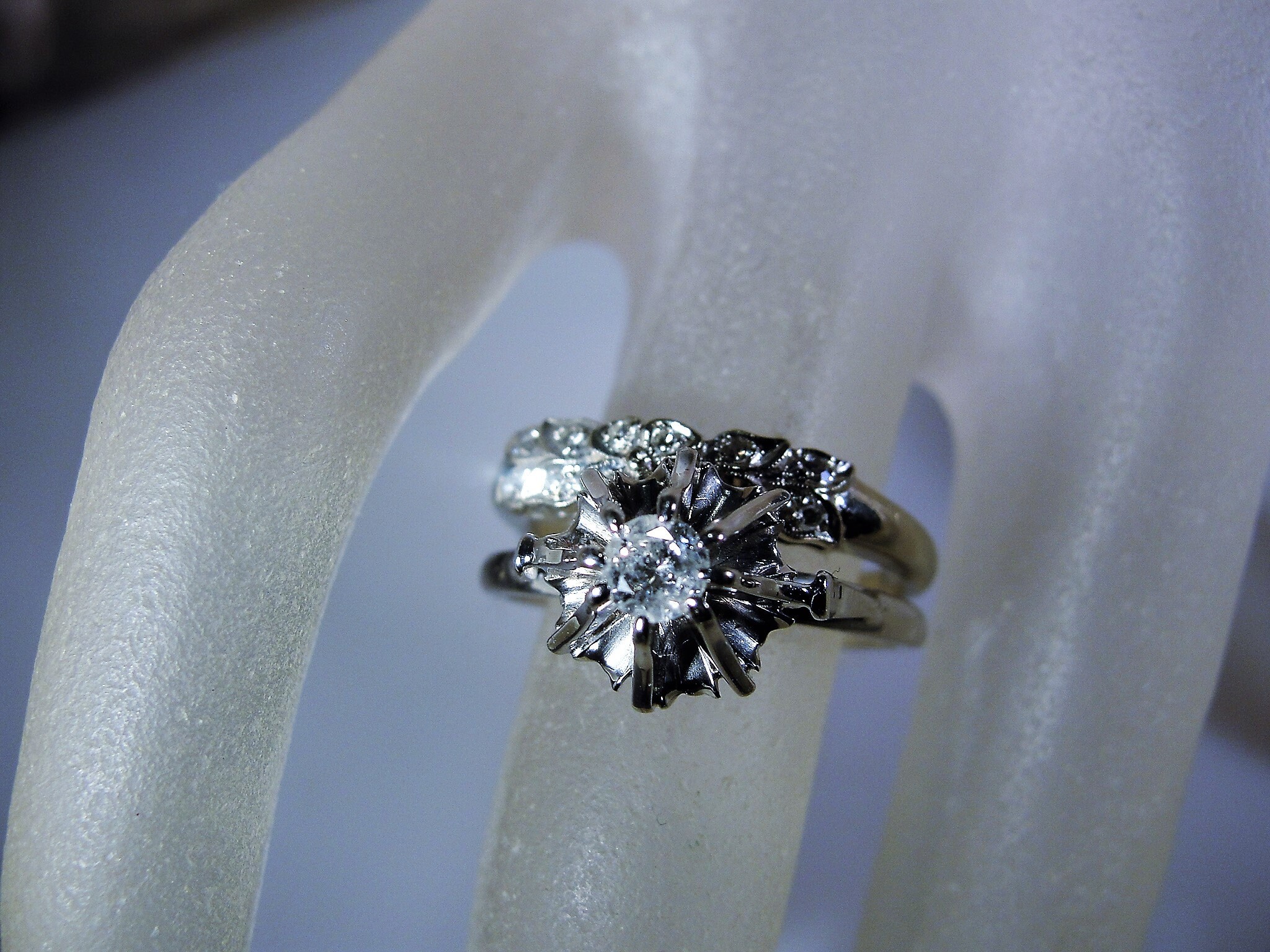 Up for your consideration is a extraordinary, stunning Cathedral Engagement Ring that sports a tall Belcher mounting and a specially Customized Wedding Band which makes up this beautiful Bridal Ring Set. The Engagement Ring has a Cathedral Mounting that holds a solitary genuine round diamond that looks to be suspended in air by way of the crowned belcher setting. Towards the bottom of the setting, this ring has a star or flower skirt that enhances the Engagement Ring and provides a uniqueness and elegance that is unmatched.