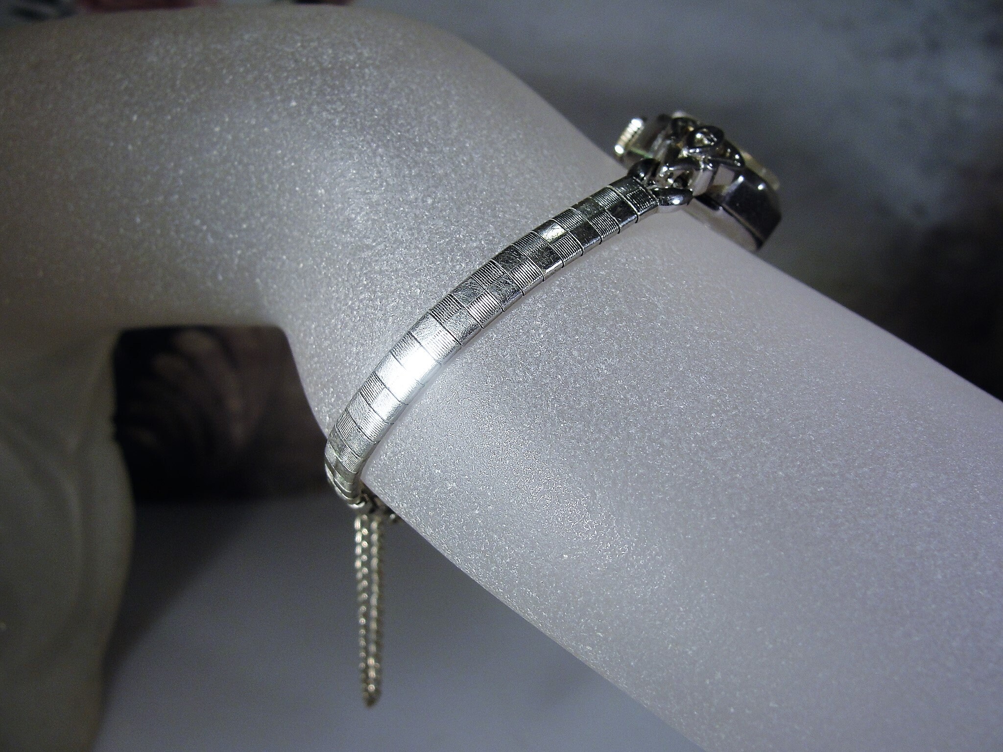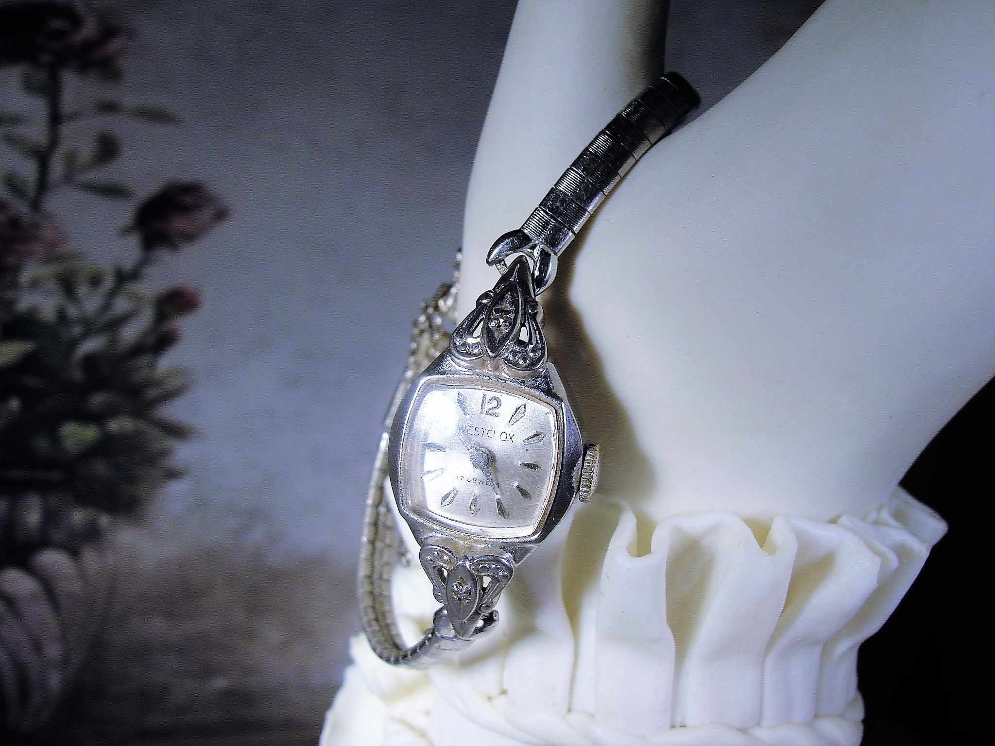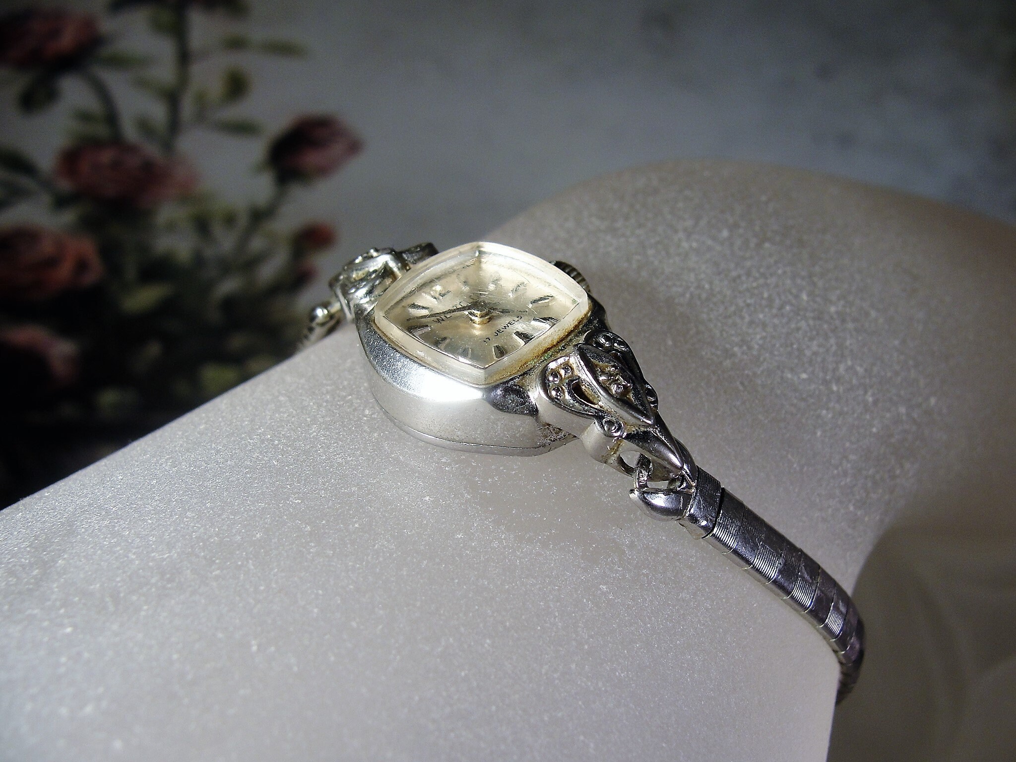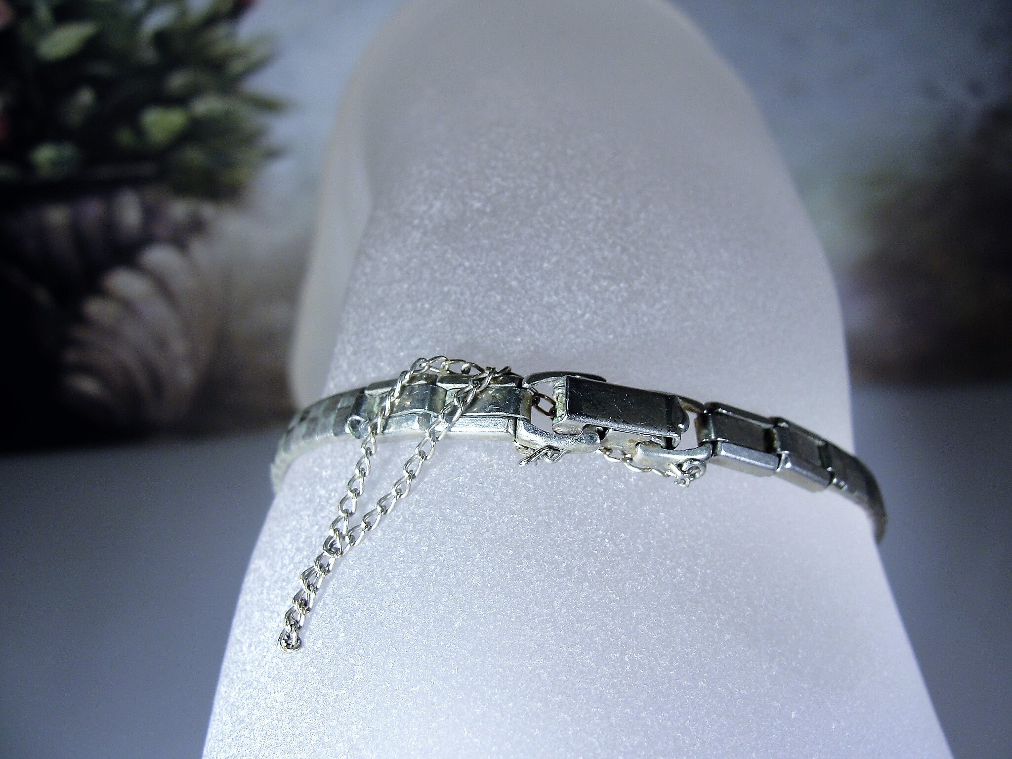 This watch has a nice sized square face with a silvery white background and silver marks indicating each hour on the dial and the number 12 at the top of the face. The hands are also done in silver as well. This watch has a nice clean face. On the top and bottom of the case, there is beautiful decorative metal work with small diamond chips imbedded into the design. The band has a think sleek checkerboard design and this watch is just lovely and very nicely kept. Watch is in good working order and it has a nice quiet TICK when running. This is a Mechanical Watch that does need to be wound daily.