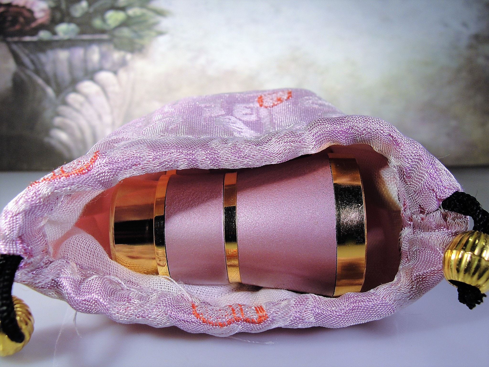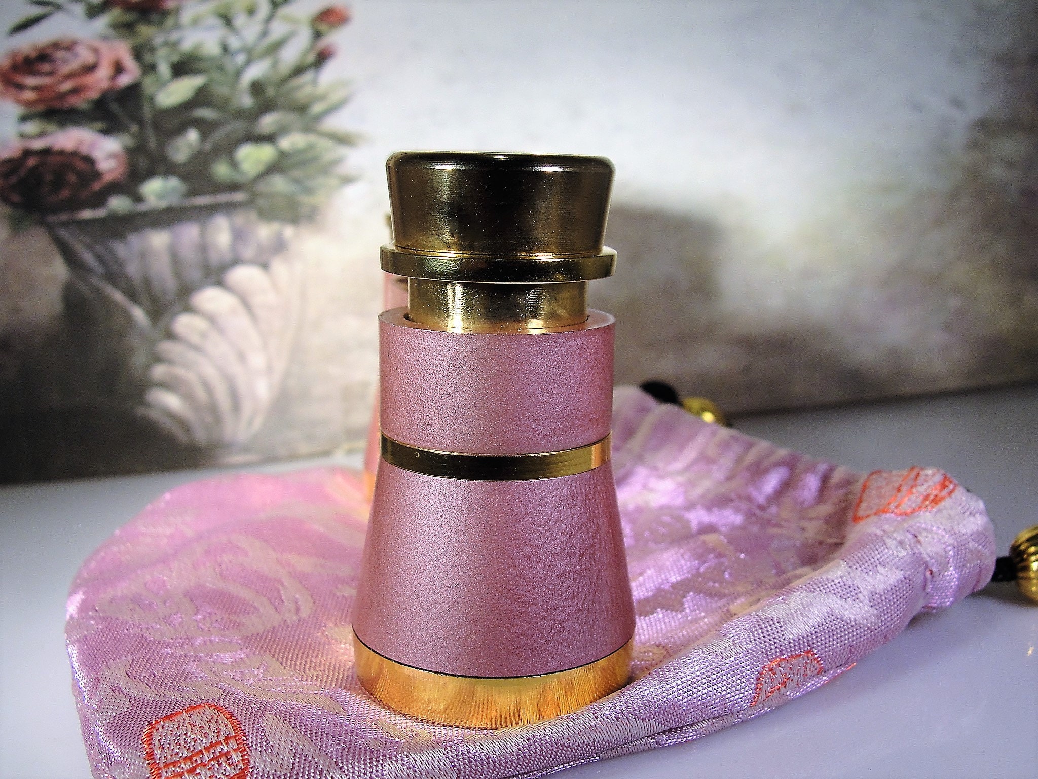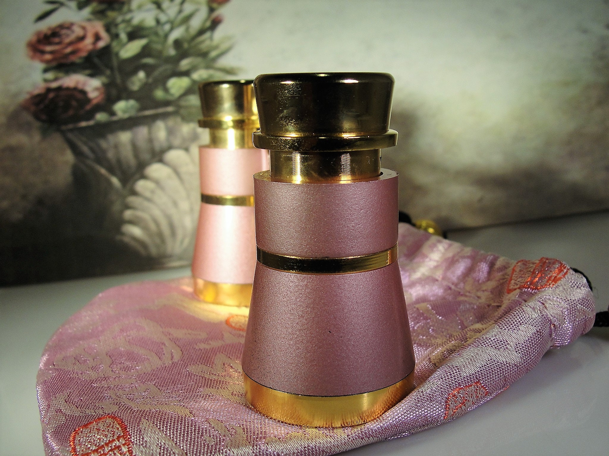 This is a very lovely and feminine pair of Opera Glasses that are just the perfect size to slip inside your purchase and carry them to any event that you are going to. These opera glasses have a very unique and lovely Lavender color with Gold Tone or Brass metal. The color is subtle and a soft Lavender Pastel. It also has a perfectly matched silk and satin pouch to carry them in and protect them as well. The pouch does have some minor quilting in it and a black drawstring to pull it closed. Truly a wonderful pair of opera glasses with extremely clear and crisp magnification as well!!