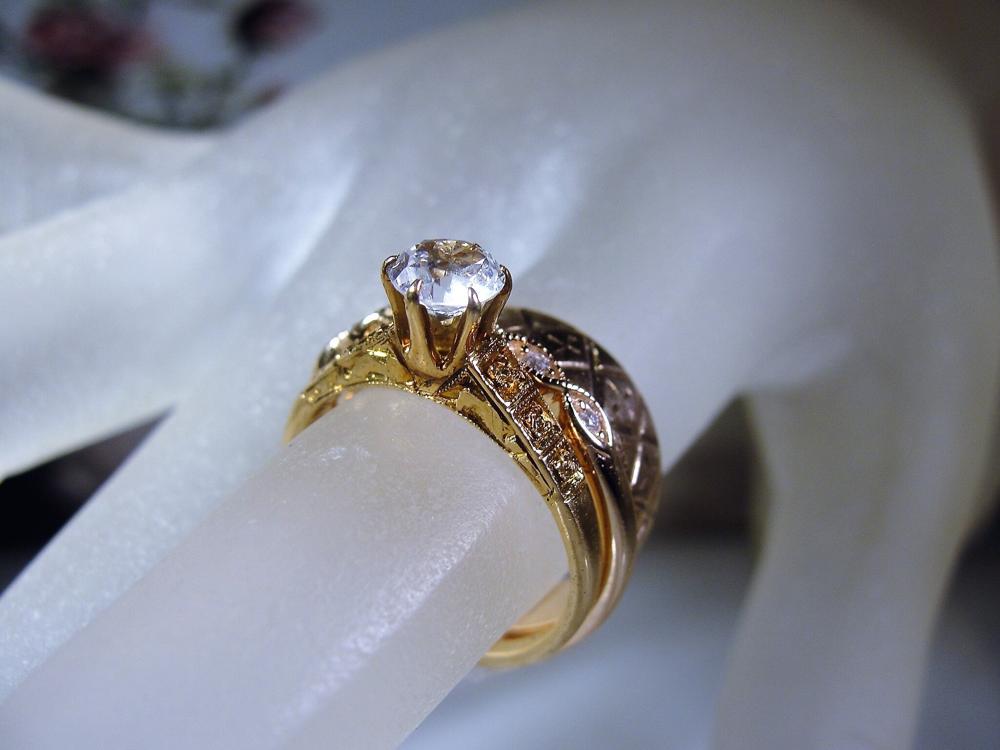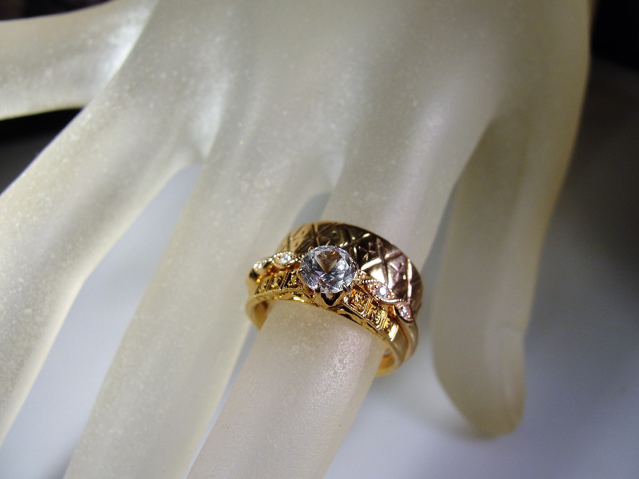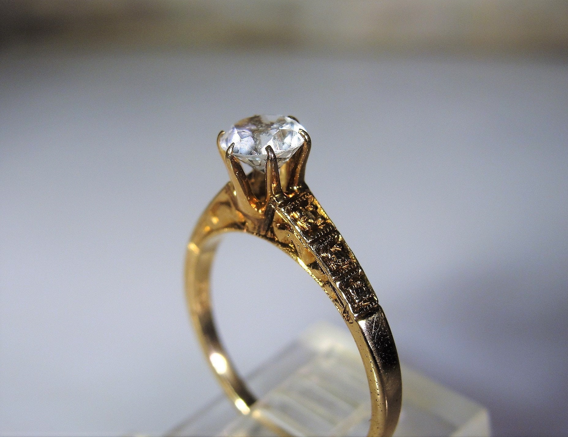This ring is a 1930s White Sapphire Art Deco style Ring that has the old world rose gold coloring. The entire ring is rose gold including the prongs. This ring is a solitaire ring with a half carat White Sapphire gem. There is a nice geometric pattern on the shoulder of the ring. The mounting is a nice height of 7.2mm off the finger and is perfect for everyday wear. So very pretty and so very feminine too!