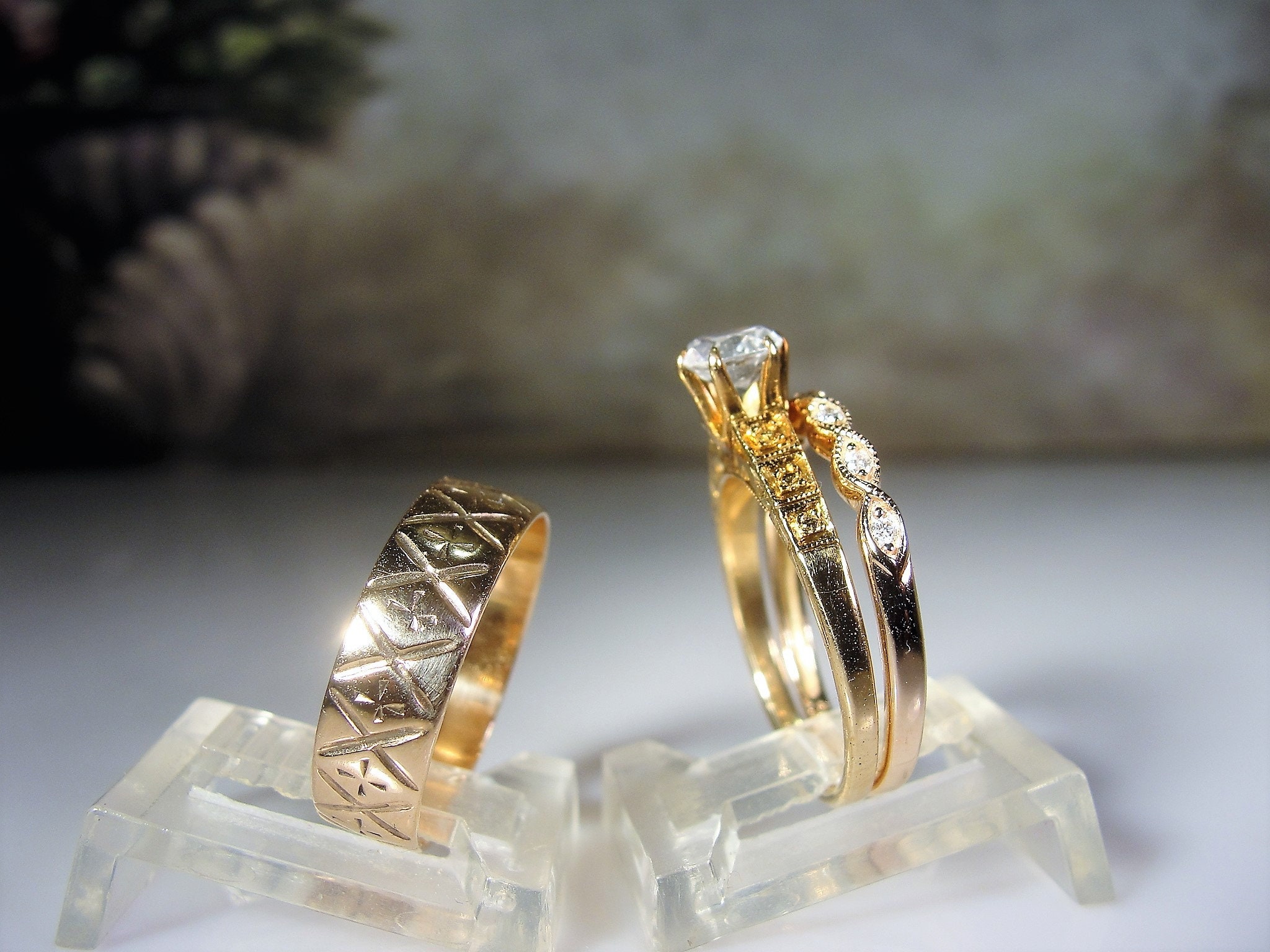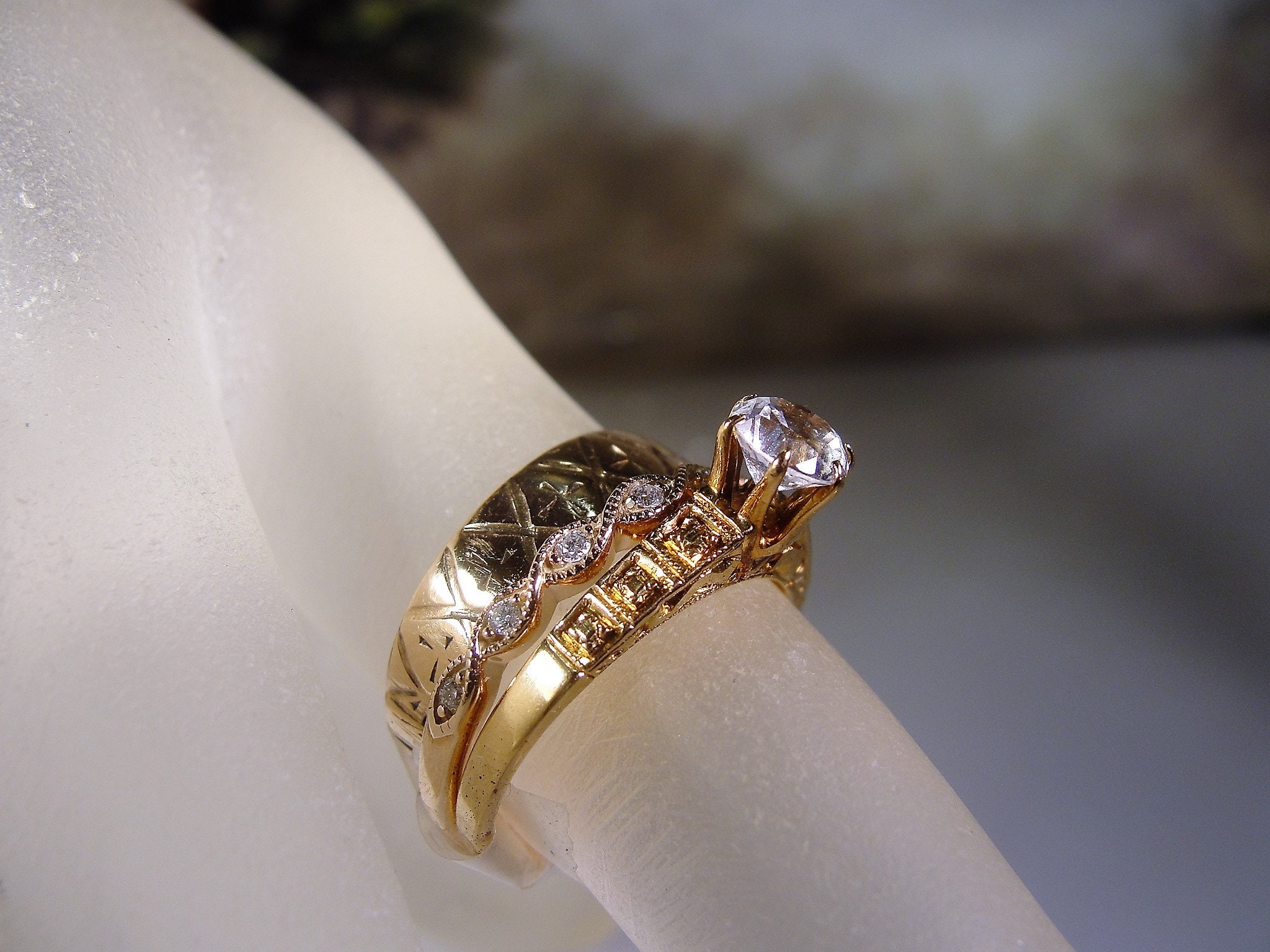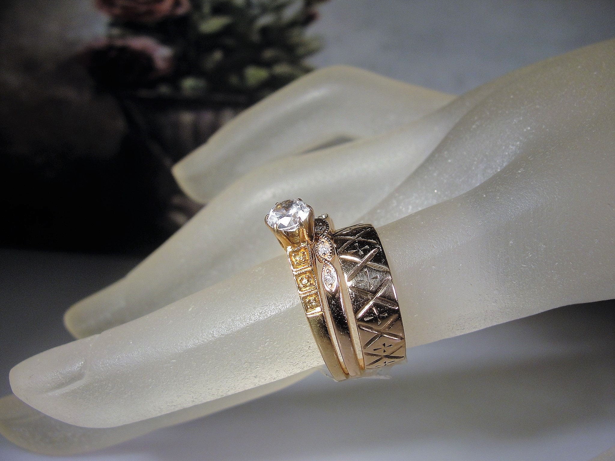 This is a beautiful White Sapphire and Diamond Bridal Ring Set that is done in 14K Rose Gold. This ring set is a mix of eras that do complement each other very nicely! There are three rings in all for this set. They are all bridal rings. The Engagement Ring is a 1930s Art Deco Style Engagement Ring. The Wedding Band is a Victorian wide etched band. And finally, the Anniversary Band is a caviar beaded rose gold band with a twisted design and 7 genuine diamonds nestled in each twisted segment, Circa 1990s. All 3 bands complement each other beautifully. Wear them separately or together or you can always mix and match… this is just a fun set that should serve you well! And it is as unique as it is beautiful!