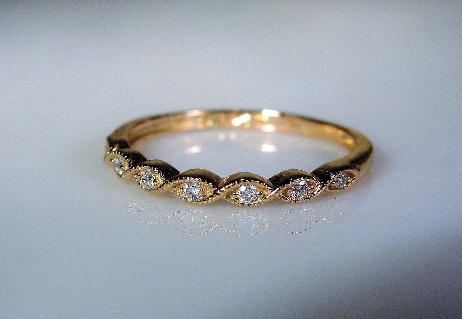 This is a gorgeous scalloped Diamond Anniversary Band. This band has 7 small genuine diamonds that are nestled inside a caviar beaded twisted design and they sparkle like crazy! This style band also allows for a pretty cool illusion of an actual twisted diamond rope with a diamond set into each twisted segment. All gems are prong set with 14K Rose Gold. Delicately beautiful!
