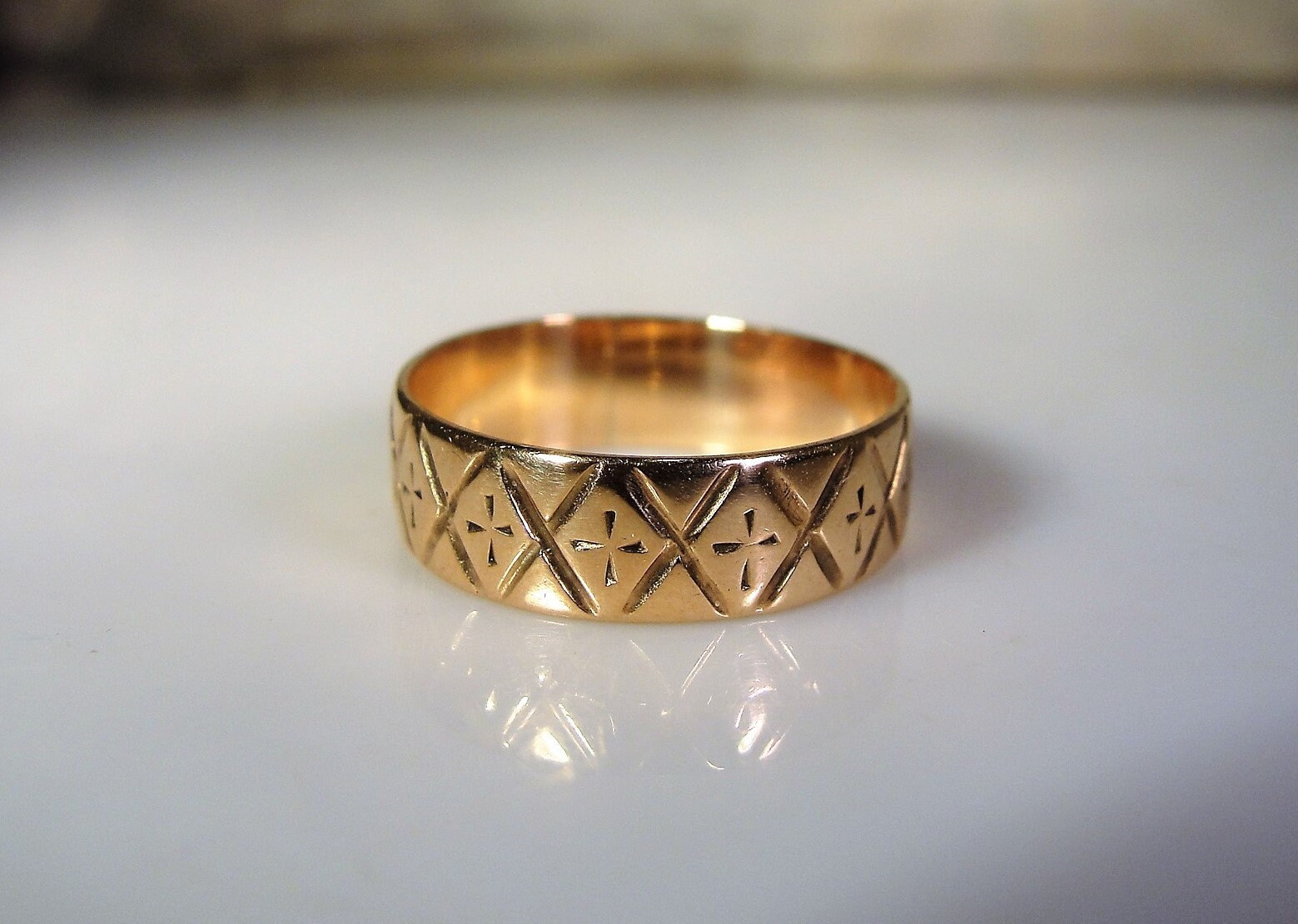 This is a beautiful Victorian Wedding Band that is done in 14K Rose Gold. The rose gold is the old world rose gold that matches the Engagement Ring very nicely. The band consists of a simplistic etched design of crosses and “X’s” that go all the way around the band. This is a nice, very clean thin band that helps to offset the Anniversary Band and tie the set together. Very Nice!!