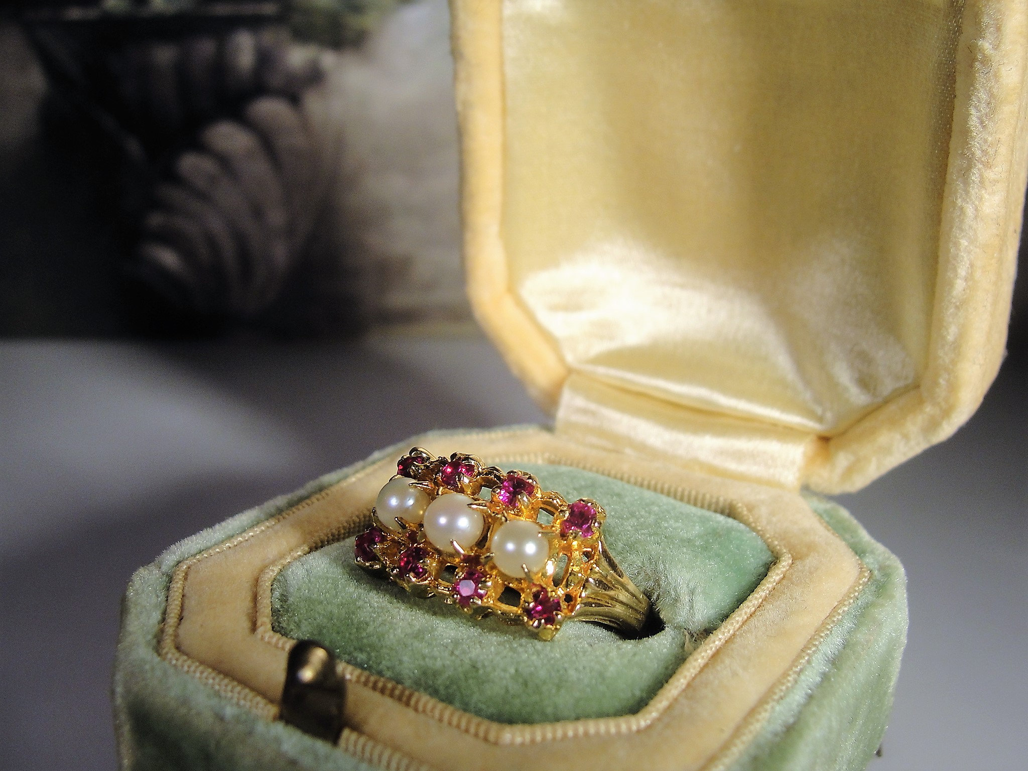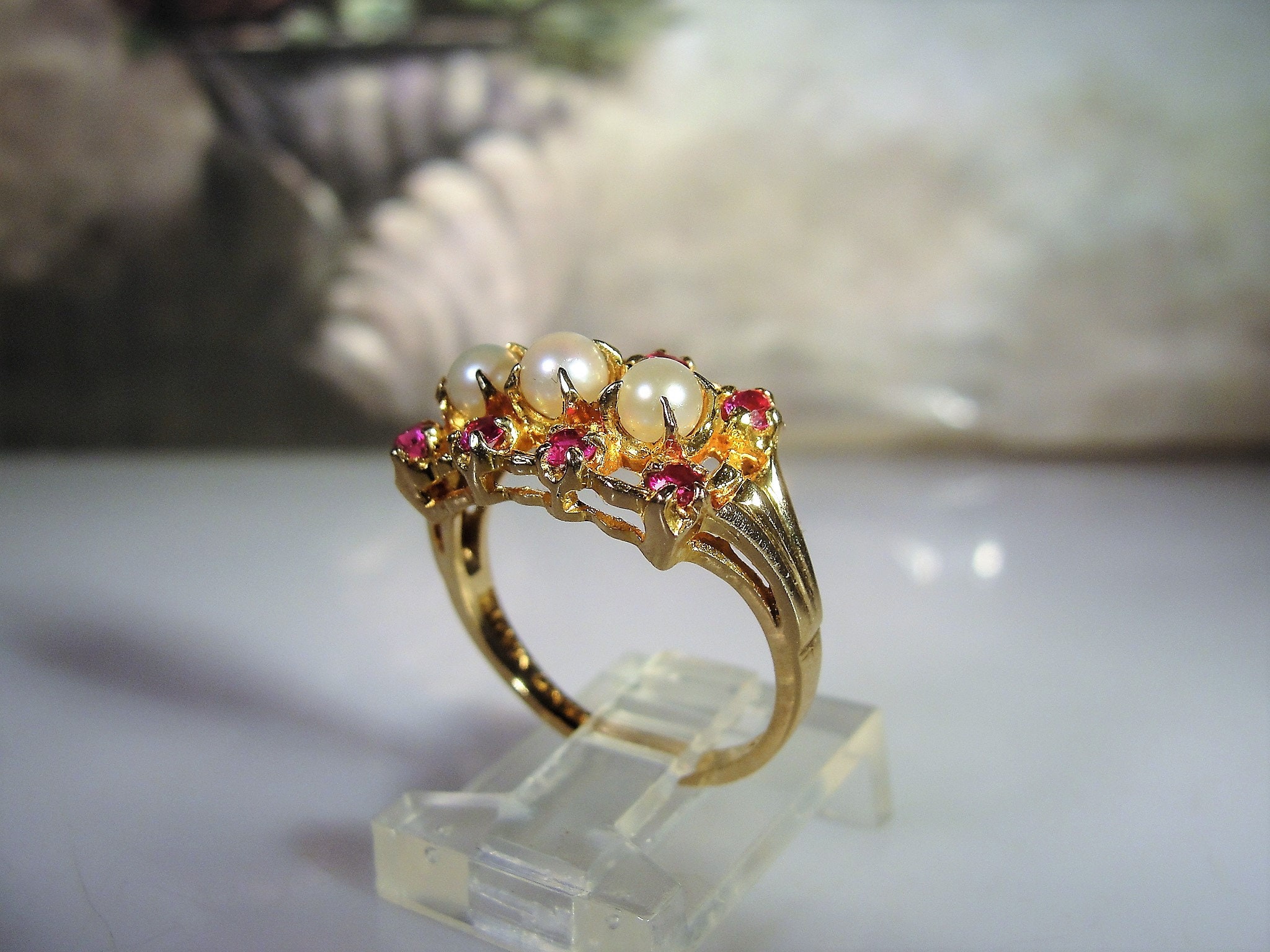 Pearl Ruby Ring, Unique 10K Gold Pearl and Ruby Ring, Pearl and Ruby Statement Ring, Vintage Ring, Vintage Band Ring, Size 6.75, FREE SIZING