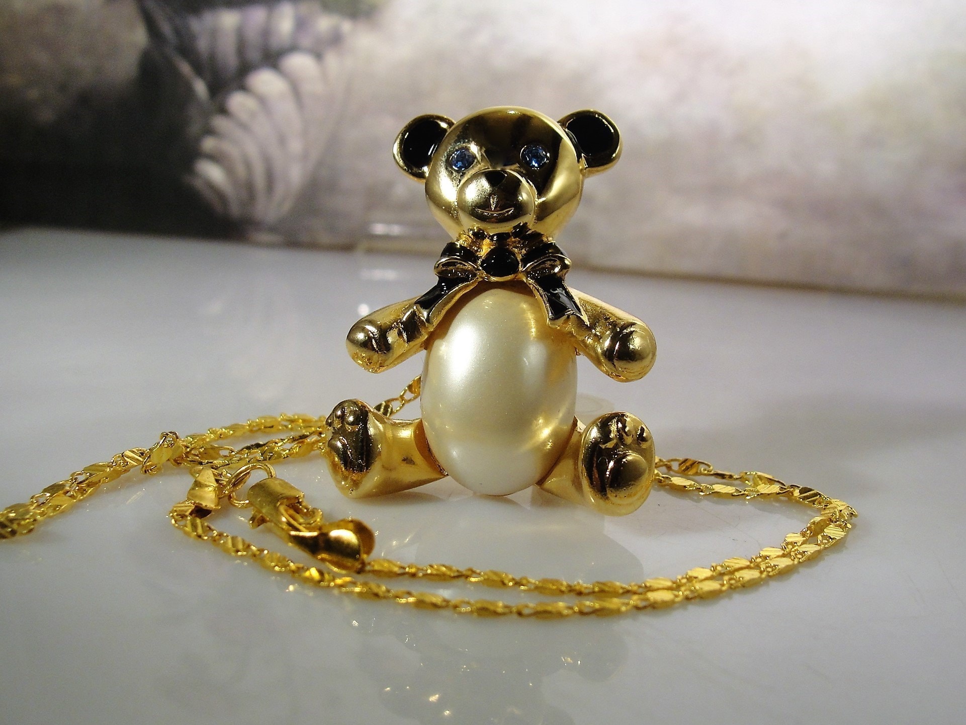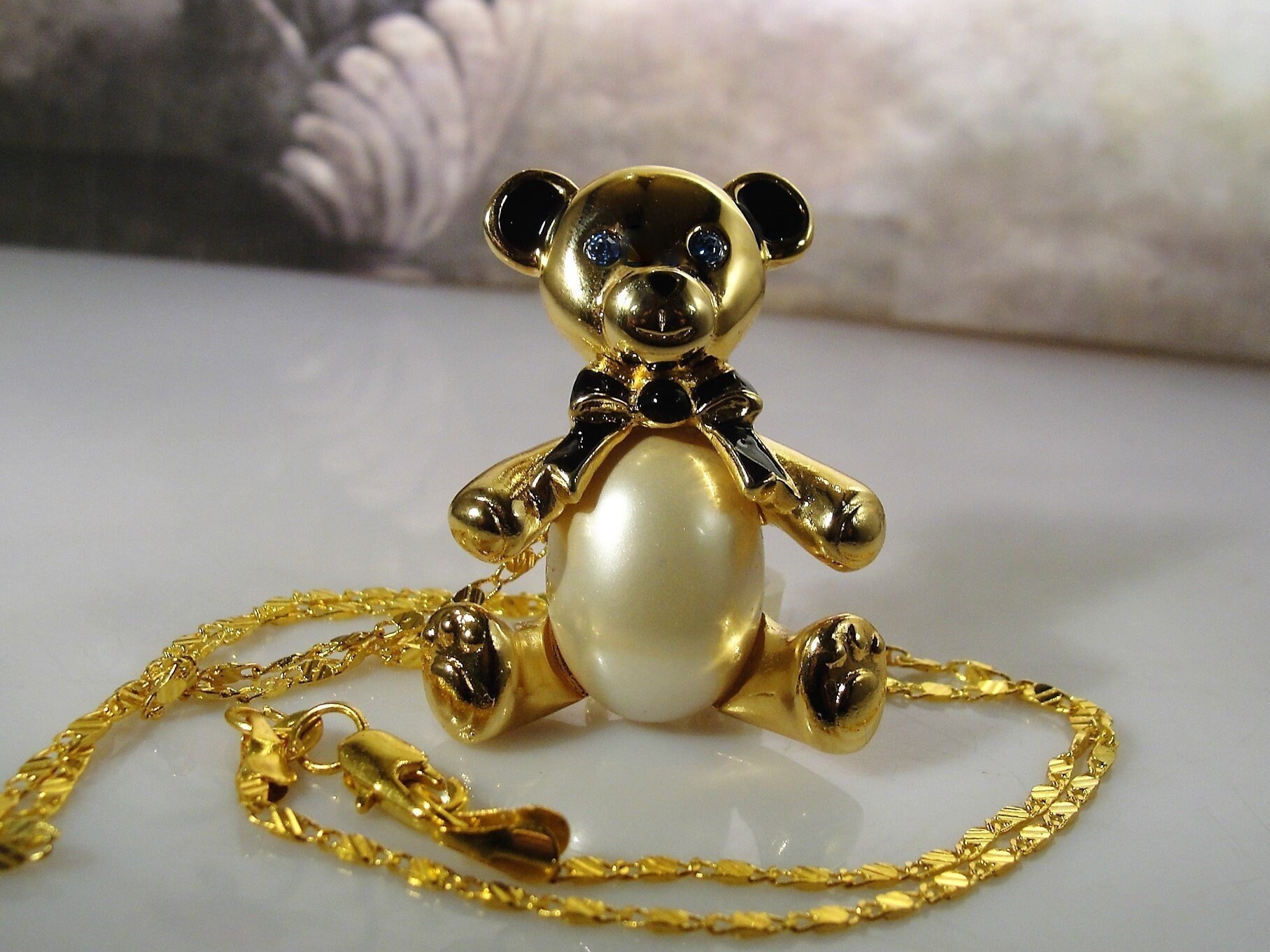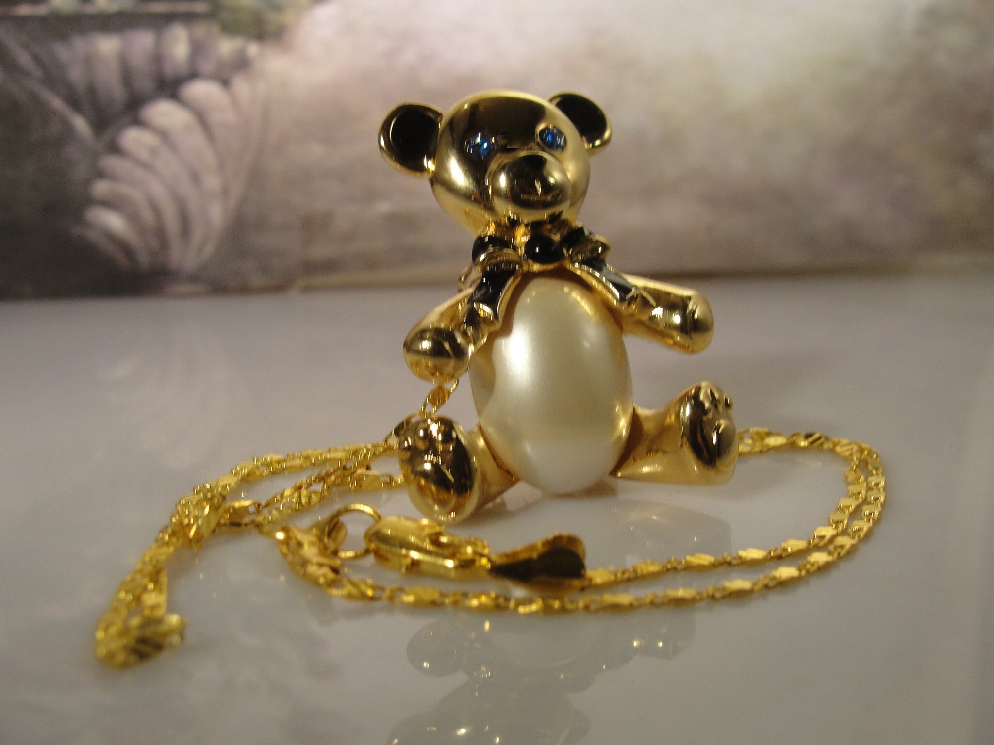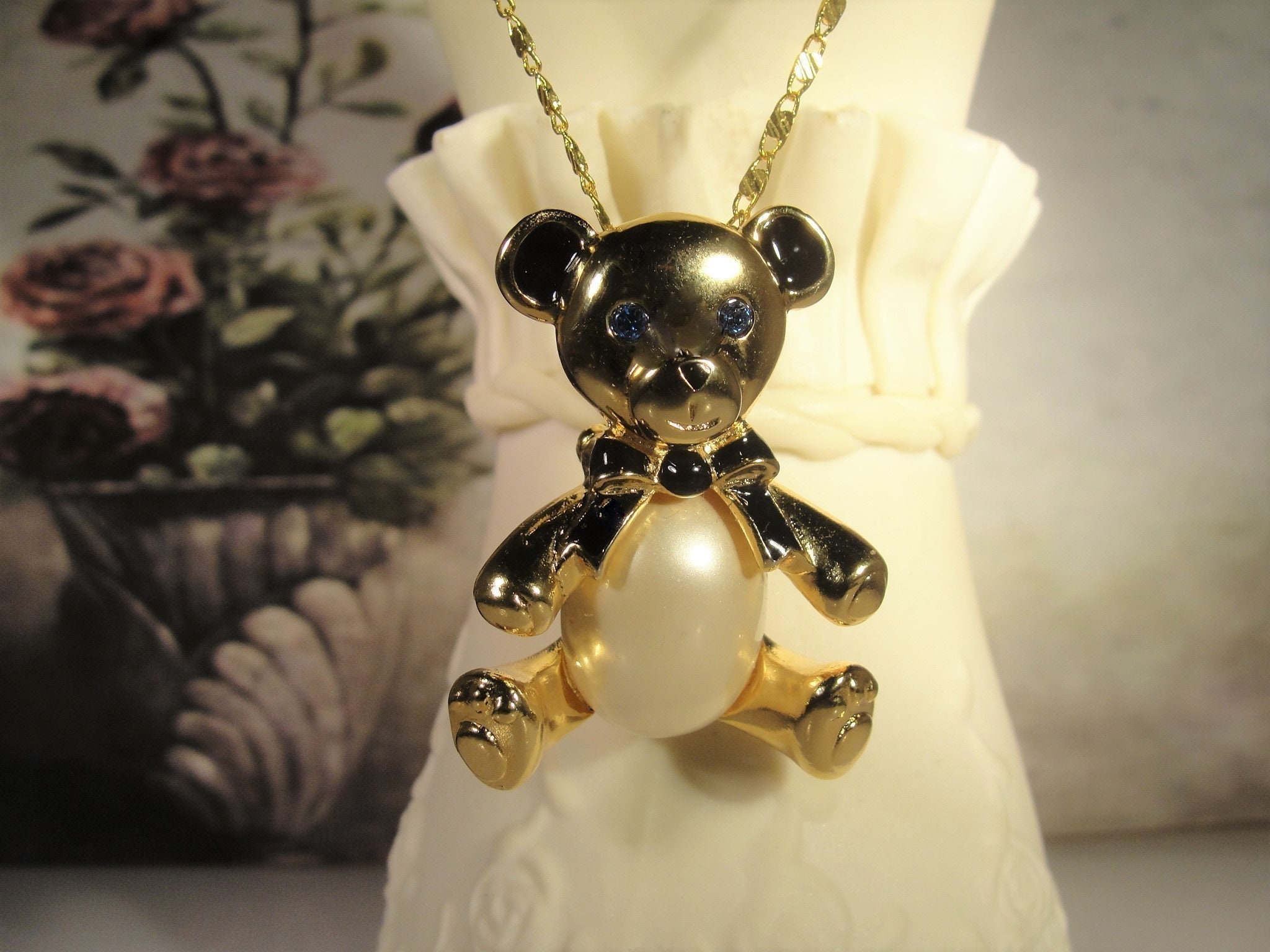 This is just the cutest little Teddy Bear Brooch that is gold plated with a high gloss finish throughout its body and blue rhinestone eyes and a white faux cabochon pearl belly. There are details that are etched within the feet and nose. It has a nice bow around its neck and black enamel ears. So very cute and beautifully done. This brooch looks to be in unused condition.