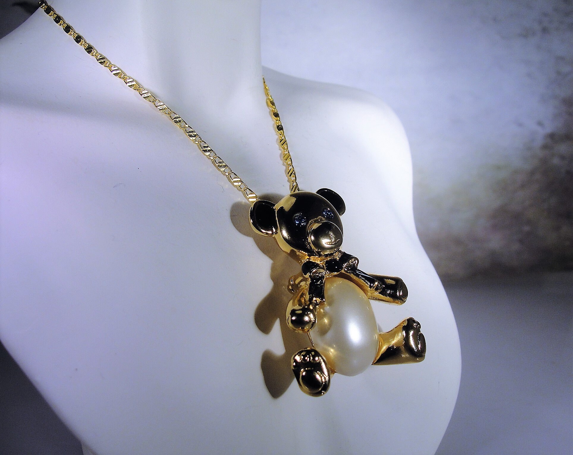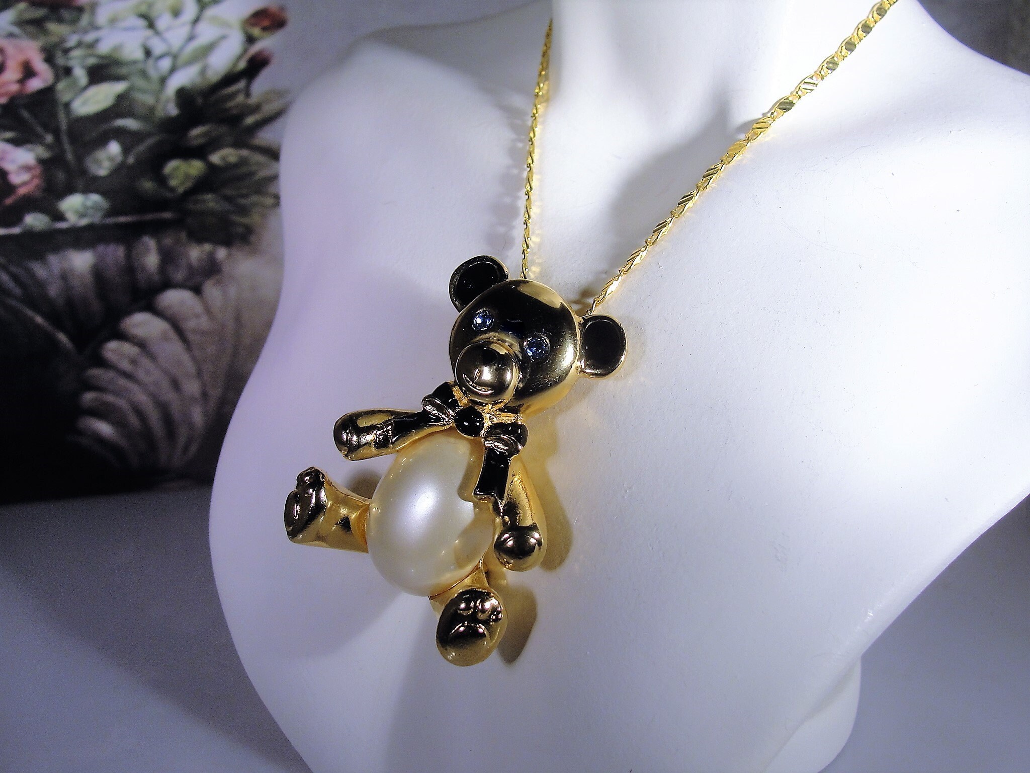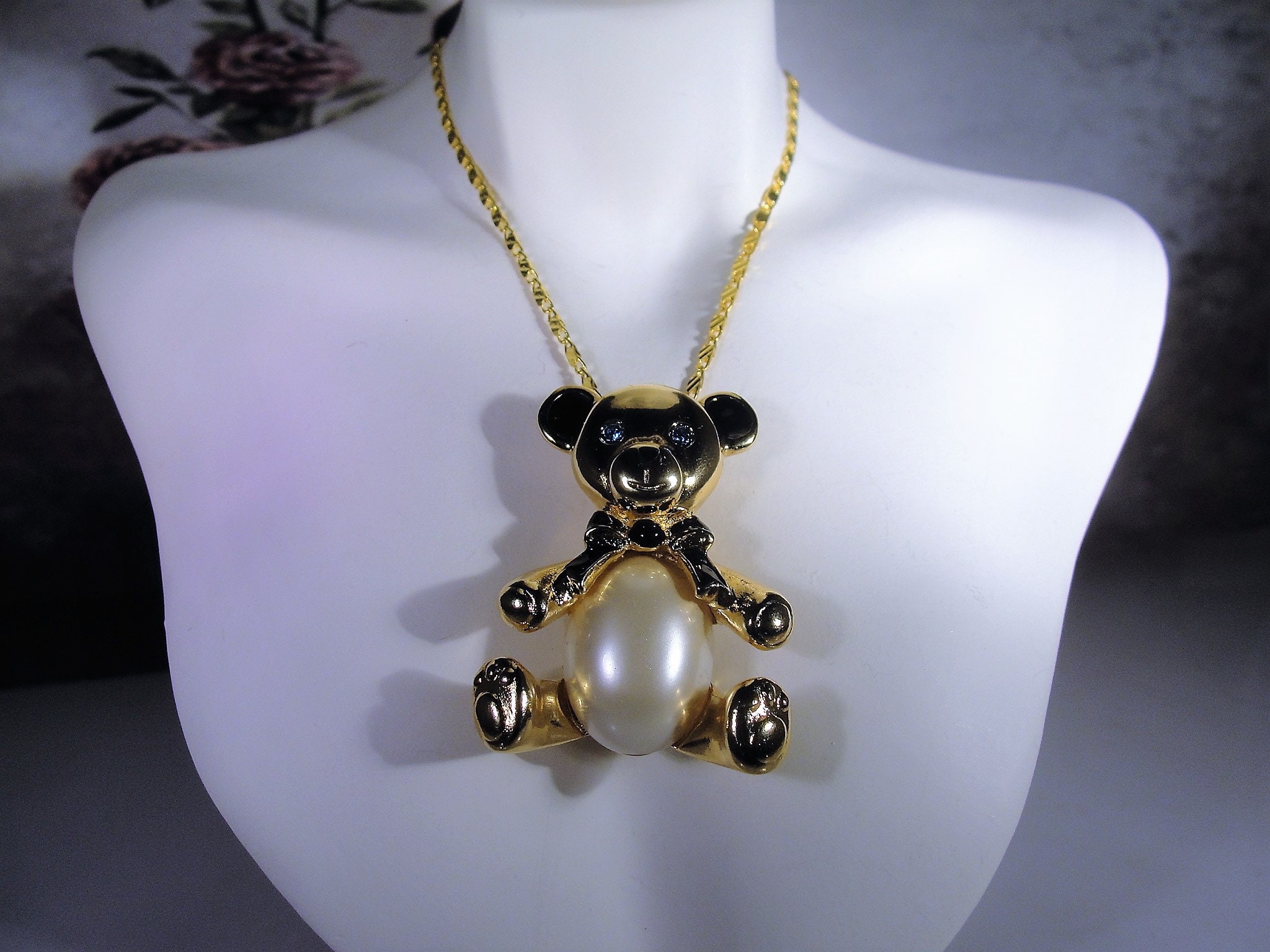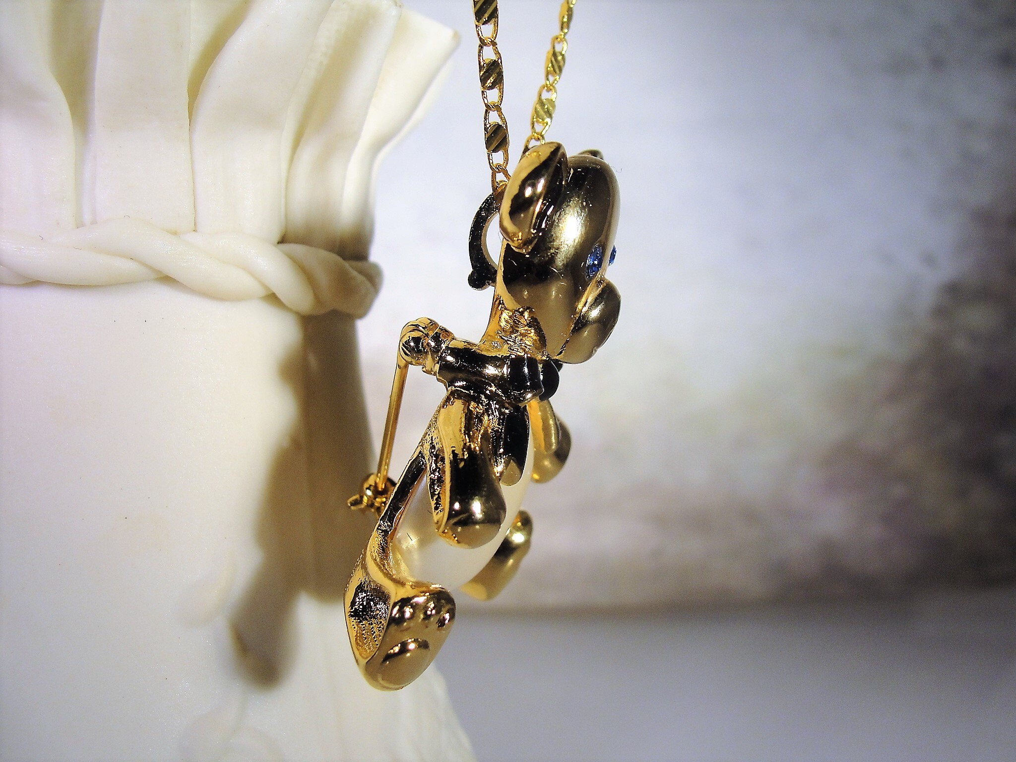 This is just the cutest little Teddy Bear Brooch that is gold plated with a high gloss finish throughout its body and blue rhinestone eyes and a white faux cabochon pearl belly. There are details that are etched within the feet and nose. It has a nice bow around its neck and black enamel ears. So very cute and beautifully done. This brooch looks to be in unused condition.