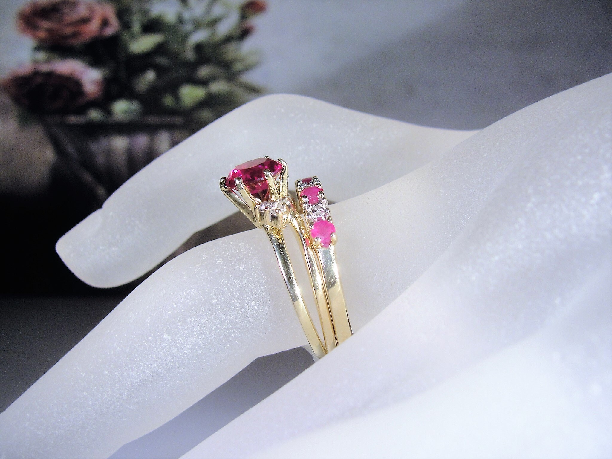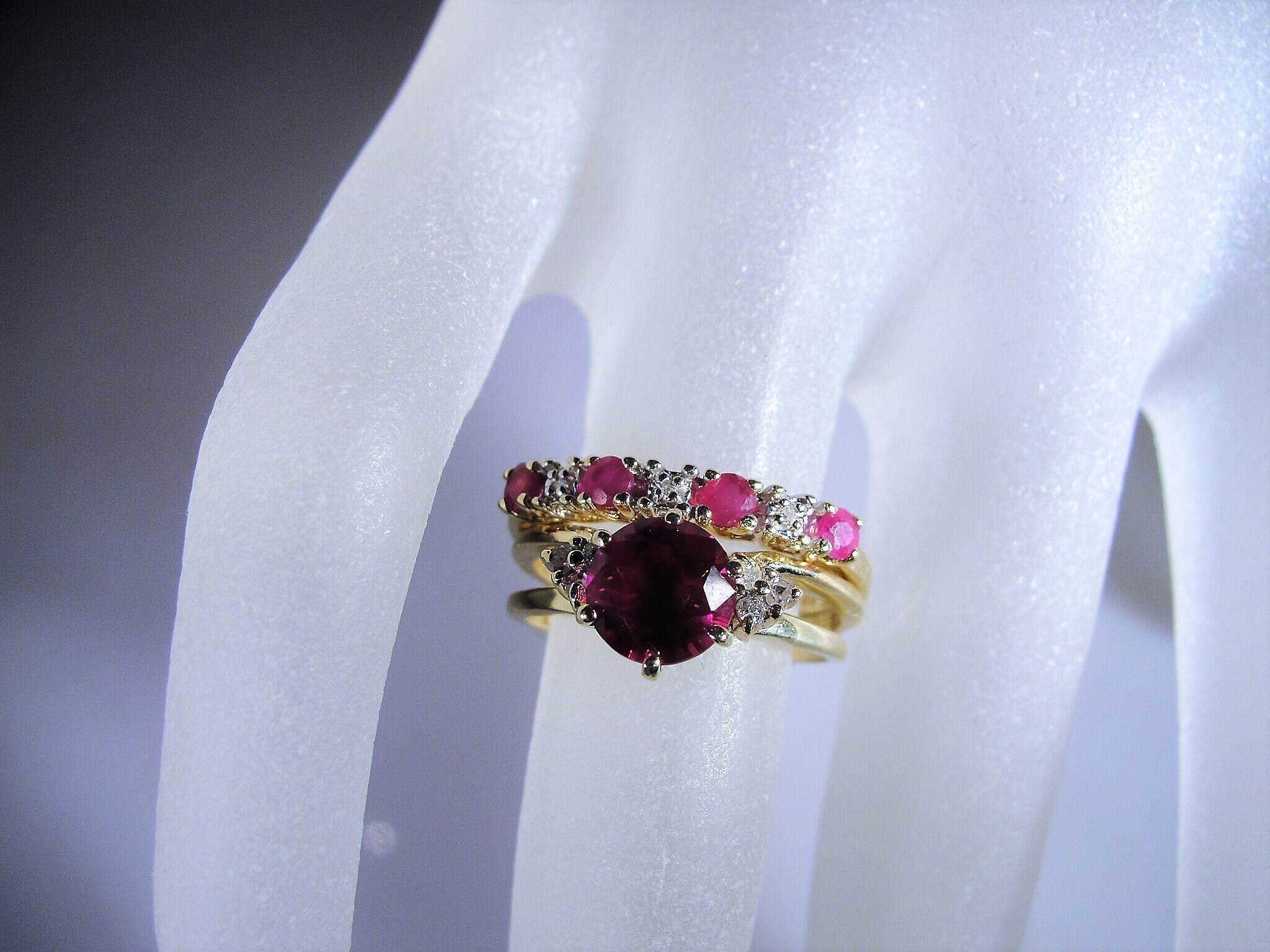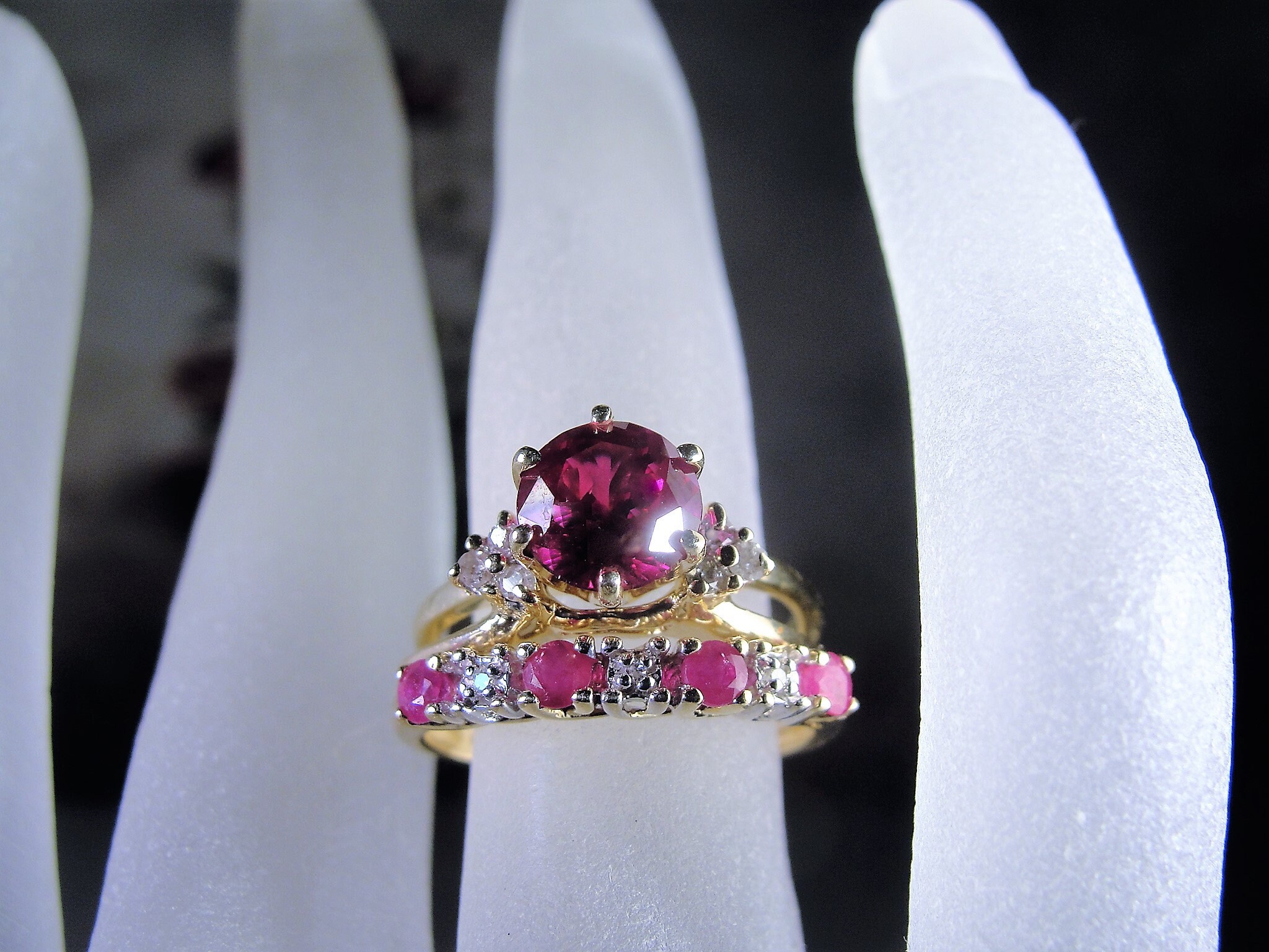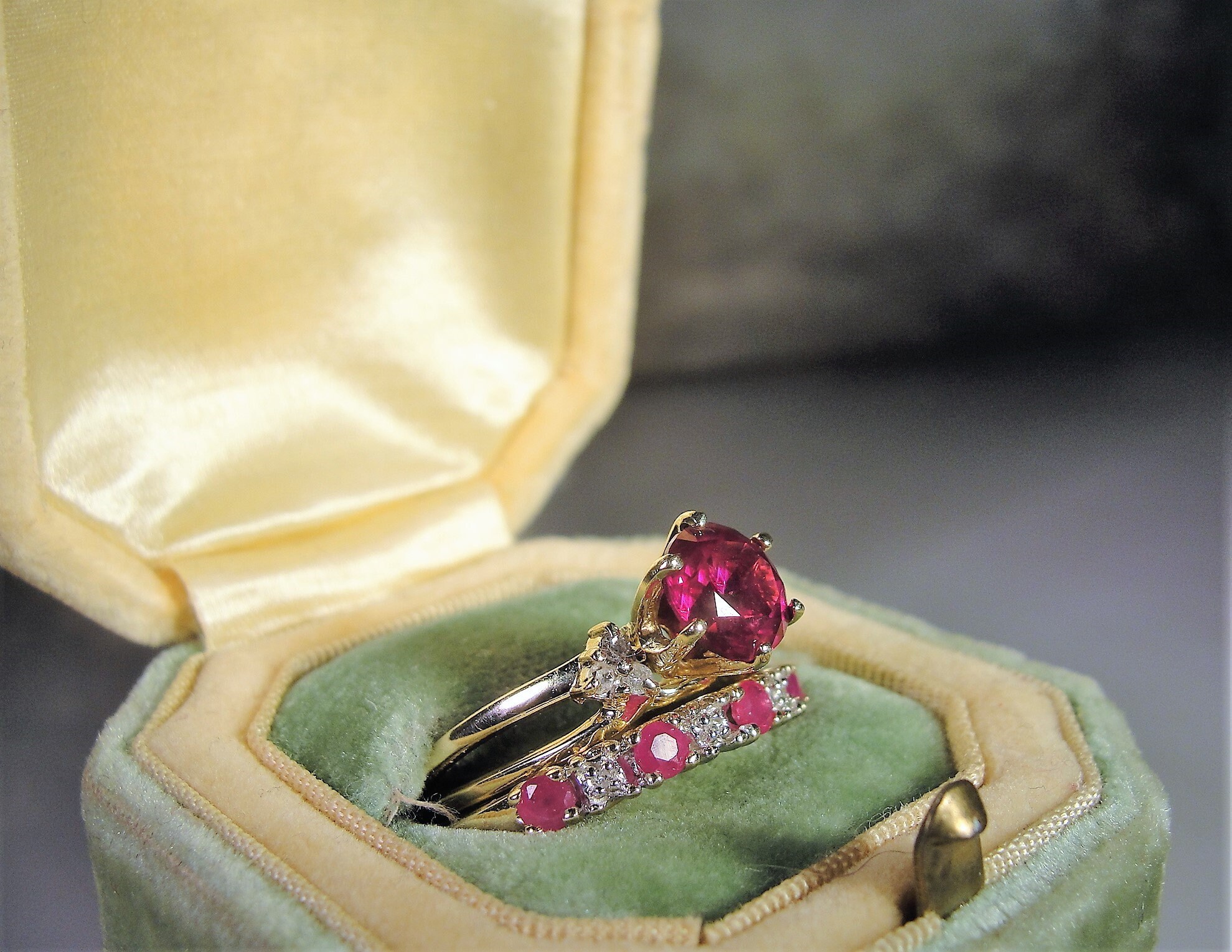 This is a stunningly gorgeous Ruby and Diamond Bridal Ring set done in 10K Yellow and White Gold. This set consists of 3 Wedding Rings. The Engagement Ring, which has a Solitaire mounting with a 1.25 Carat Round Ruby Gem. The Wedding Band that is a Diamond Enhancer that has 6 diamonds with 3 diamonds set on each side the Solitaire set in a triangle design. This Wedding Band is wide enough to slide nicely into the Engagement Ring giving the impression of one ring. The Anniversary Band is a beautiful mix of rubies and diamonds with interlocking prongs and a mix of white and yellow gold to accent the diamonds. All three fit beautifully together and presents a very unique bridal ring set! So very romantic and feminine!