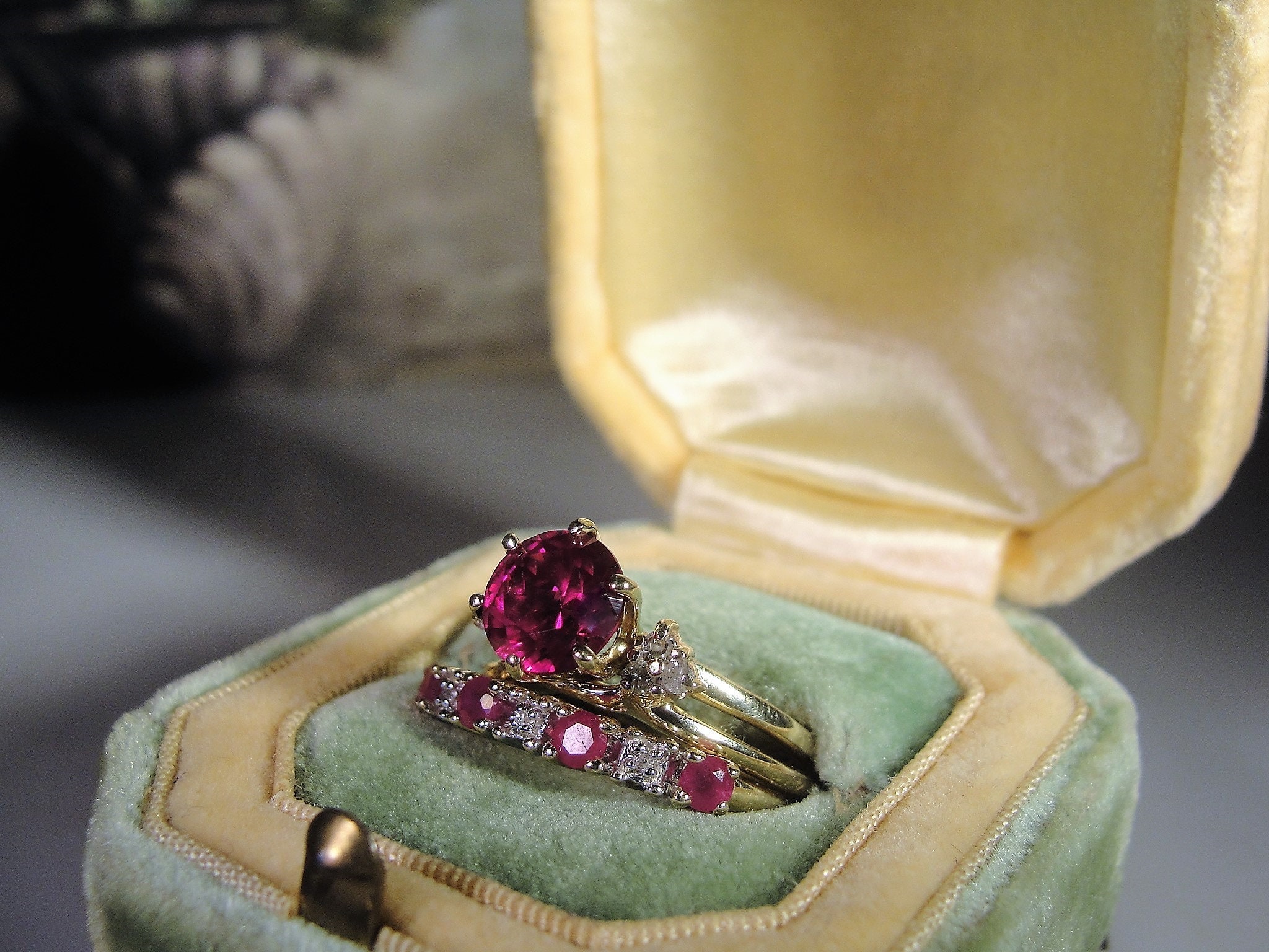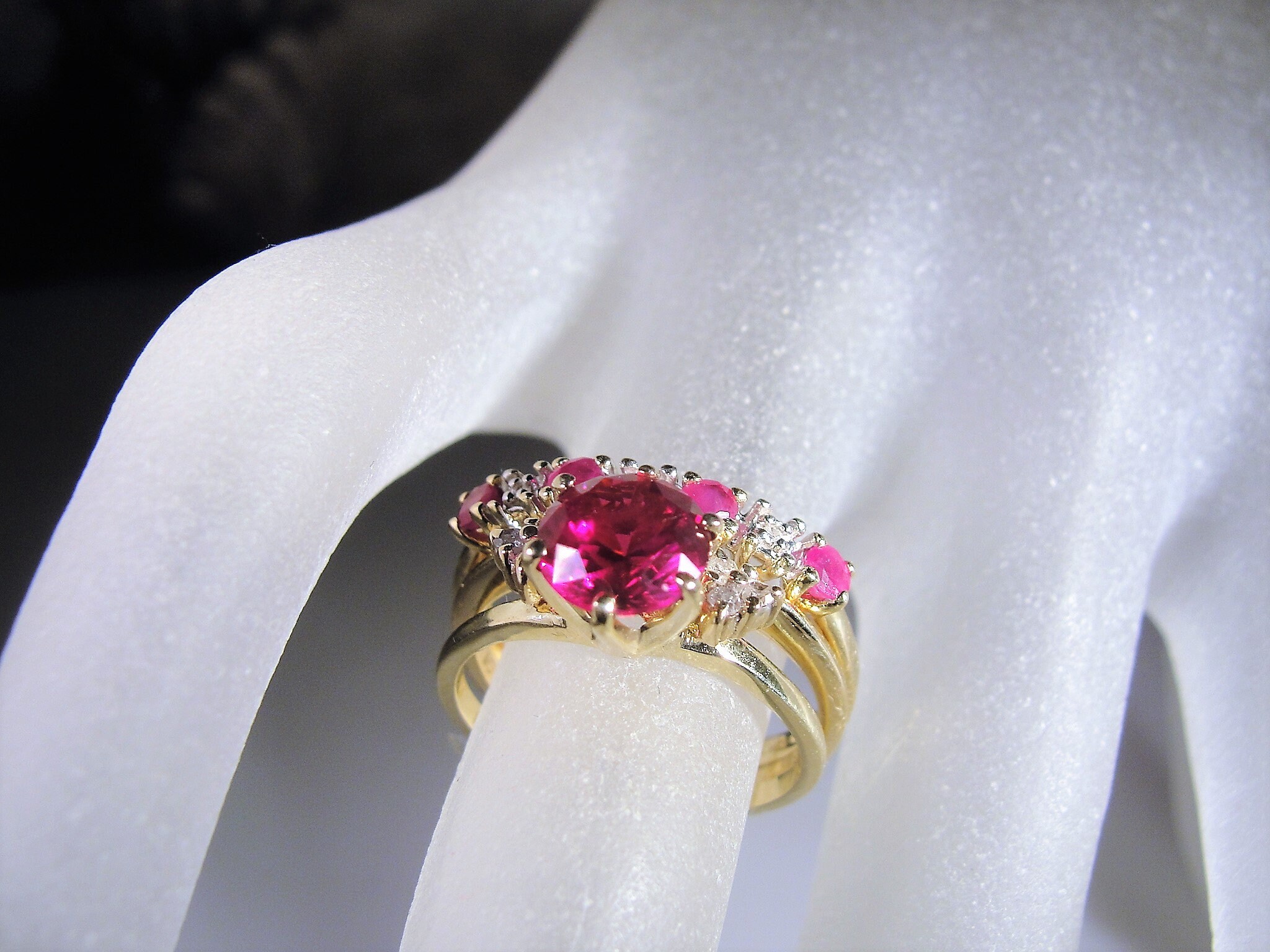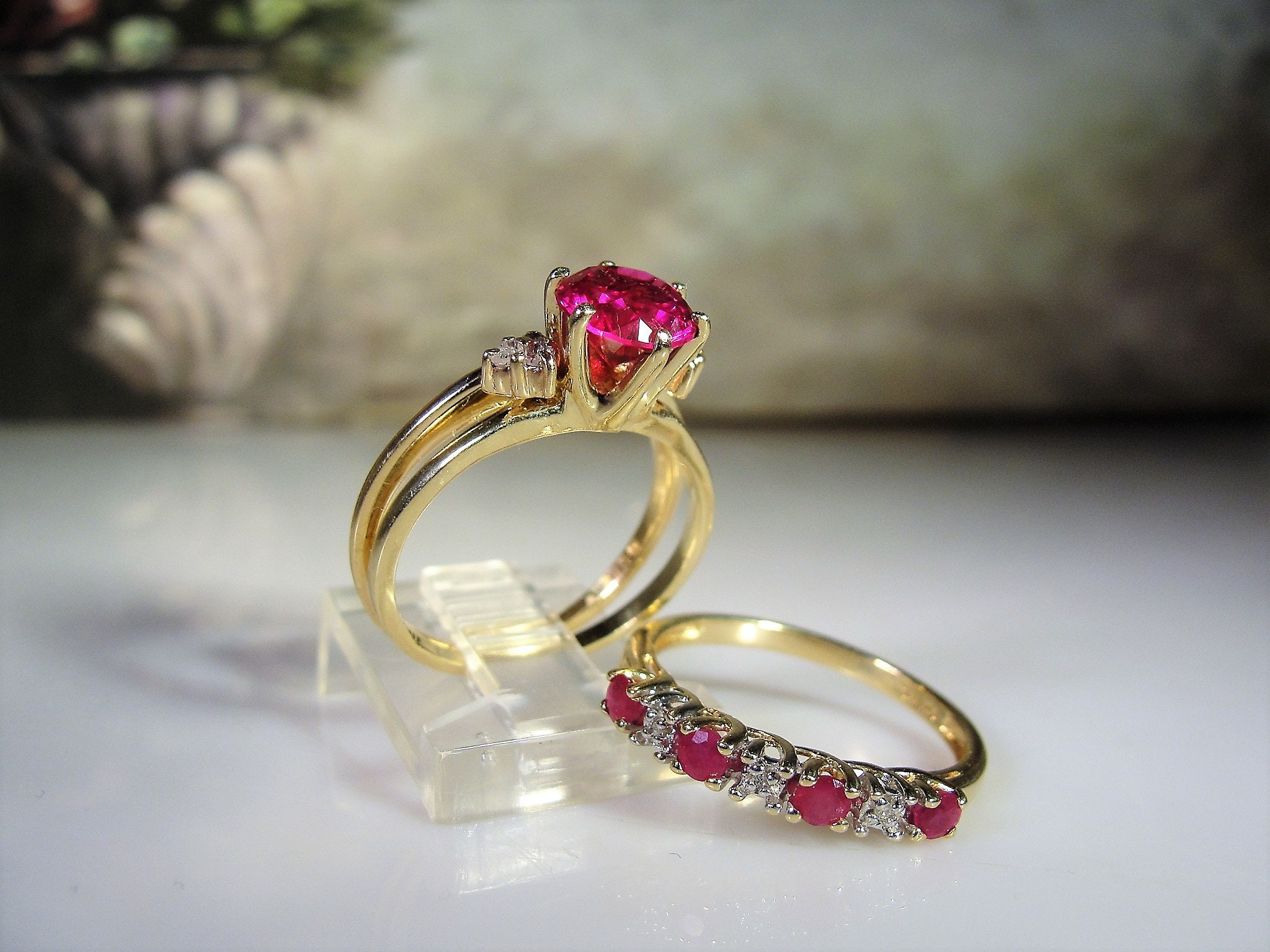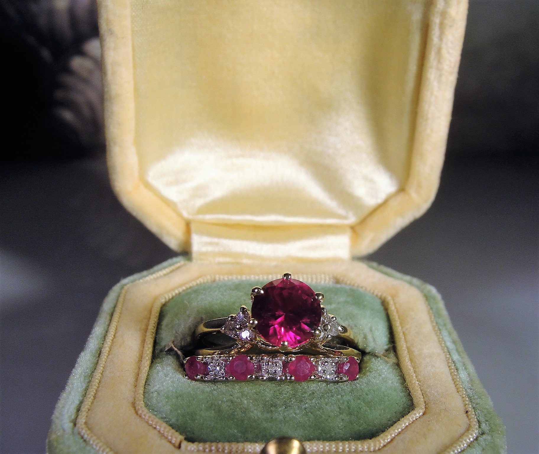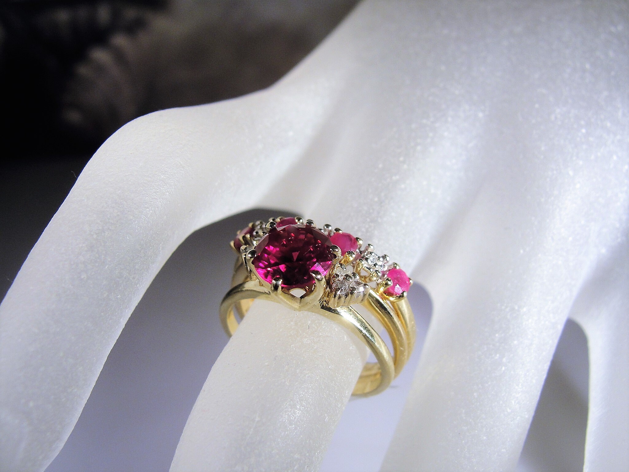 This is a stunningly gorgeous Ruby and Diamond Bridal Ring set done in 10K Yellow and White Gold. This set consists of 3 Wedding Rings. The Engagement Ring, which has a Solitaire mounting with a 1.25 Carat Round Ruby Gem. The Wedding Band that is a Diamond Enhancer that has 6 diamonds with 3 diamonds set on each side the Solitaire set in a triangle design. This Wedding Band is wide enough to slide nicely into the Engagement Ring giving the impression of one ring. The Anniversary Band is a beautiful mix of rubies and diamonds with interlocking prongs and a mix of white and yellow gold to accent the diamonds. All three fit beautifully together and presents a very unique bridal ring set! So very romantic and feminine!