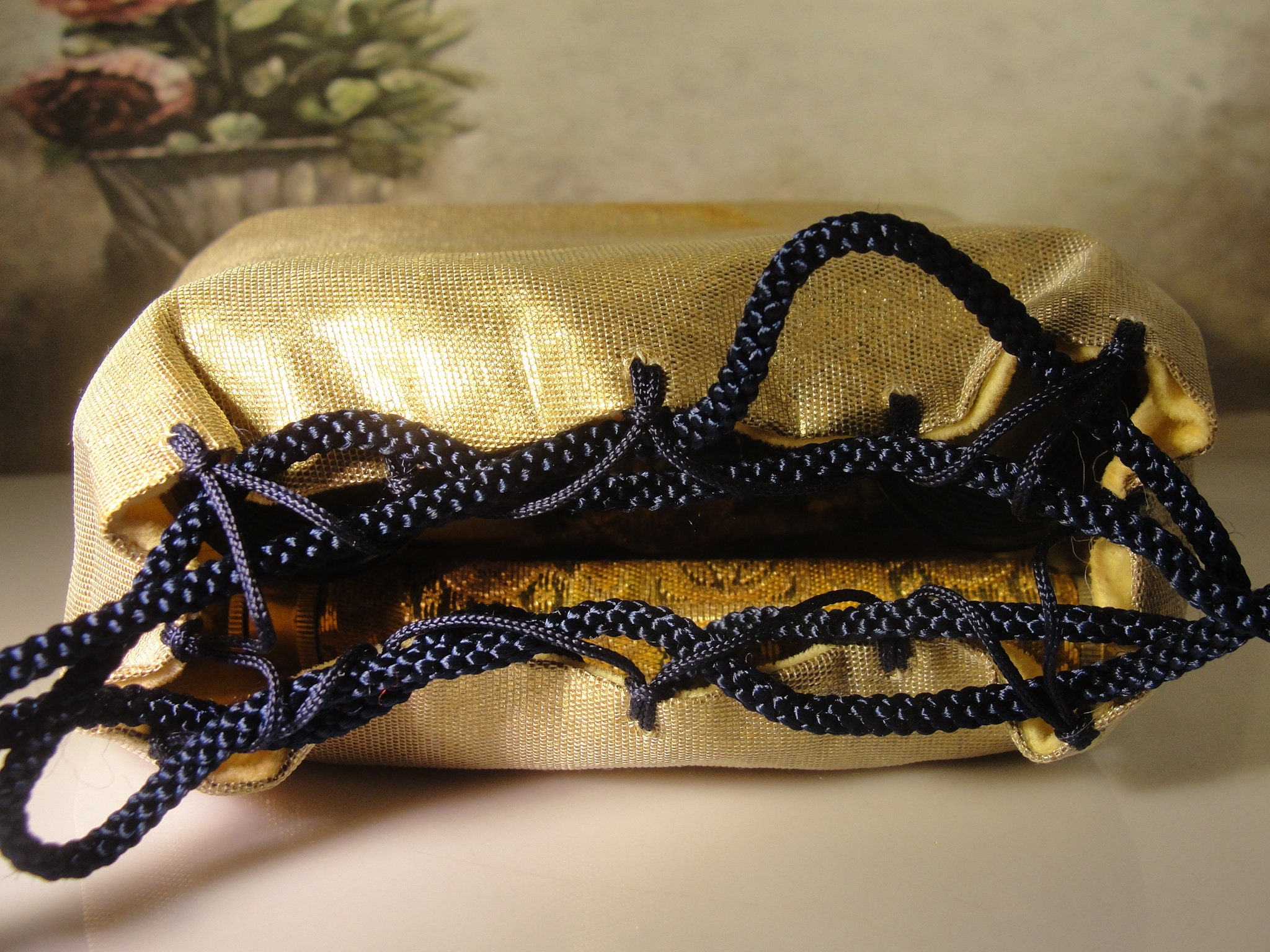 These opera glasses come with a nice gold colored case with a blue draw string that fits the opera glasses well and the original box. The original box is in decent shape for its age.