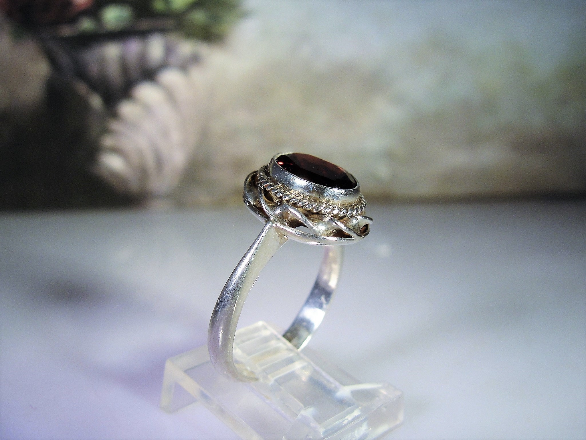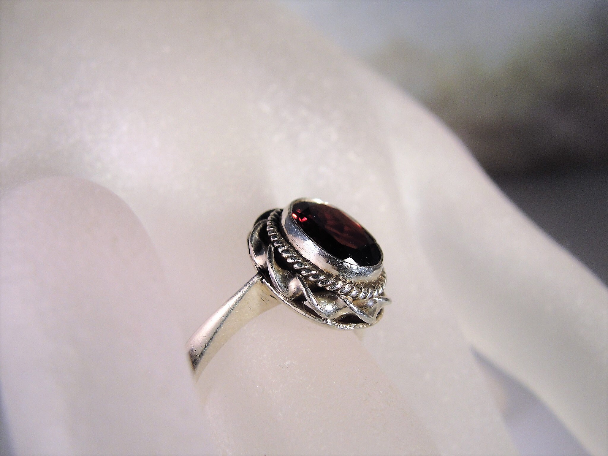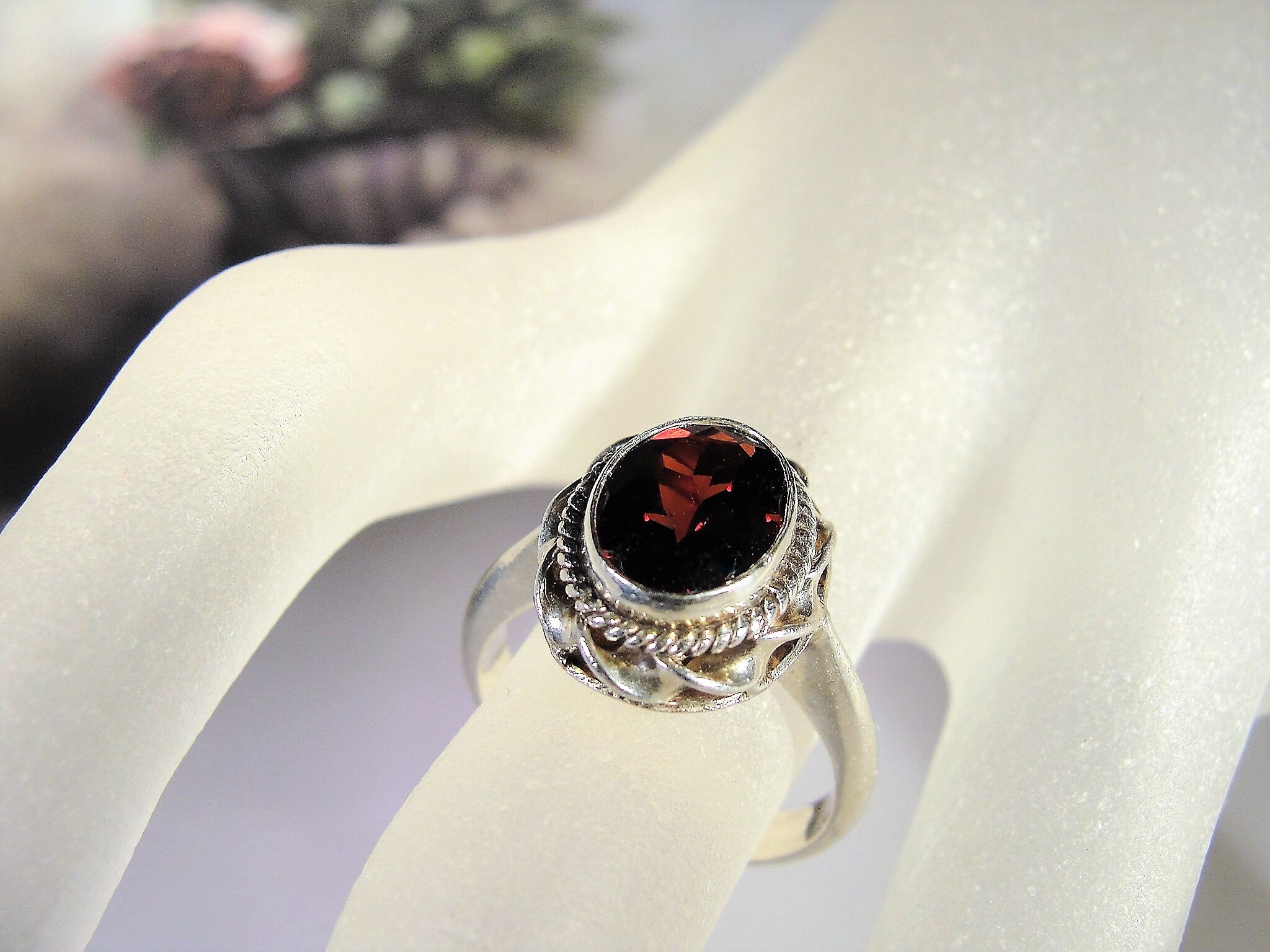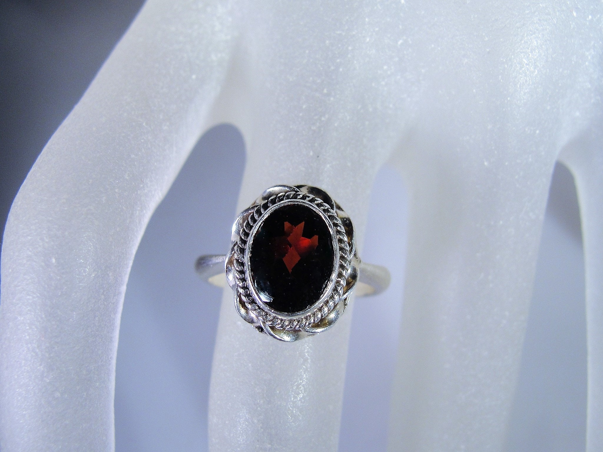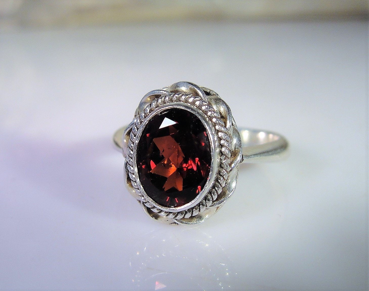 Beautiful Genuine Oval Cut Garnet Ring bezel set in Sterling Silver. Around the mounting is a wonderful braided design that just enhances the look of the ring. This ring presents very well and is easily a perfect every day ring!