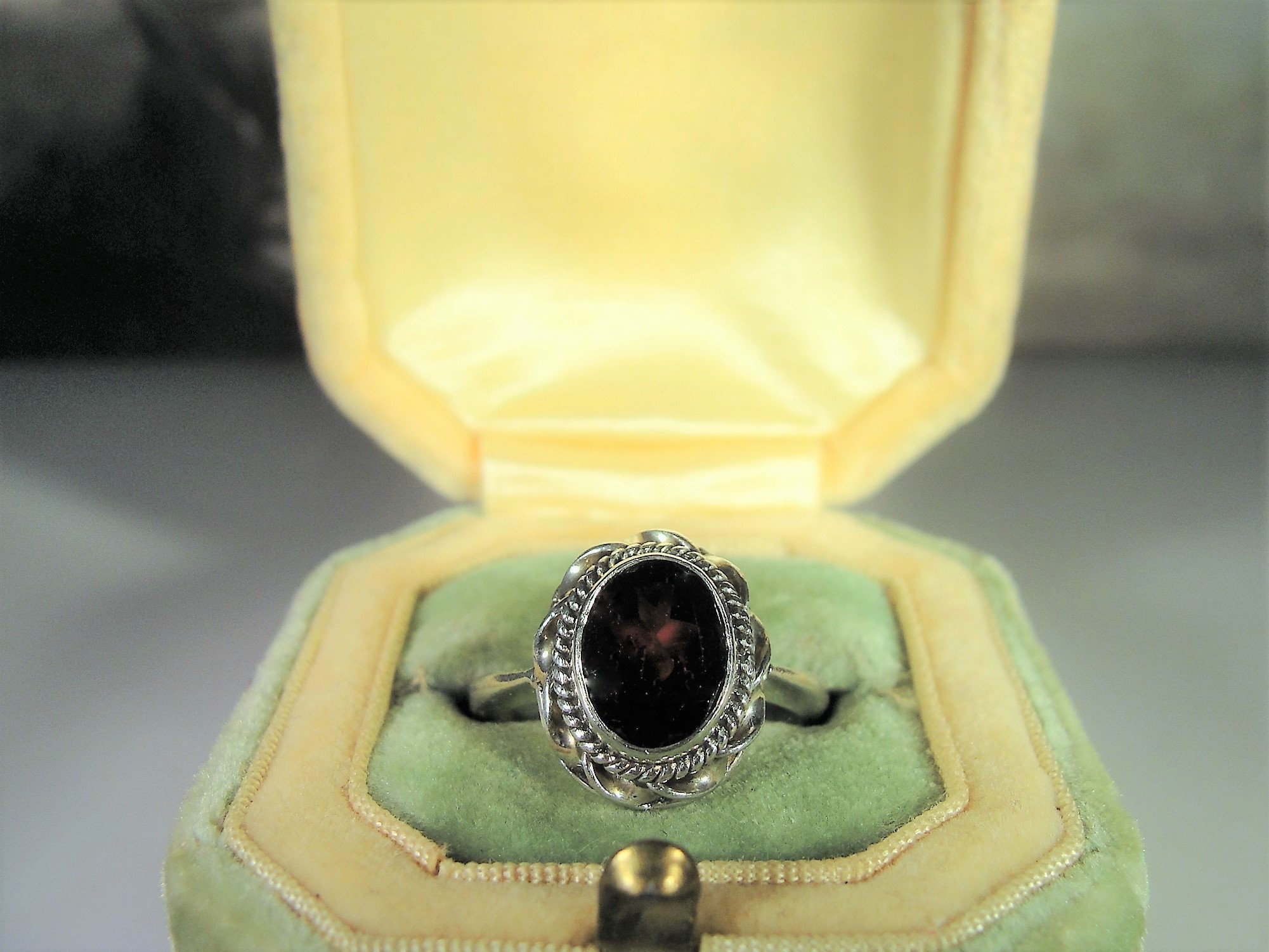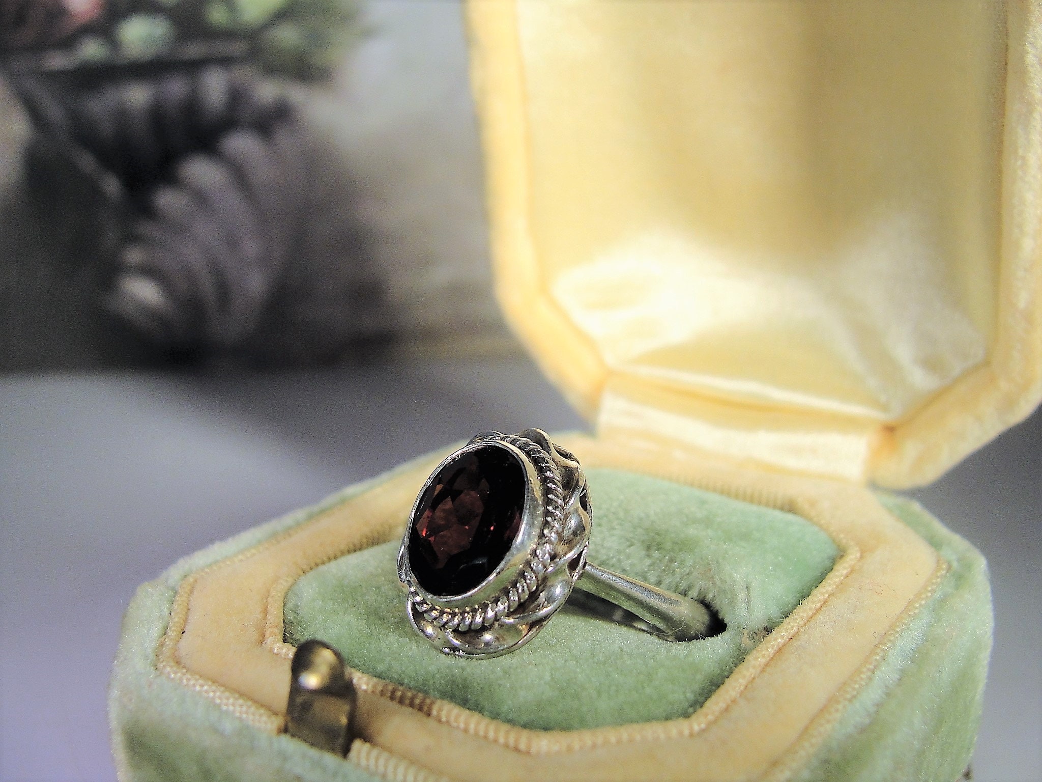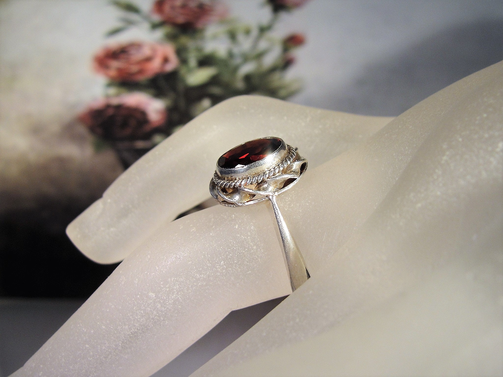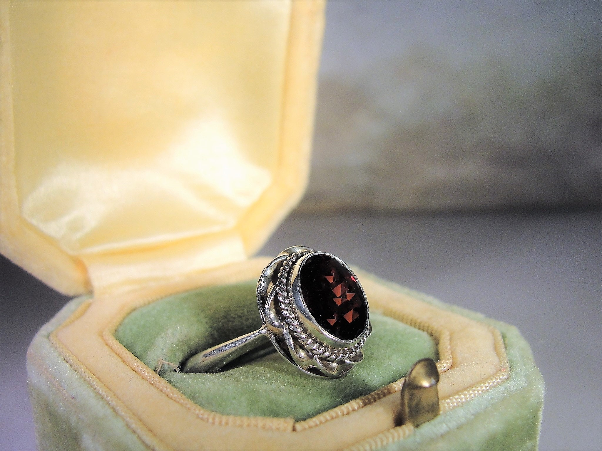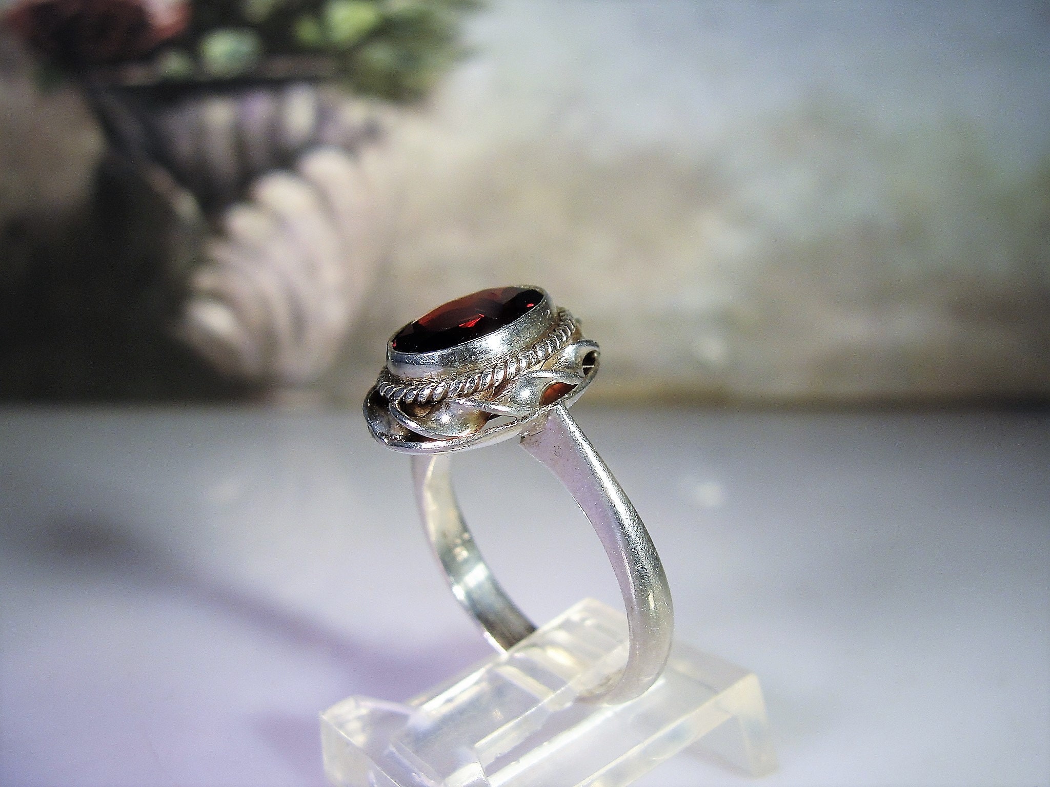 Beautiful Genuine Oval Cut Garnet Ring bezel set in Sterling Silver. Around the mounting is a wonderful braided design that just enhances the look of the ring. This ring presents very well and is easily a perfect every day ring!