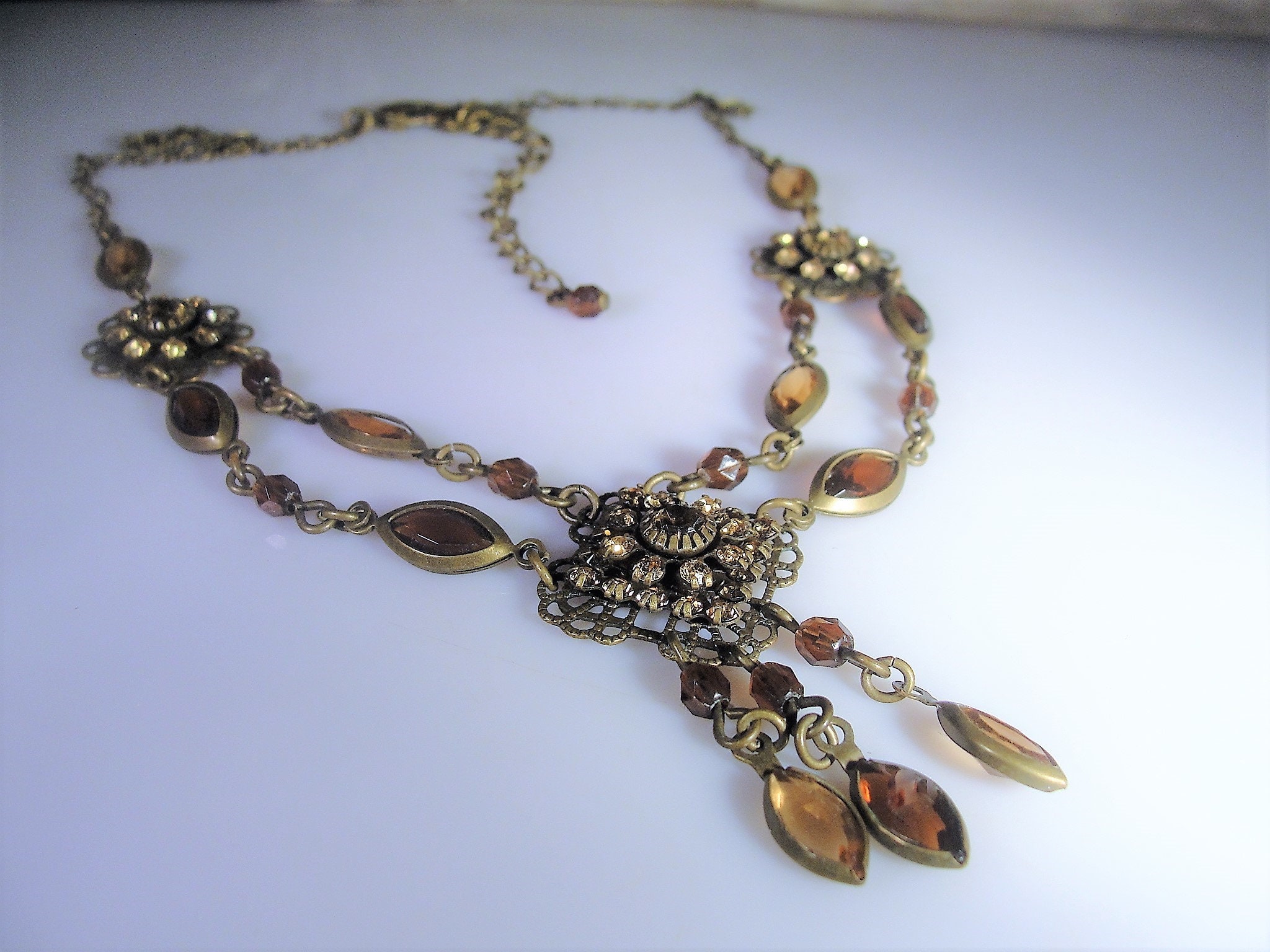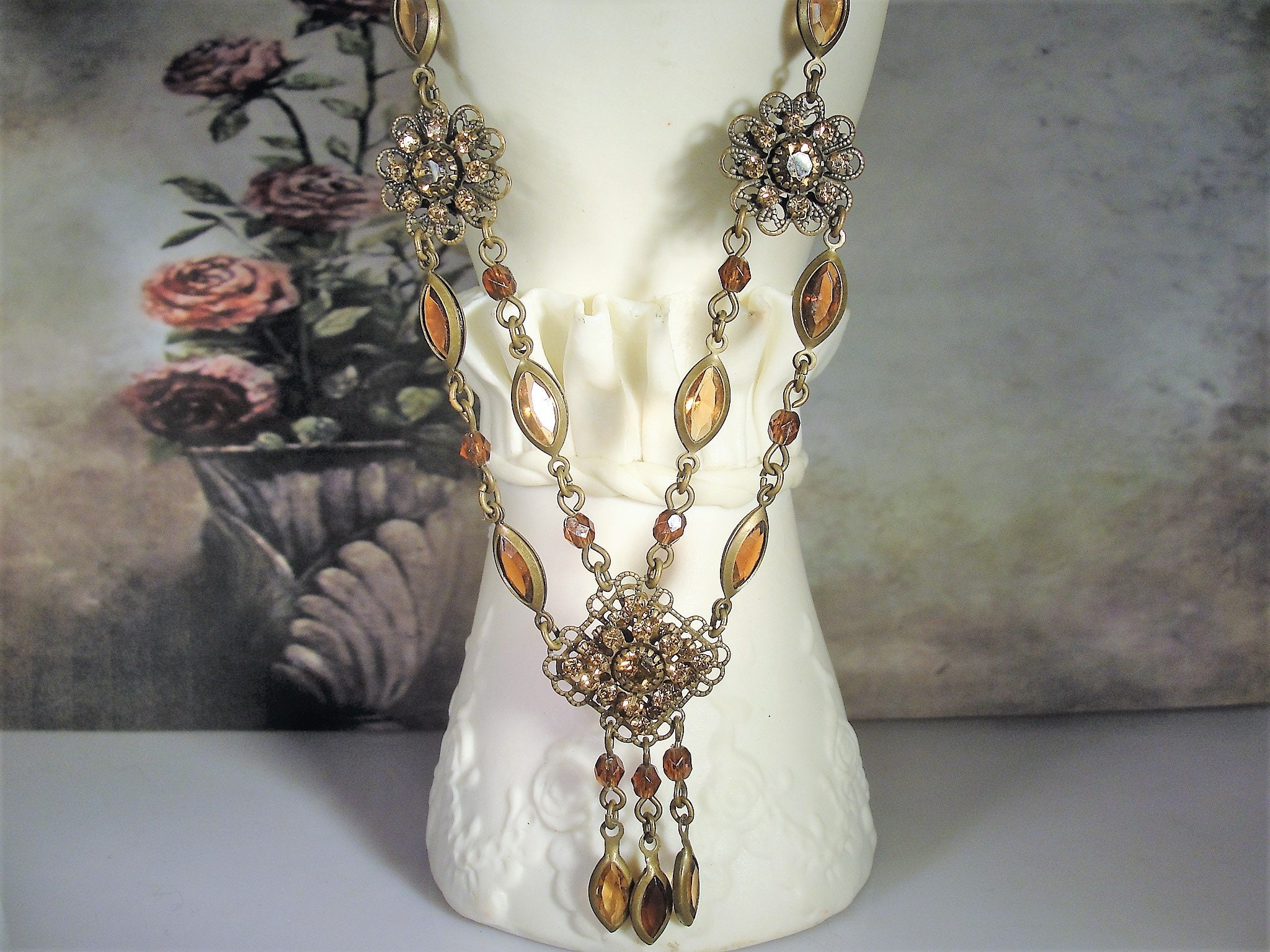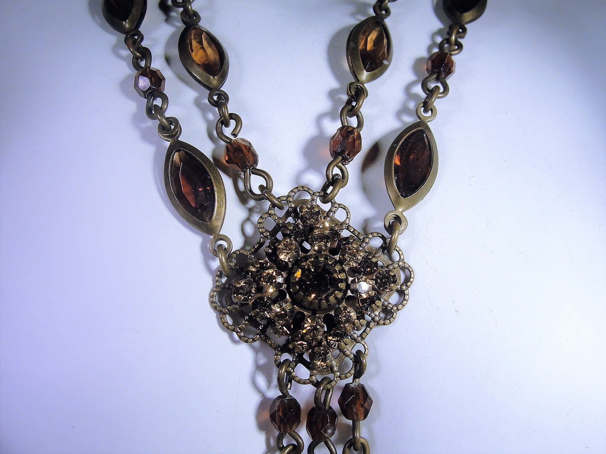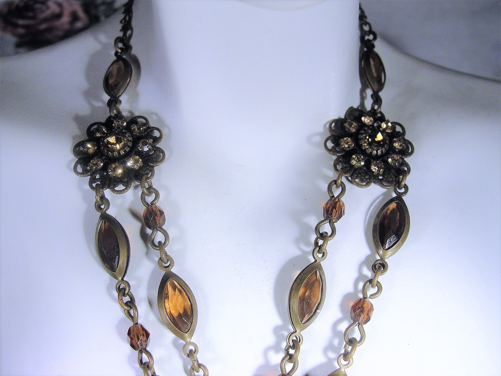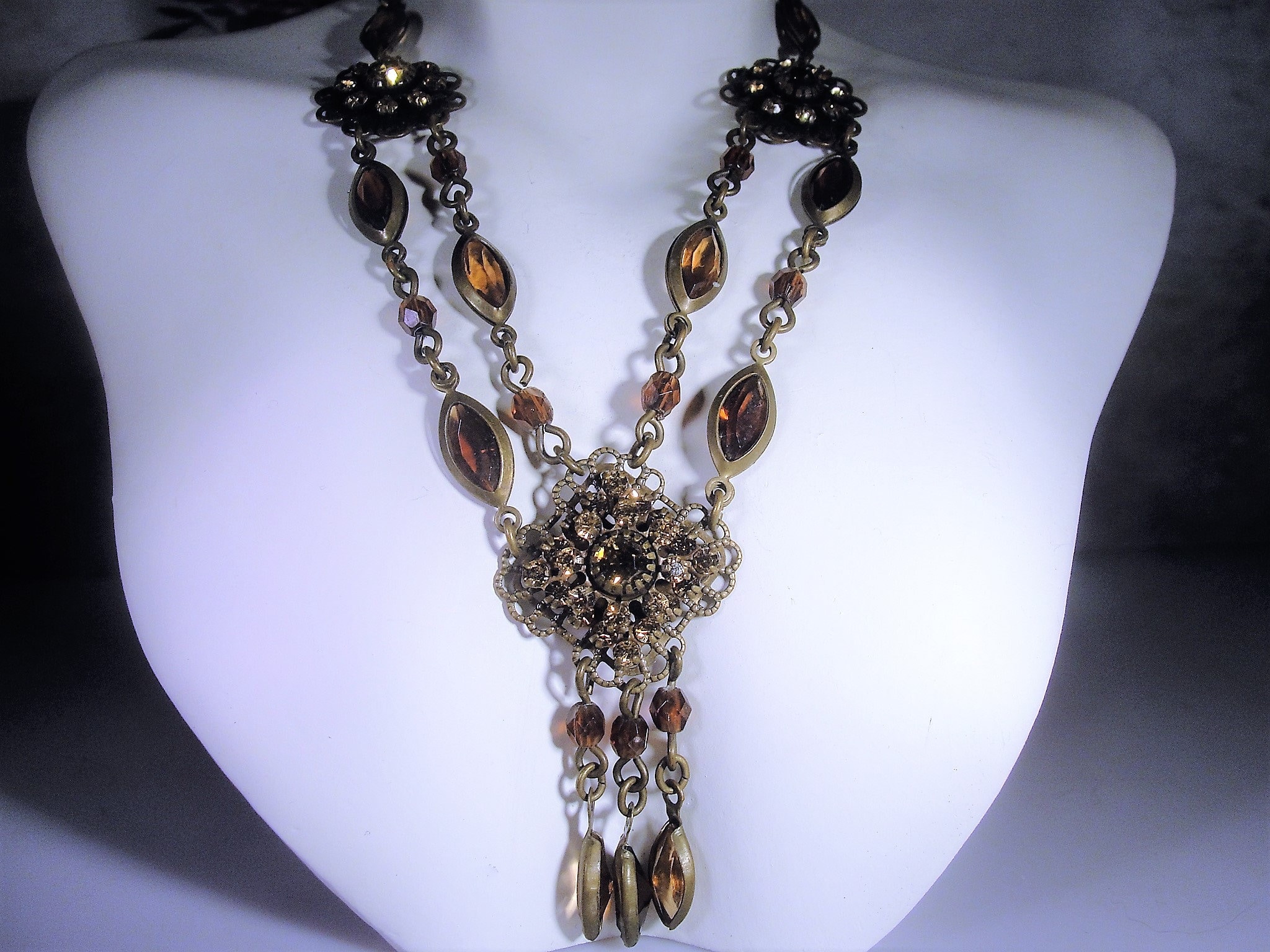 This is a gorgeous brass necklace that has marquise shaped brown topaz and amber colored crystals throughout. There are also round champagne crystals that are set in a flower motif. This necklace has its original patina making the brass appear very dark. But it is a beautiful and feminine necklace that is striking when worn!