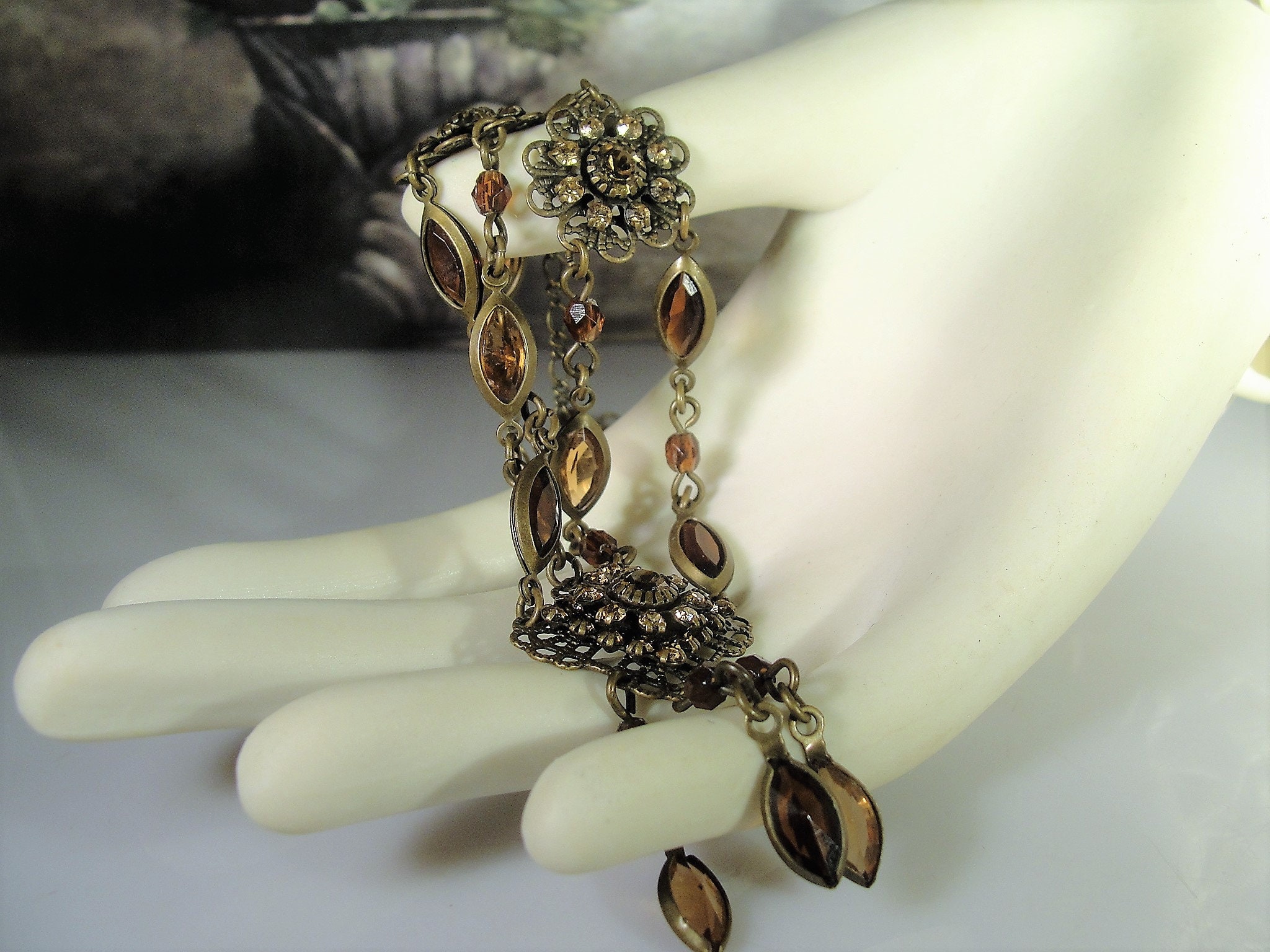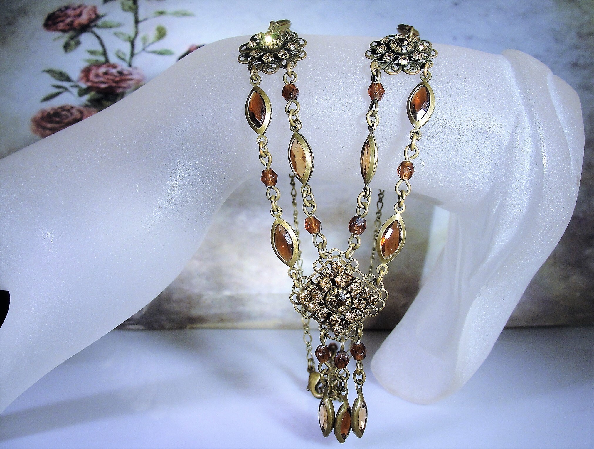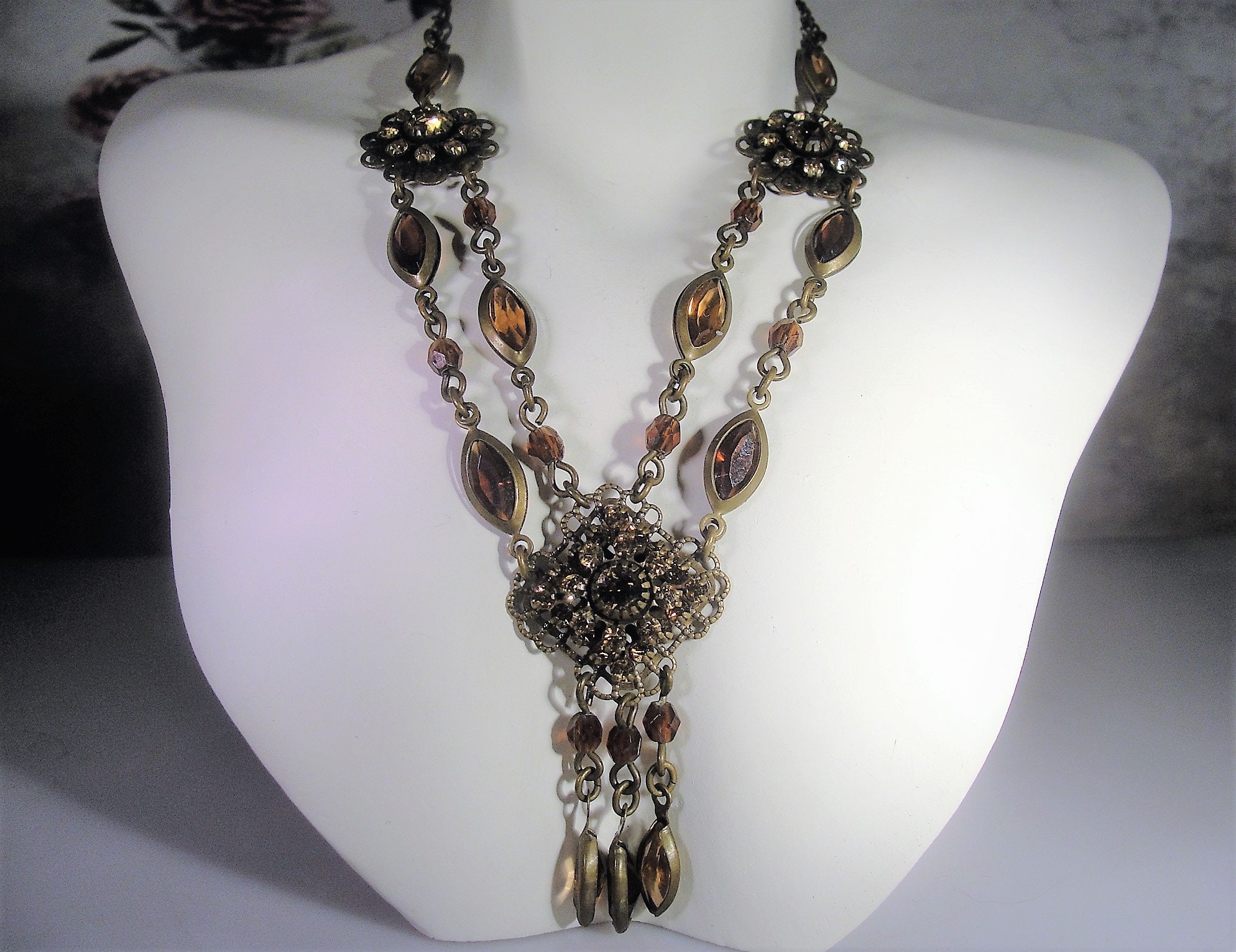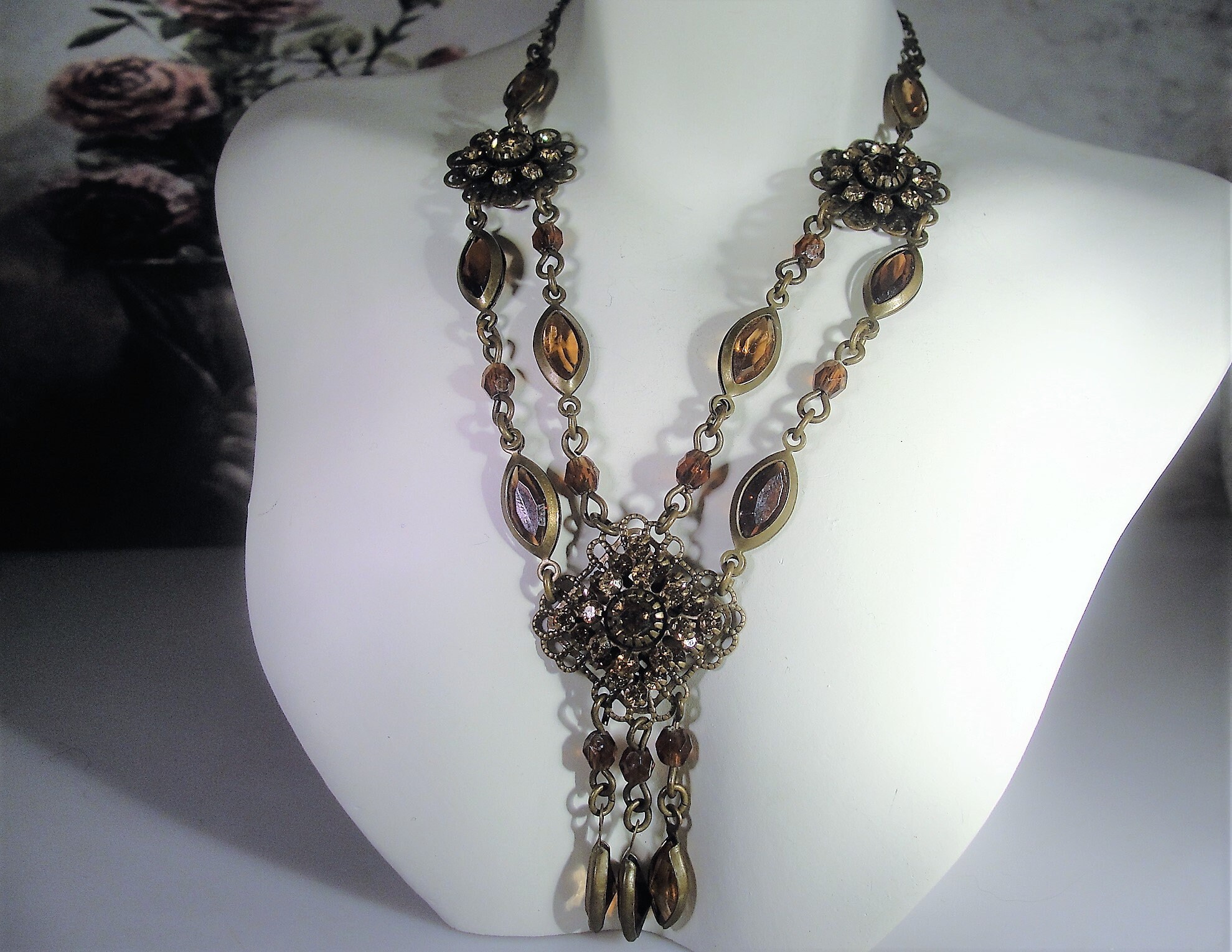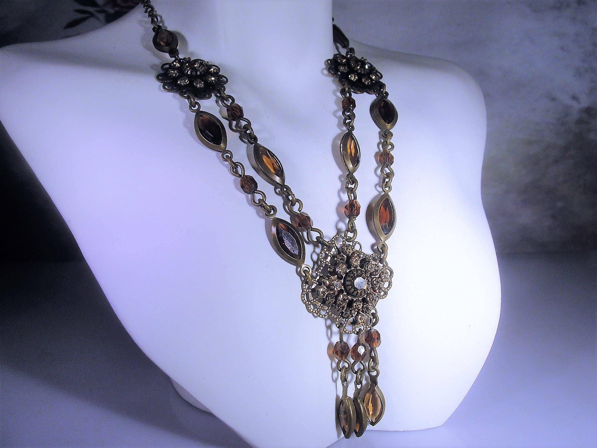 This is a gorgeous brass necklace that has marquise shaped brown topaz and amber colored crystals throughout. There are also round champagne crystals that are set in a flower motif. This necklace has its original patina making the brass appear very dark. But it is a beautiful and feminine necklace that is striking when worn!
