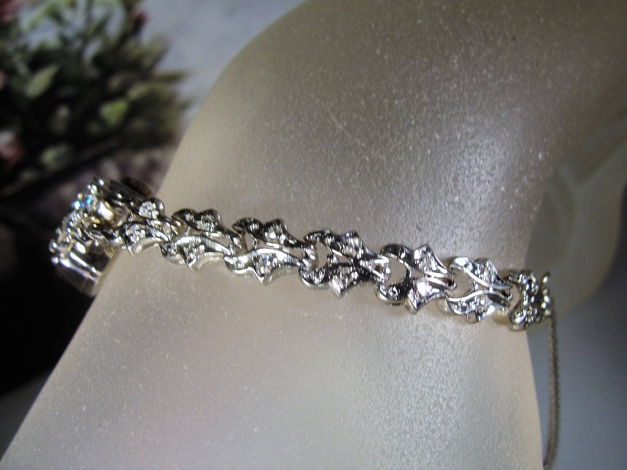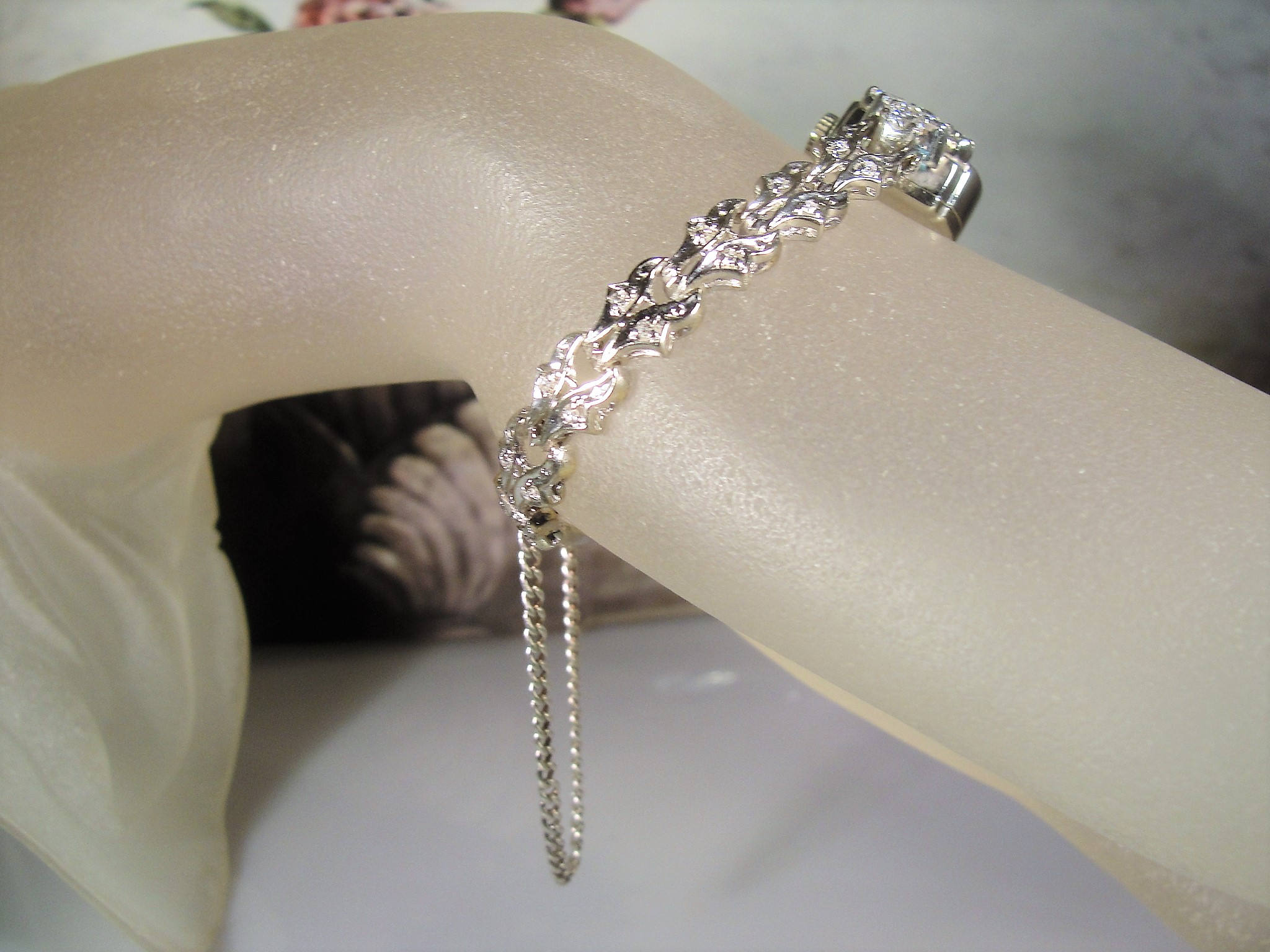 The face of the watch has silver numbers and little silver boxes where numbers would be for 1, 2, 4, 5, 7, 8, 10 and 11. The hands are silver and there is no second hand on this watch. This watch is mechanical and needs to be wound at least once a day and it does appear to be keeping accurate time. There is a nice double clasp and safety chain on the clasp for a very secure fit. This is really a gorgeous watch with great sparkle and presentation.