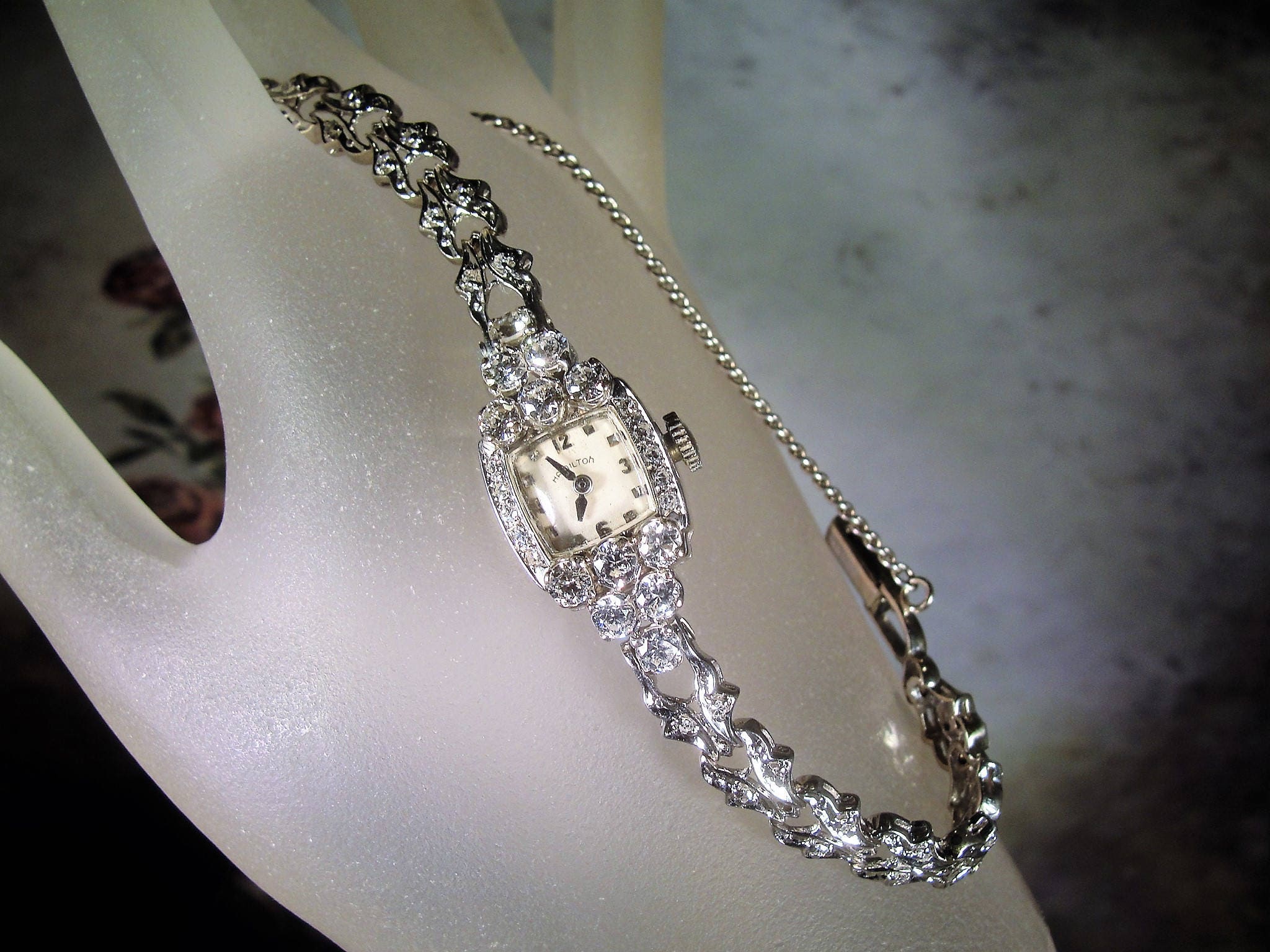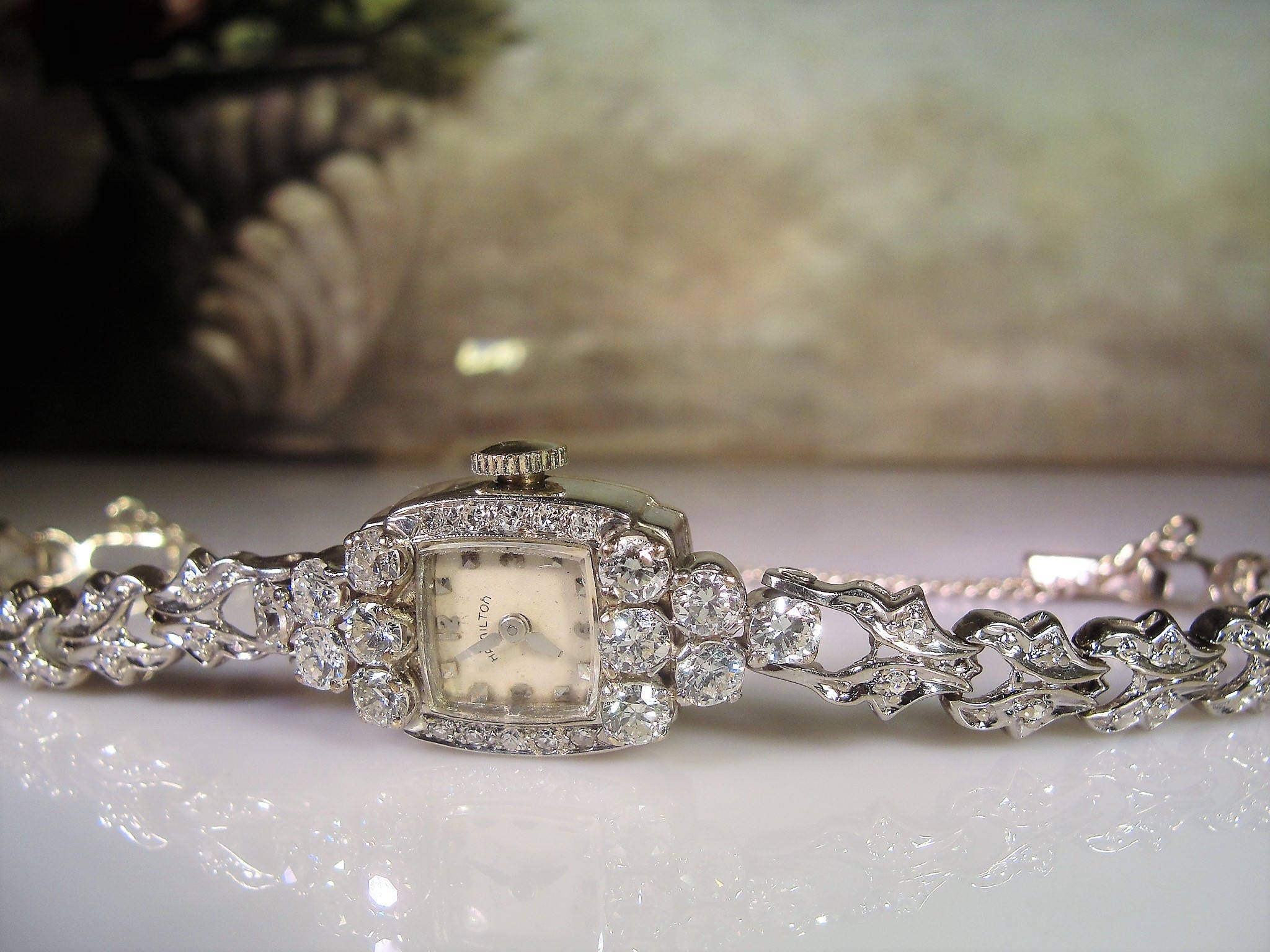 This is a gorgeous genuine Diamond Watch that is done in 14K White Gold by the Hamilton Company circa 1950s. This diamond watch has six 3.5mm diamonds on the top and bottom of the face of the watch in the shape of a triangle. There are also small genuine diamonds that go all the way around the face of the watch. And there are also small diamonds throughout the very lovely and decorative watch band, also being 14K White Gold.