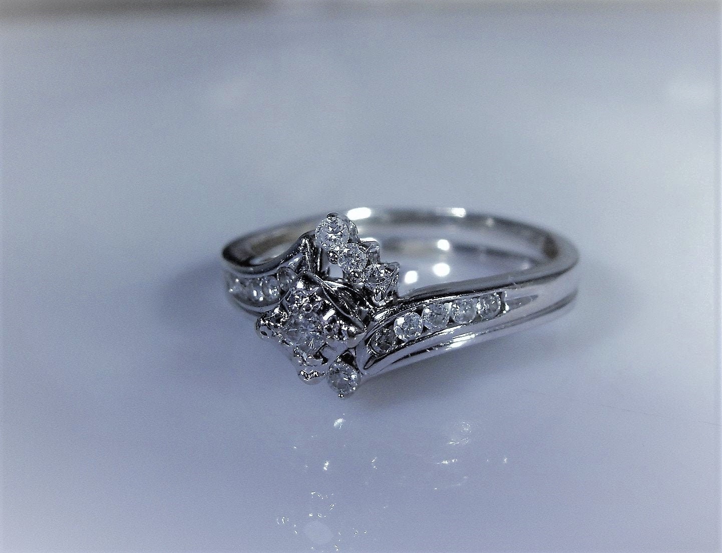 For your consideration, we have today, this gorgeous White Gold Diamond Bridal Ring Set. This ring set has genuine diamonds throughout and it is so very cute!! There are channel set diamonds that slide down each side of the band and a solitaire diamond set in a higher mounting. The wedding band interlocks with the Engagement Ring with several very nice diamonds nestled on the top and bottom of the Engagement Rings mounting. A beautiful and original diamond set for a person that loves the petite or minimalist look!