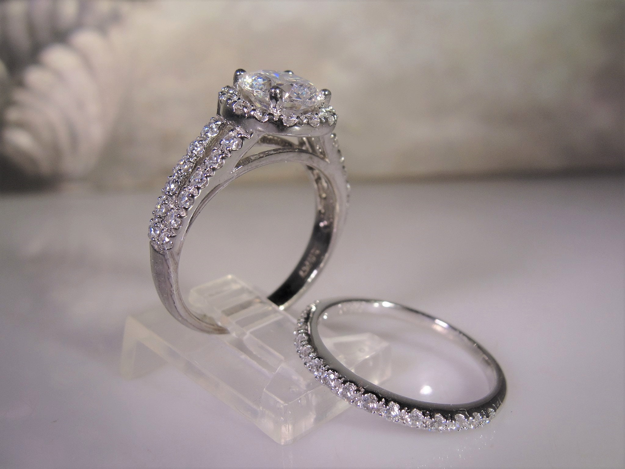 This is a Sterling Silver Cubic Zirconia Diamond Bridal Ring Set that was used by my retired jeweler friend to show her customers what this set would actually look like when made with real diamonds. This ring set was in her display case for years and these rings have never been worn for personal use. They are considered a display model.