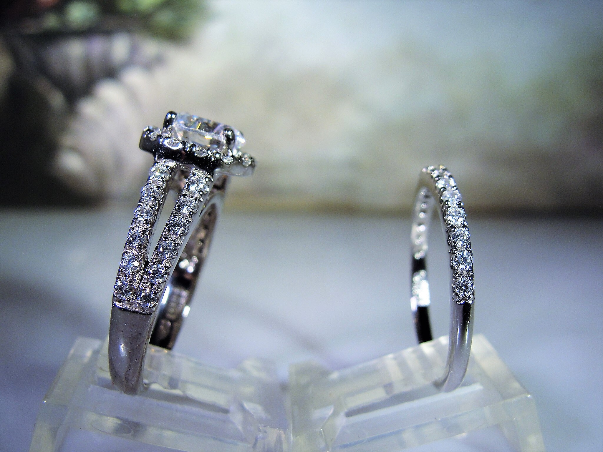 This is a beautiful bridal ring set that consists of Sterling Silver as a base metal and Cubic Zirconia gems. The bands are rhodium plated with white gold. The CZ gems are of the highest quality… so very true to life gems. These rings are a matched set and are beautiful together.