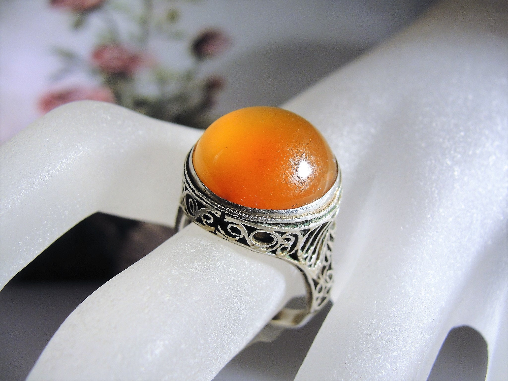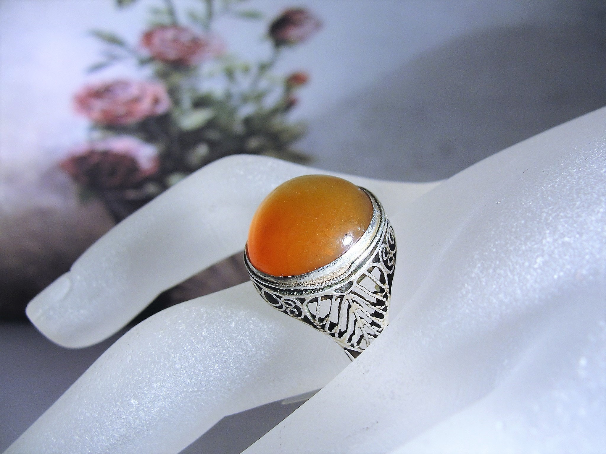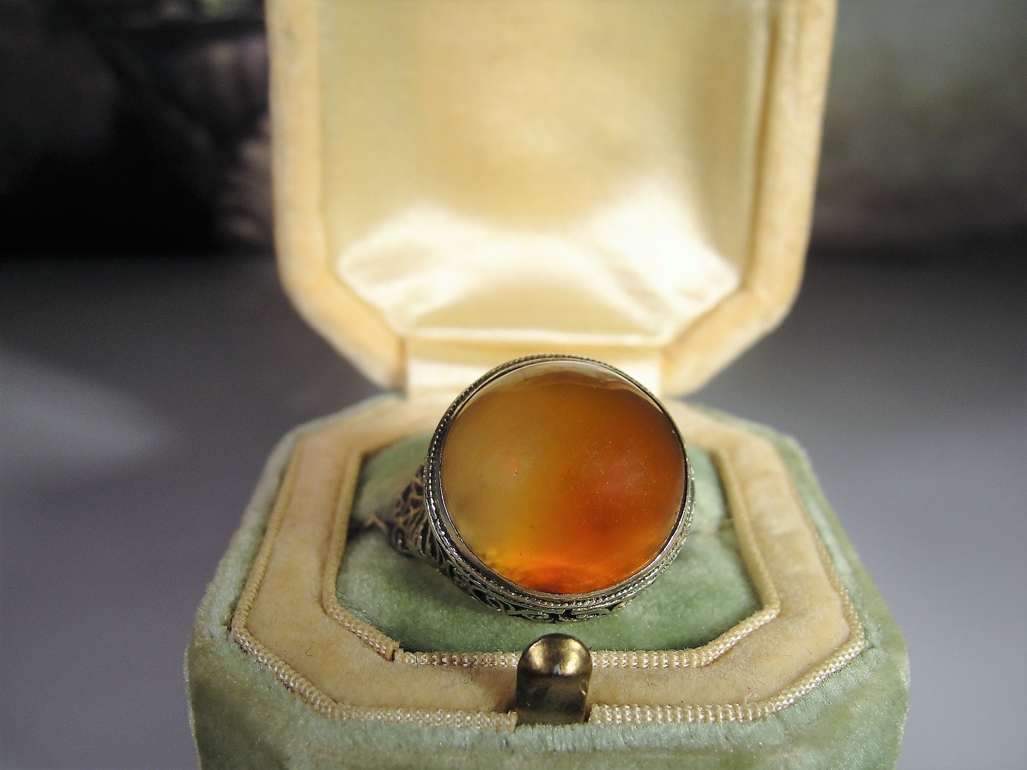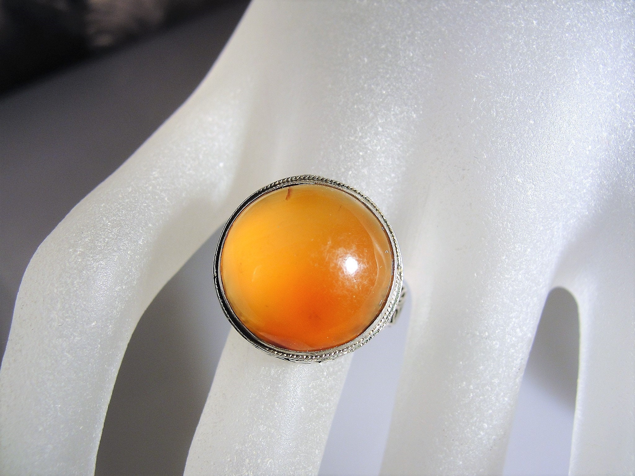 This is a gorgeous Edwardian ring that holds a round Amber Cabochon and it is Bezel set. The detail work is beautiful and surprisingly, this ring is adjustable for varying sizes.