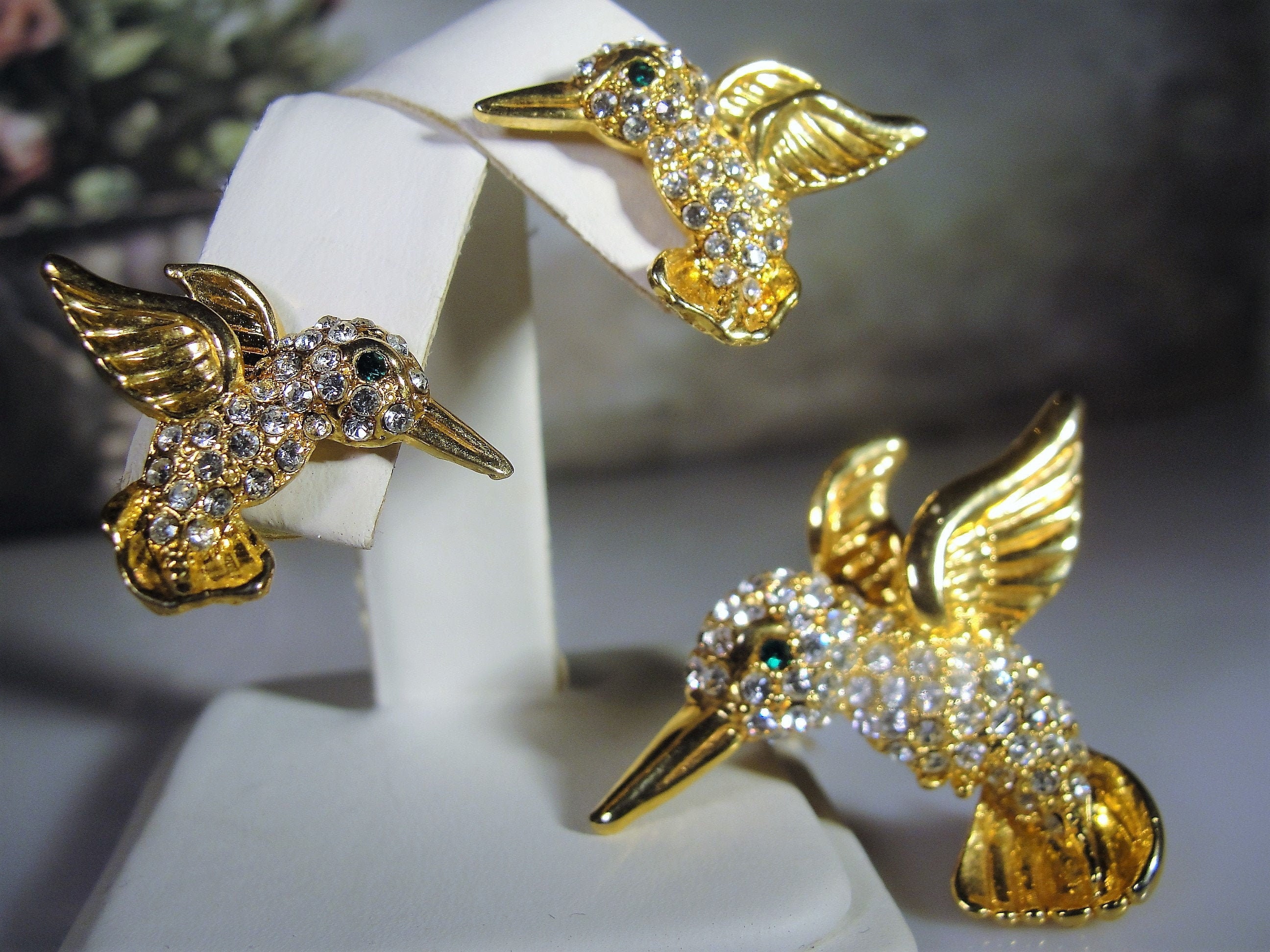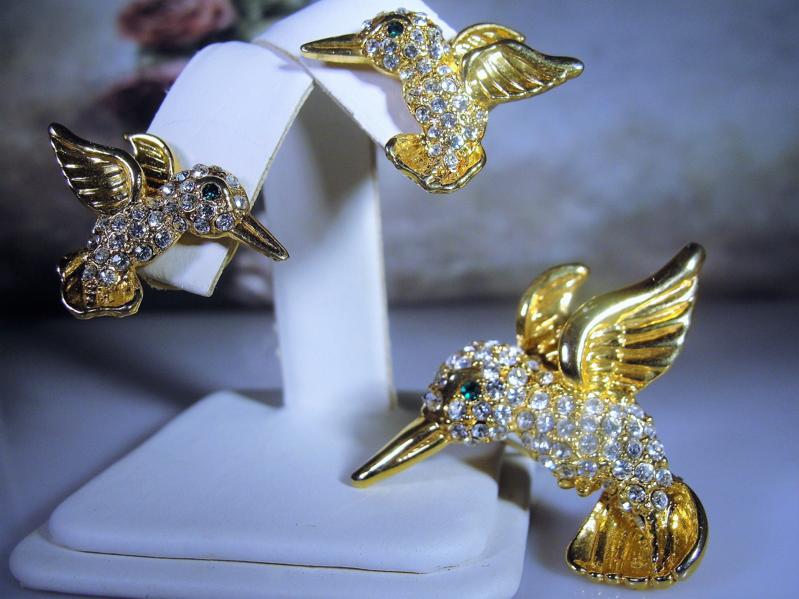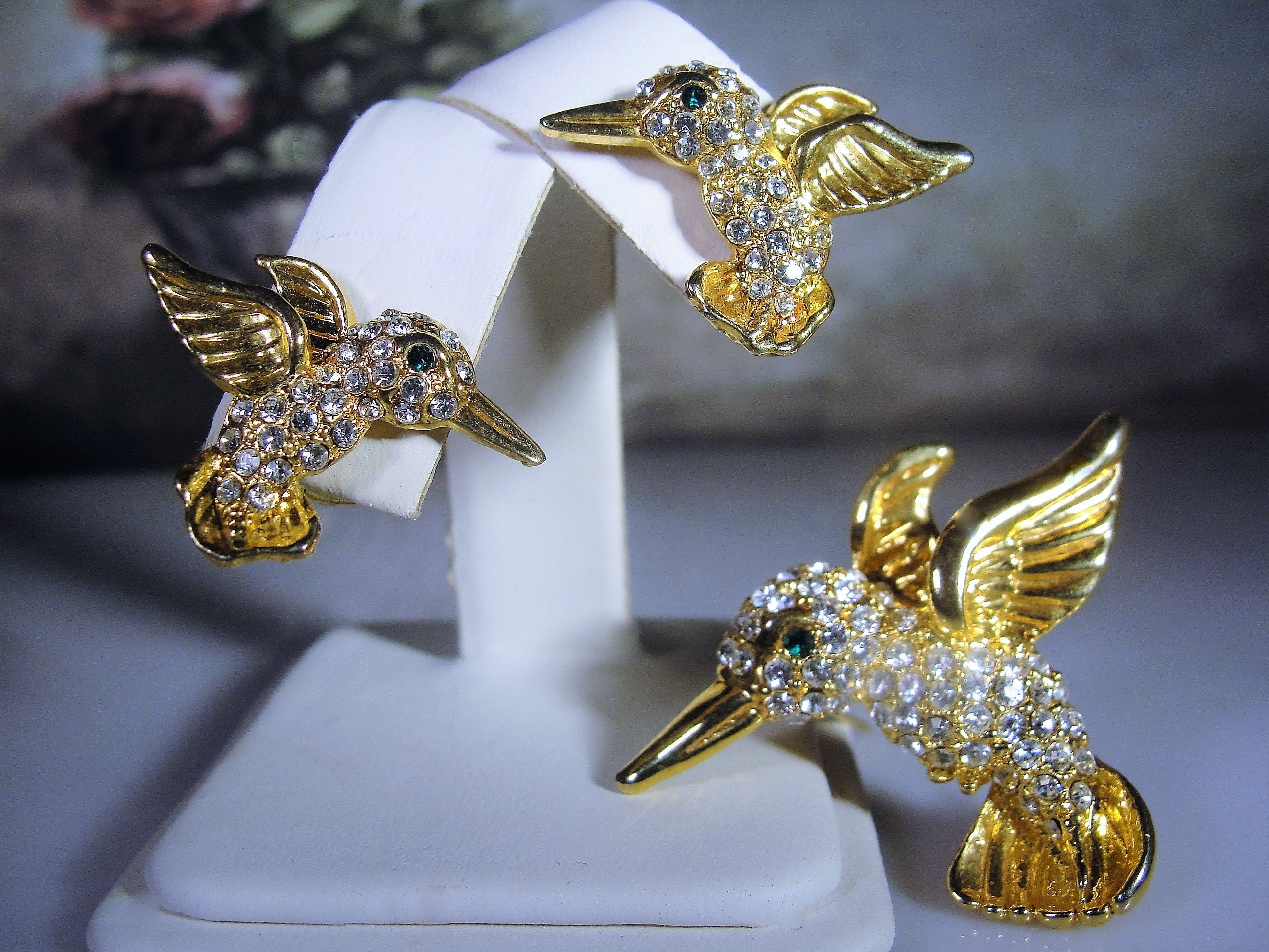 This is a lovely hummingbird brooch and matching earrings set. Each piece is encrusted with clear rhinestones and an emerald green eye. The bodies and feathers are done in yellow gold. This is a wonderful vintage brooch and matching earrings set from Circa 1960s.