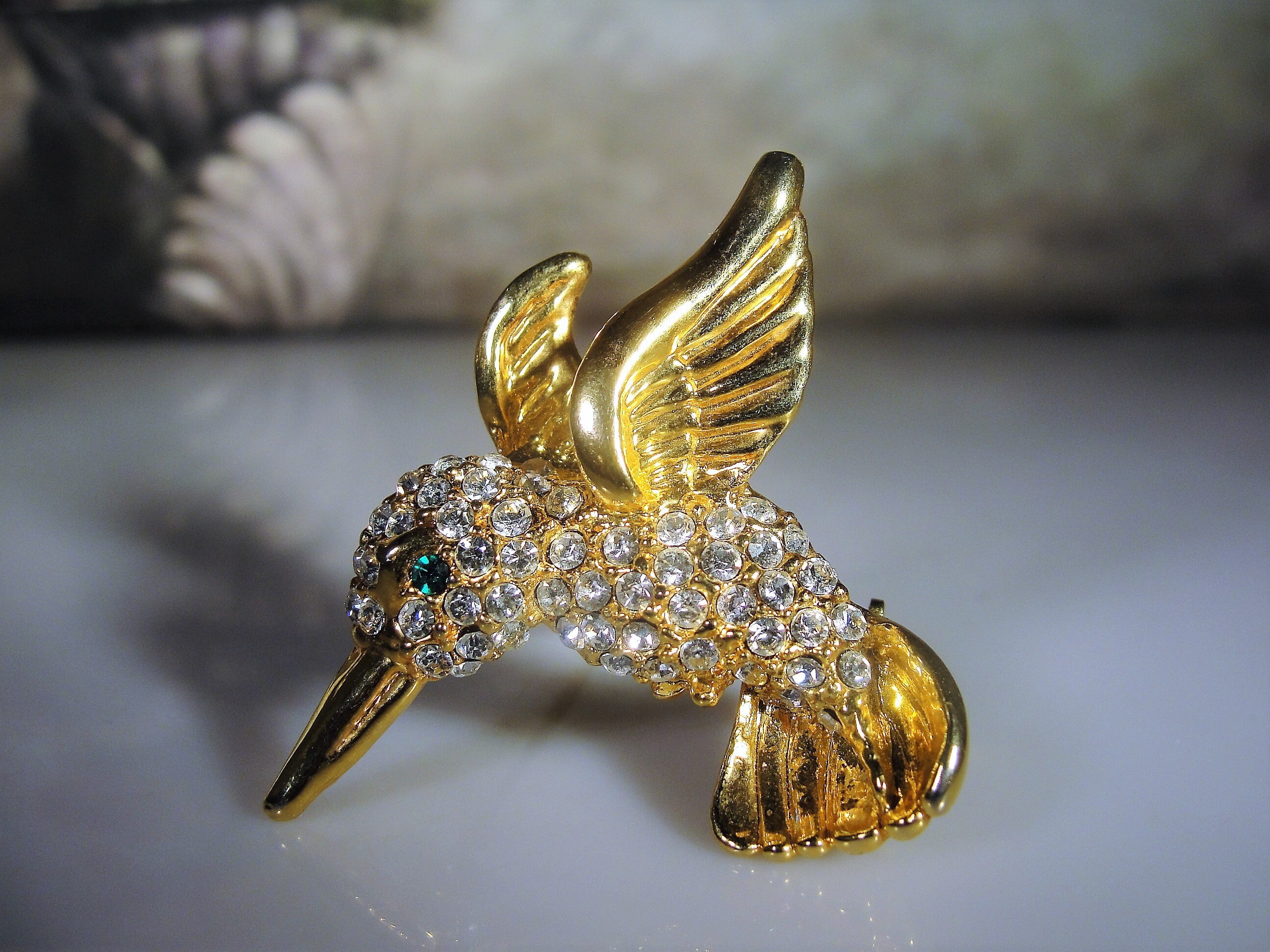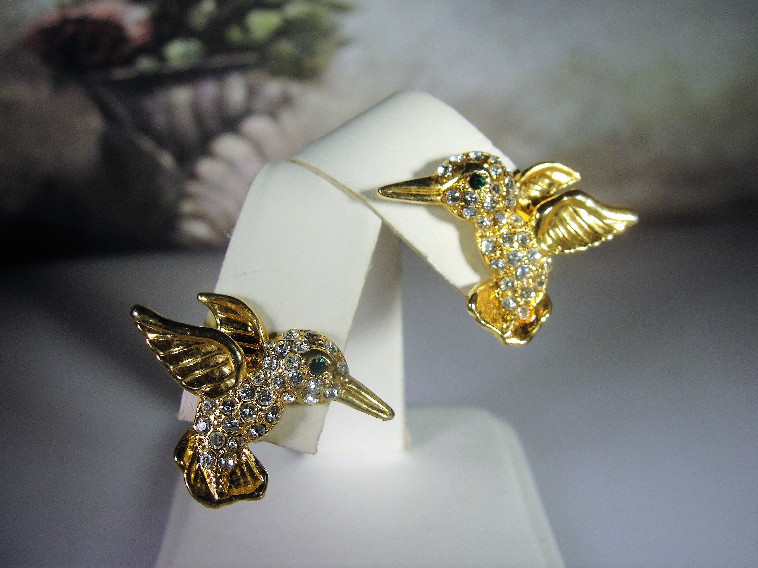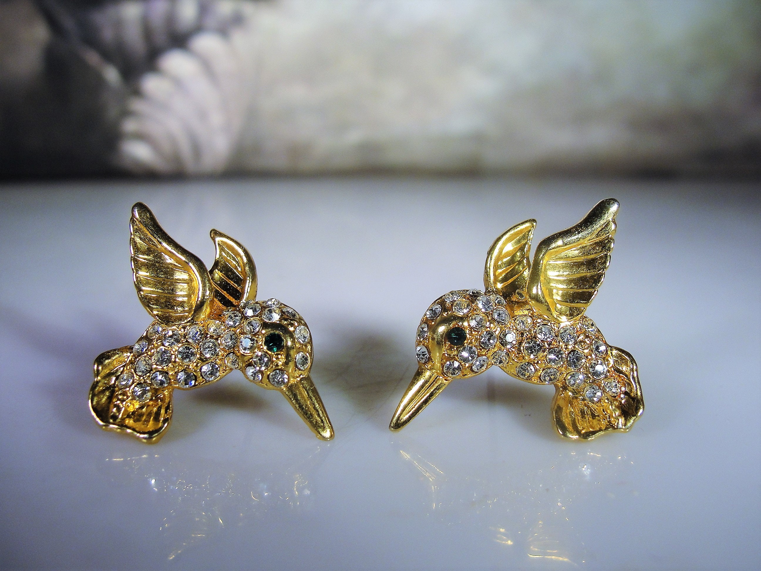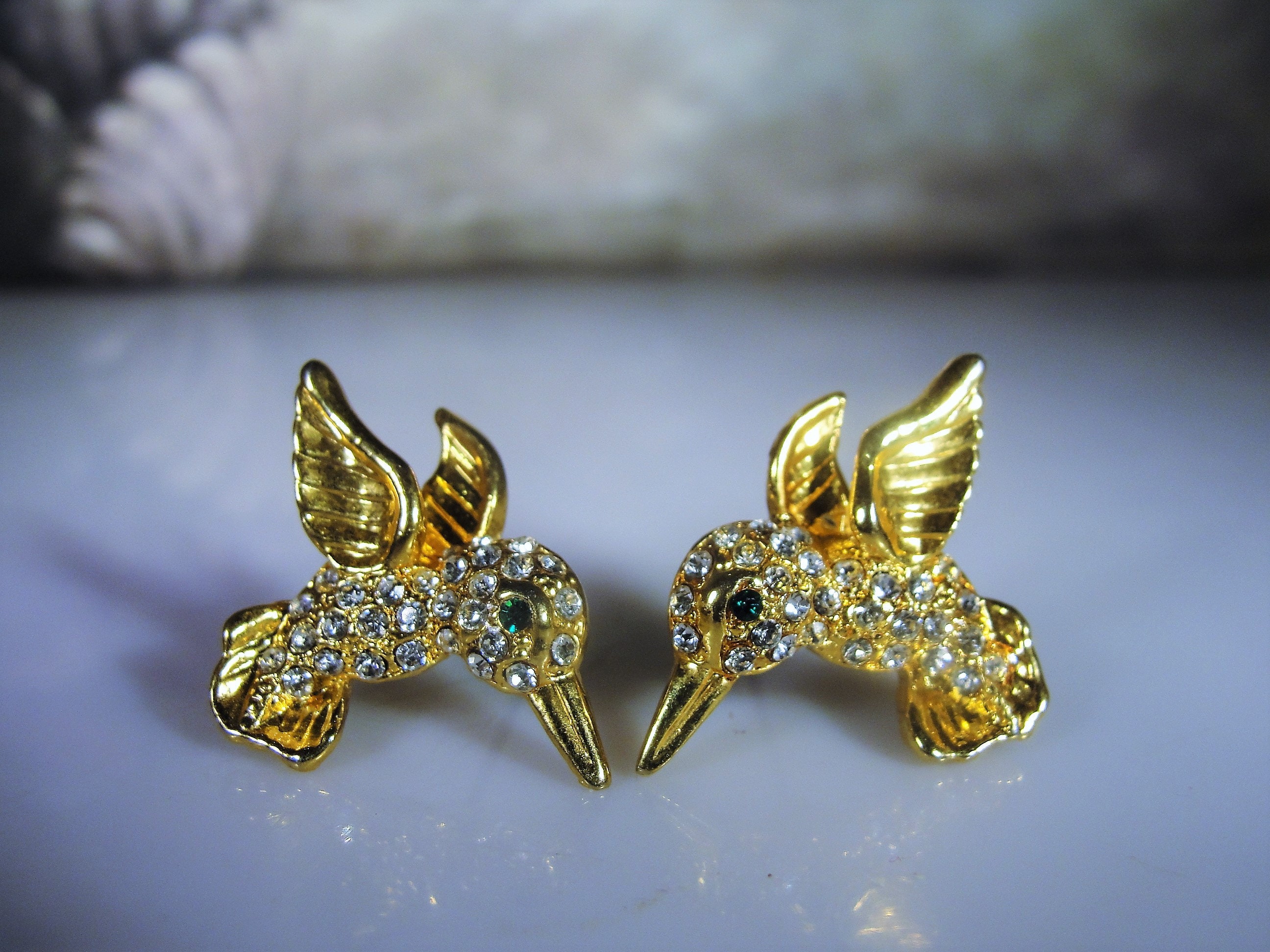 This is a lovely hummingbird brooch and matching earrings set. Each piece is encrusted with clear rhinestones and an emerald green eye. The bodies and feathers are done in yellow gold. This is a wonderful vintage brooch and matching earrings set from Circa 1960s.