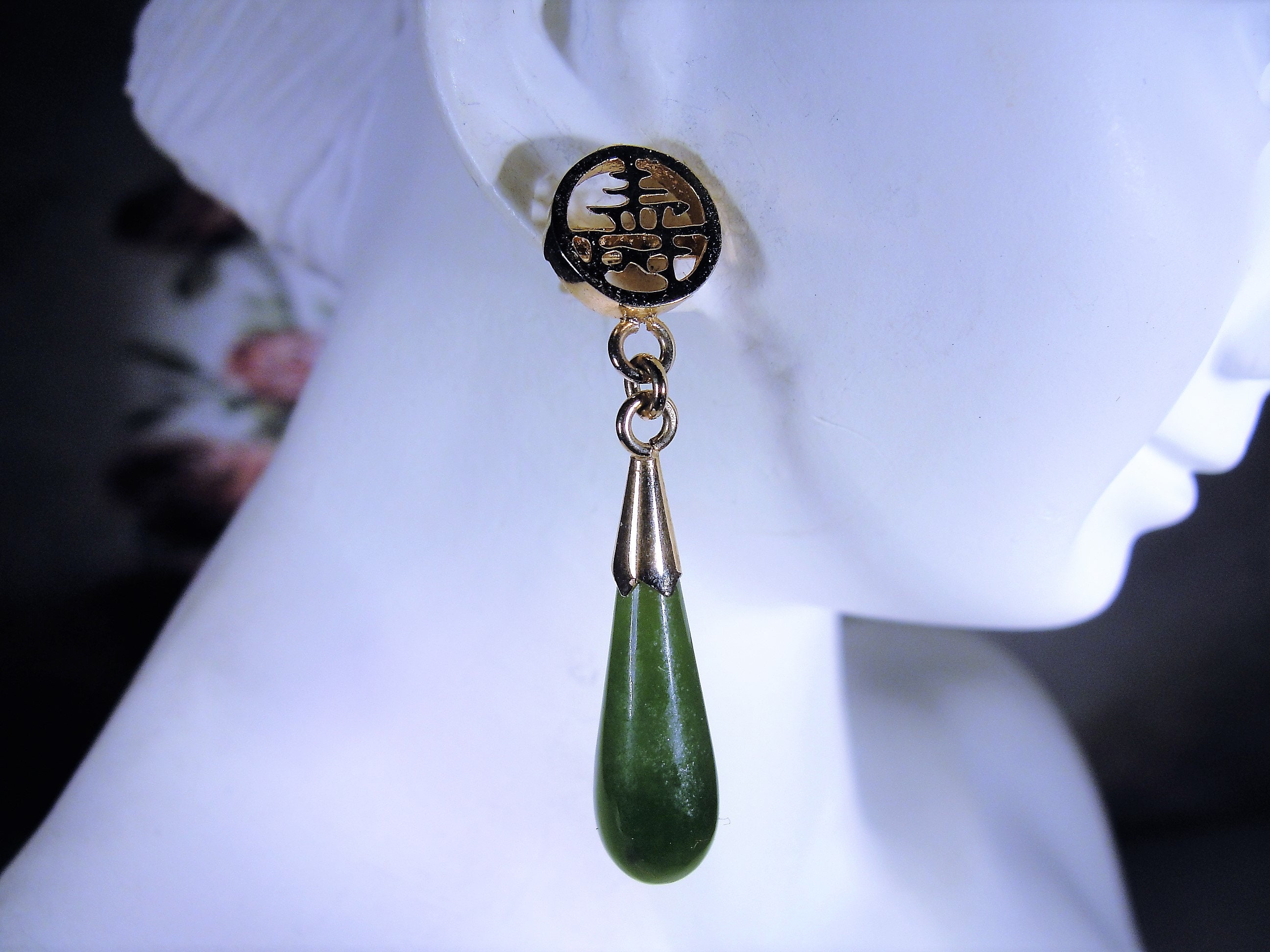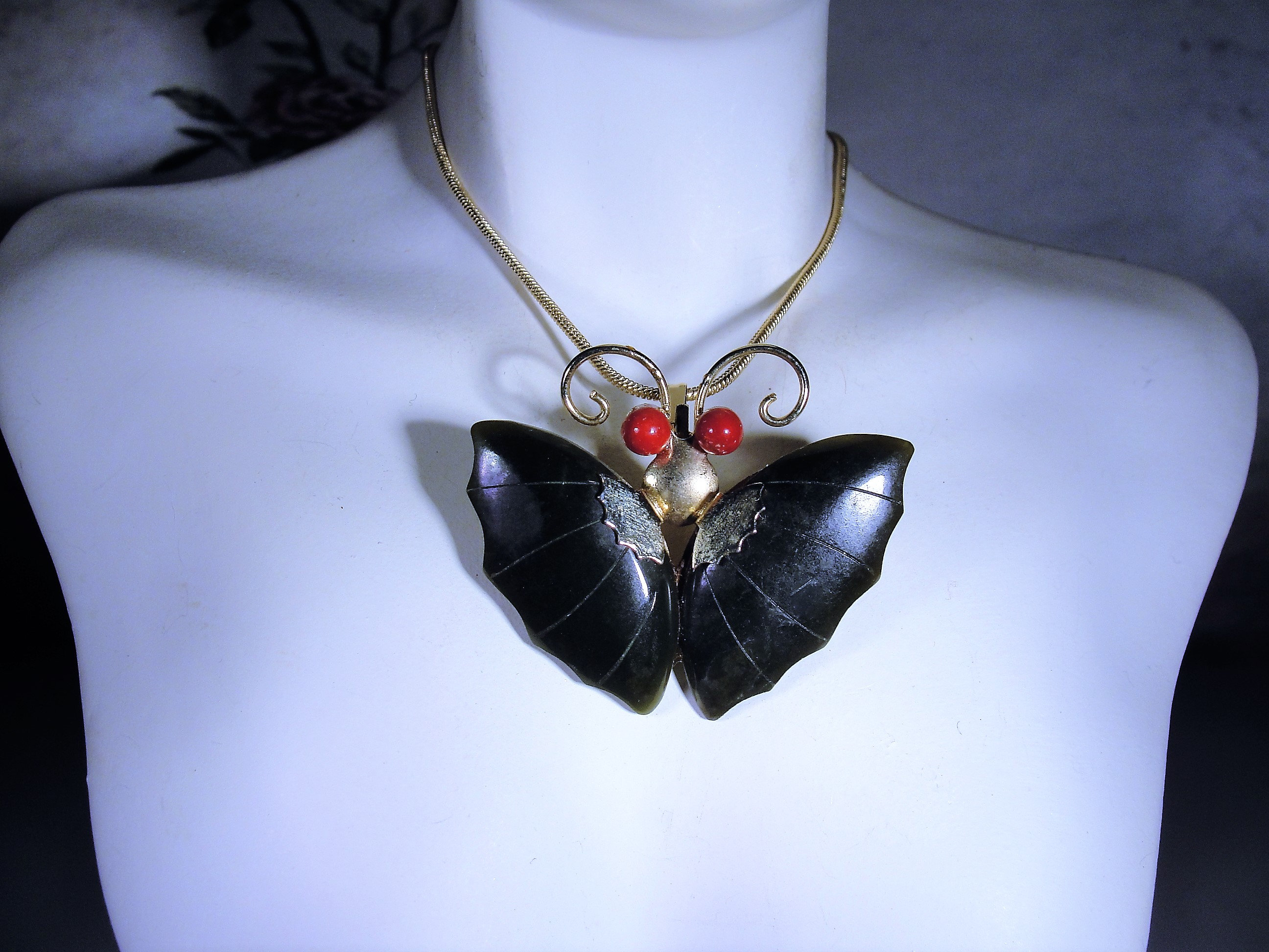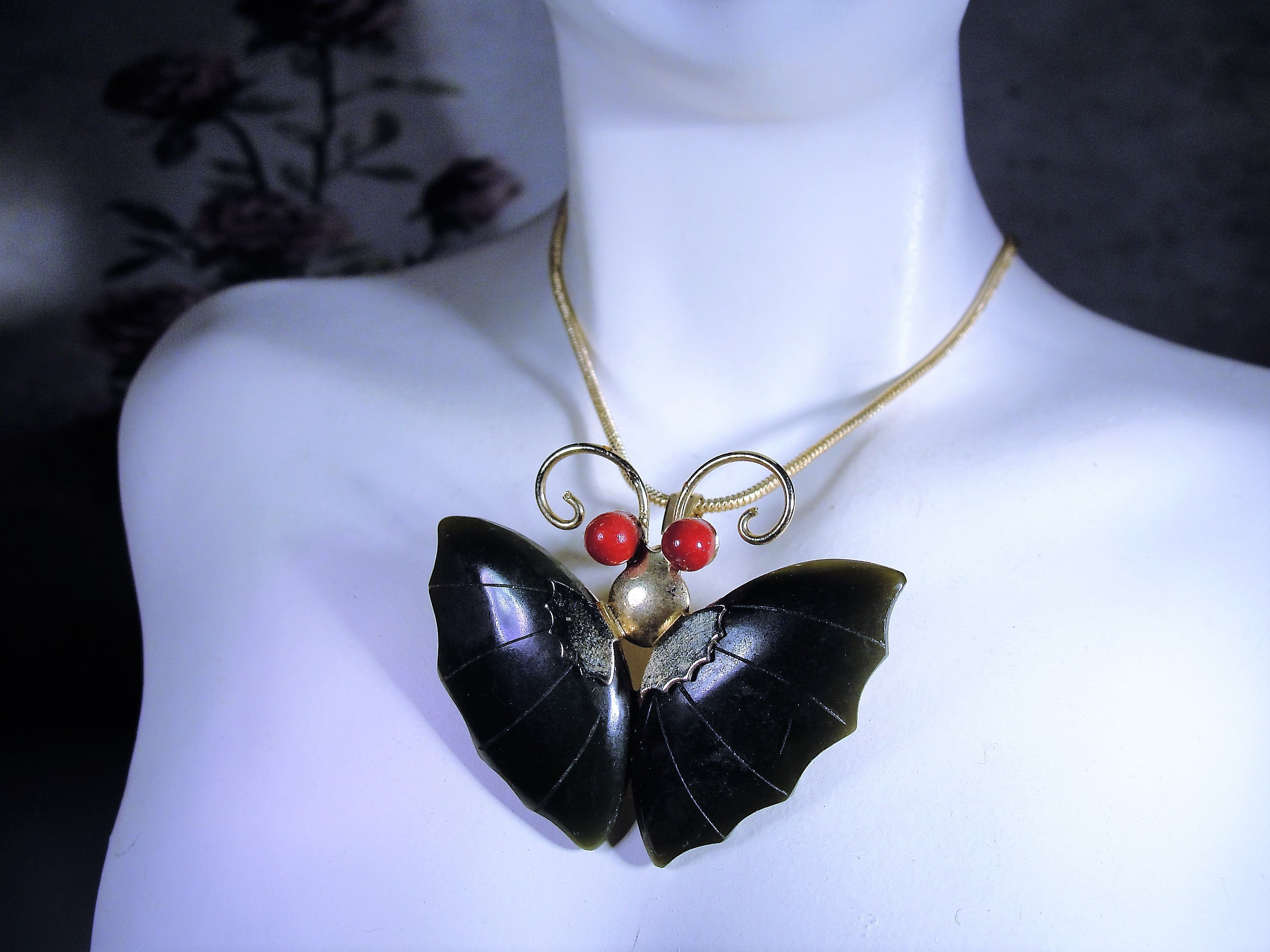 Inside, you will find a lovely collection consisting of a hand knotted medium spinach green 8mm jade beaded necklace that is 18 inches in length with a gold filled clasp, a pair of gold tone dangle medium green jade earrings with Chinese markings at the top; I believe they may be the signs for prosperity. A beautiful jade tube bracelet with round Chinese emblems set in between each jade tube. This bracelet is closer to a dark spinach green color with some variations of color in the jade. And finally, a wonderful convertible butterfly brooch that has bright red eyes and dark green jade wings with gold trim.