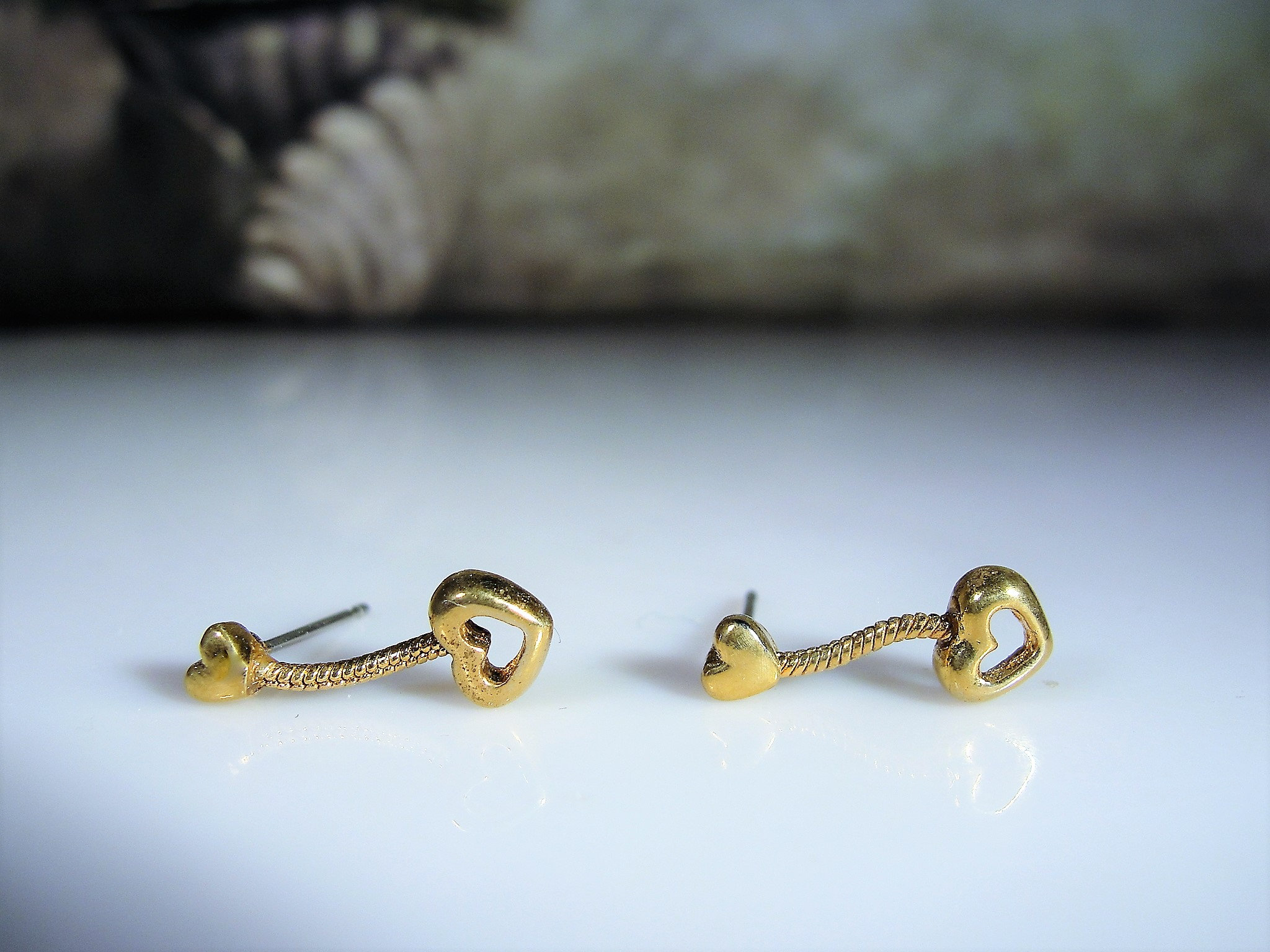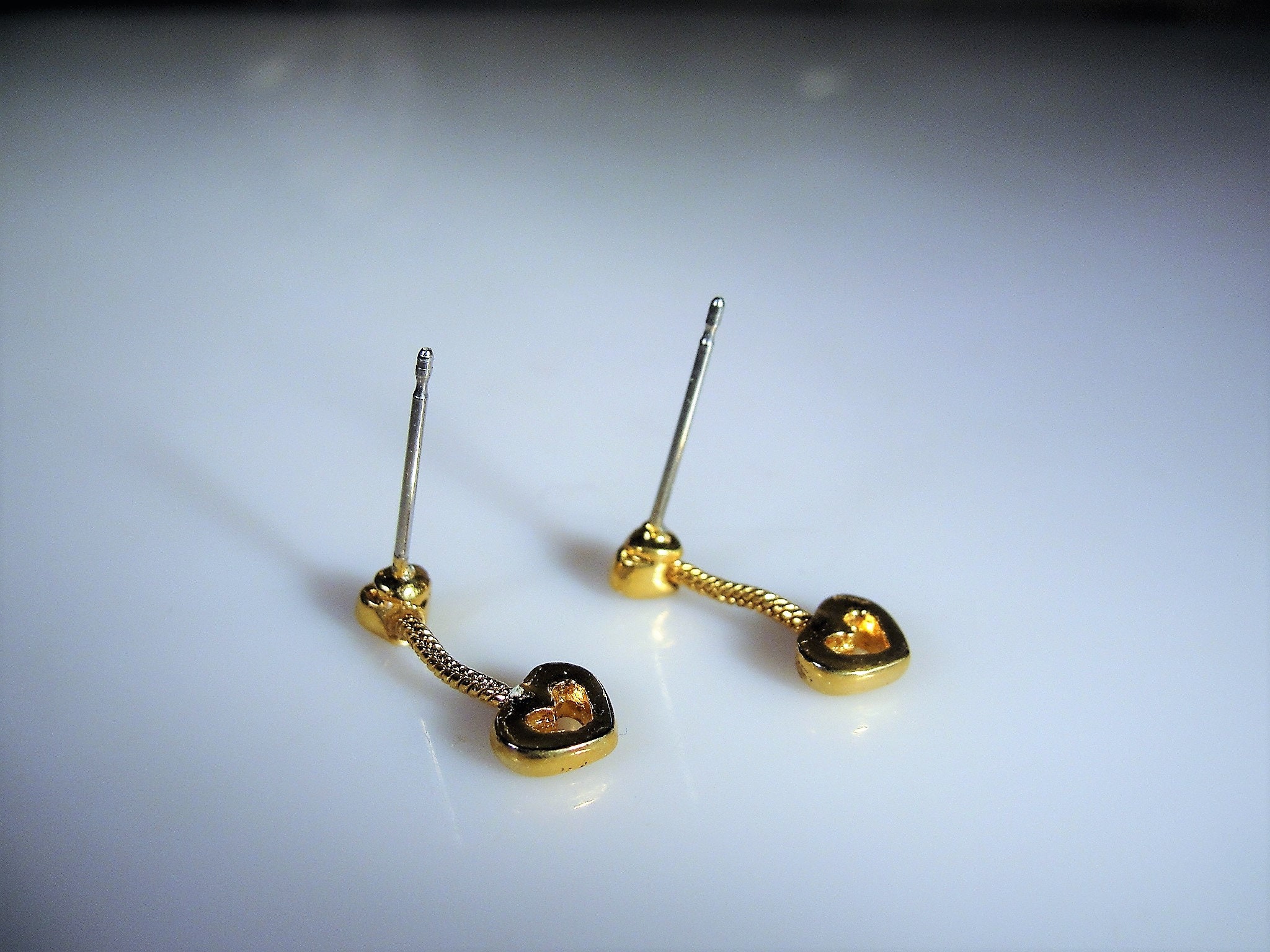 This is a very cute gold heart dangle earrings where there is a small heart at the top of the earrings, a snake chain with another larger heart at the bottom of the earrings. Simple, clean but makes a lovely statement!