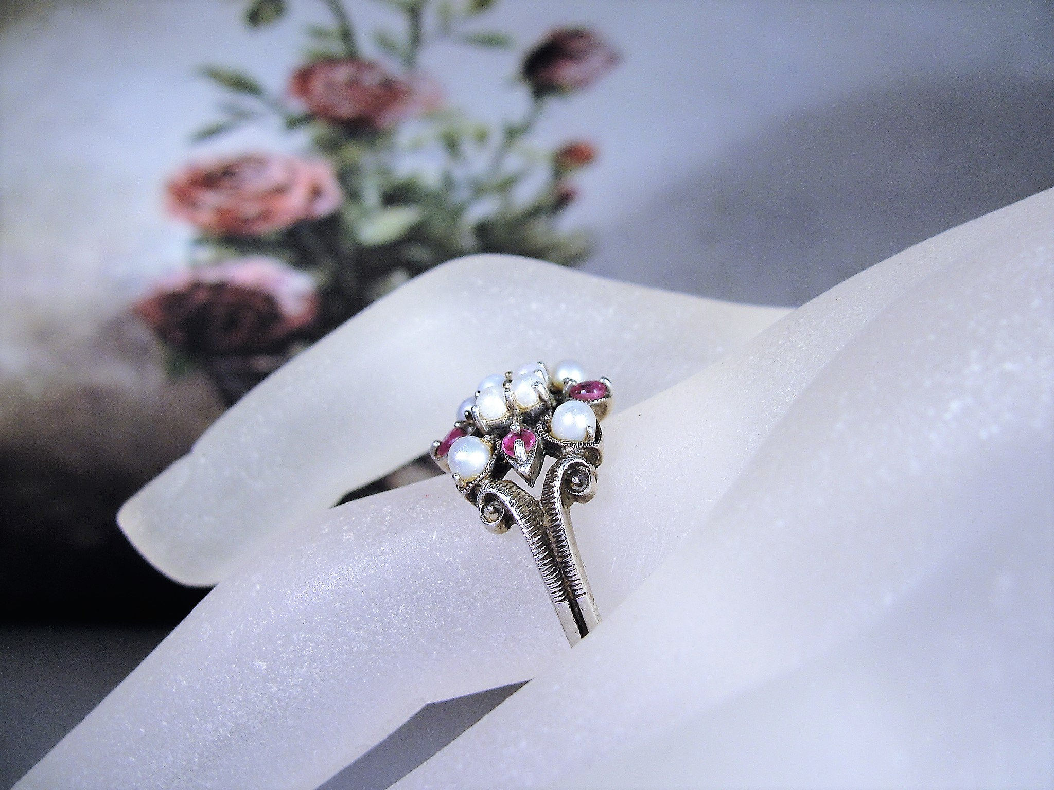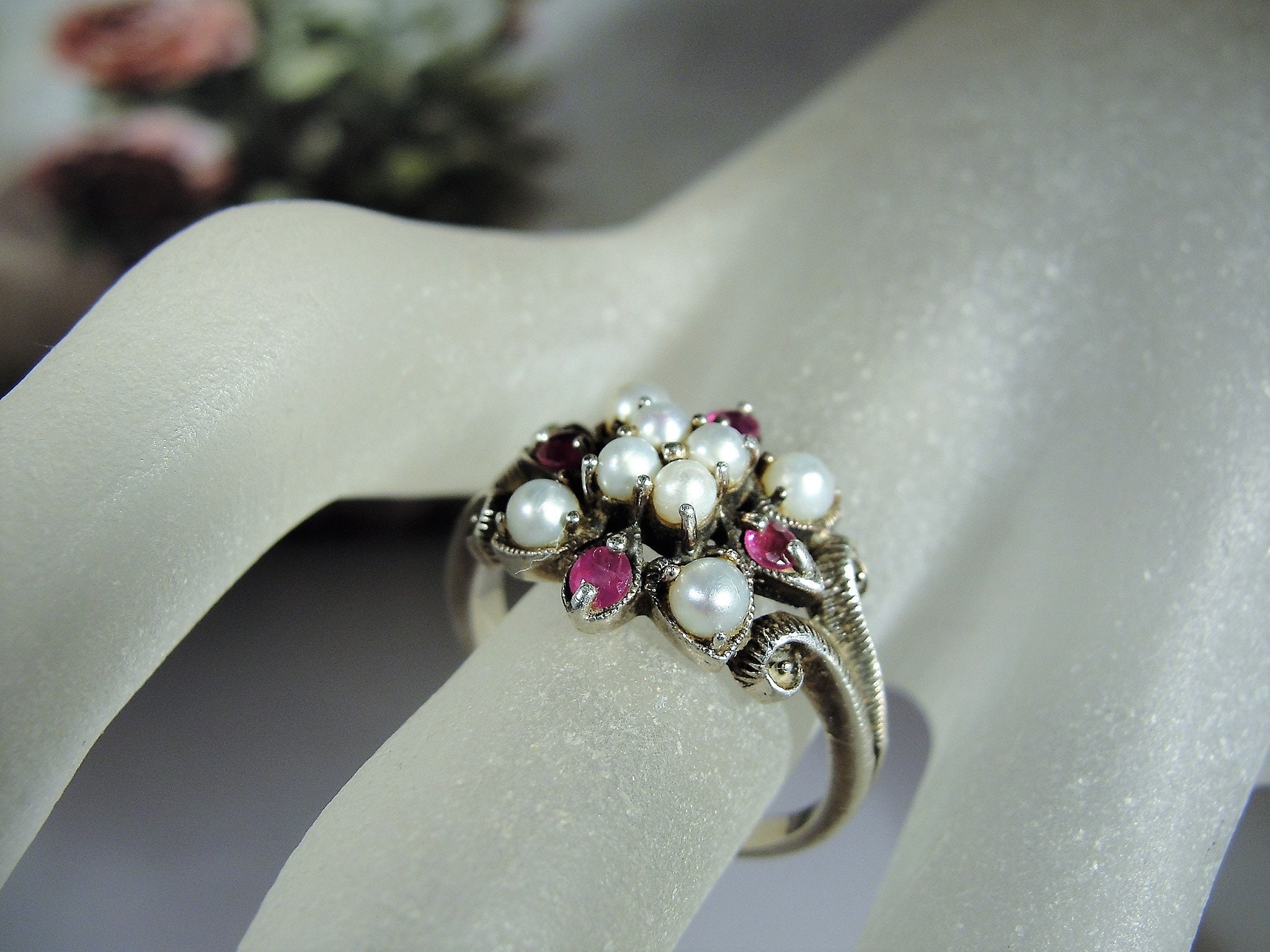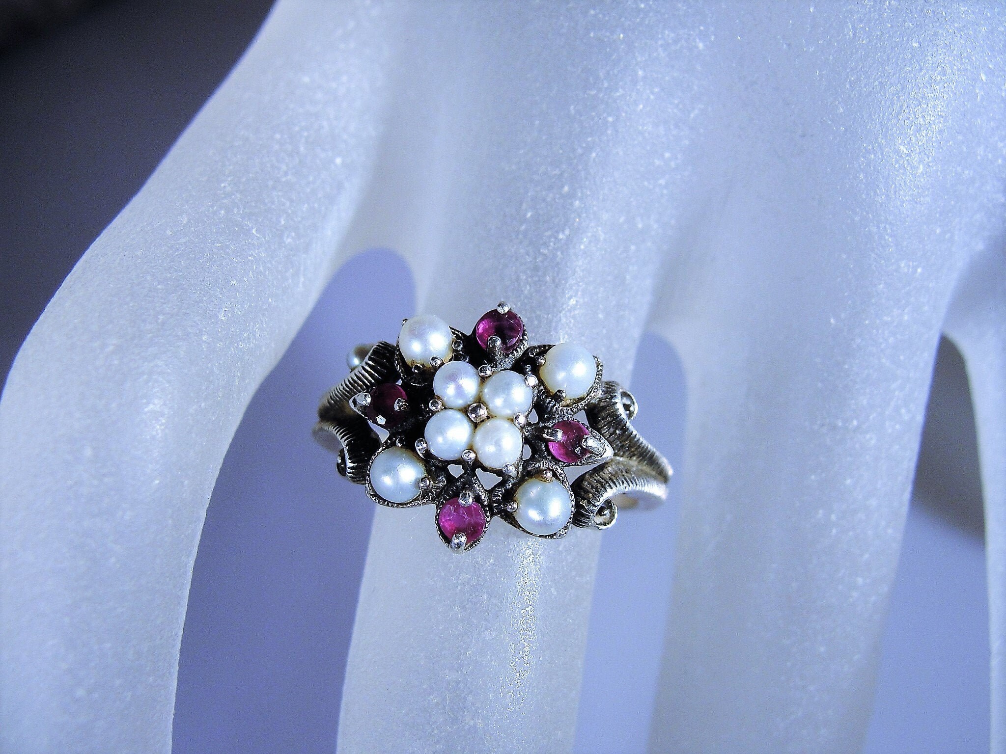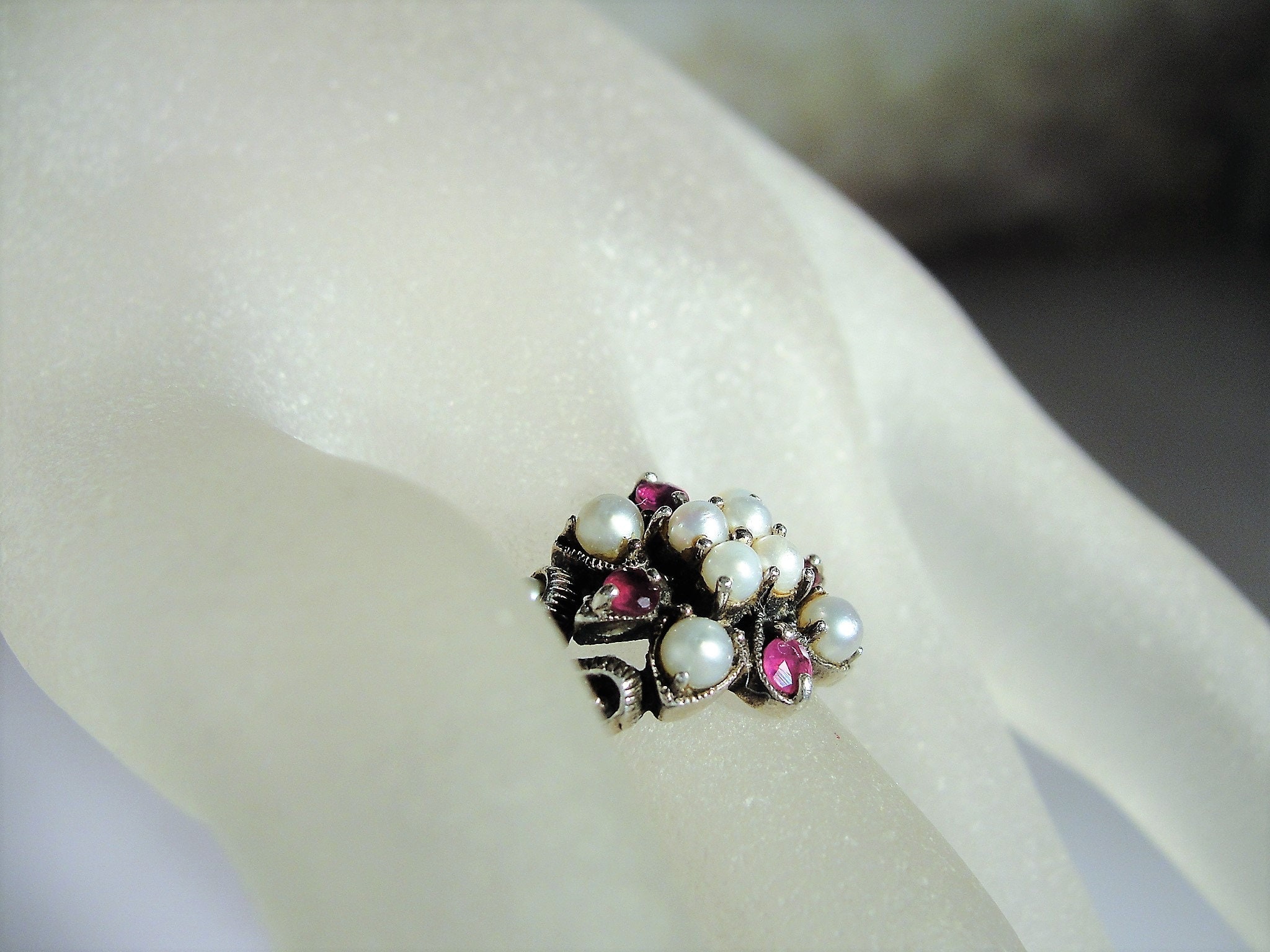 This is a gorgeous genuine ruby and seed pearls ring that is set in Sterling Silver. The ring consists of 8 seed pearls, all nicely matched and 4 genuine faceted round rubies. Down each side of the band is a scrolled decorative milgrain or caviar beaded metal work. Just a lovely, feminine ring from a time gone by!