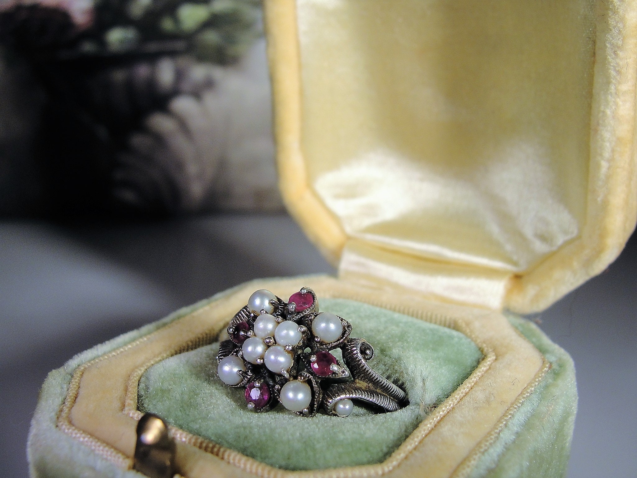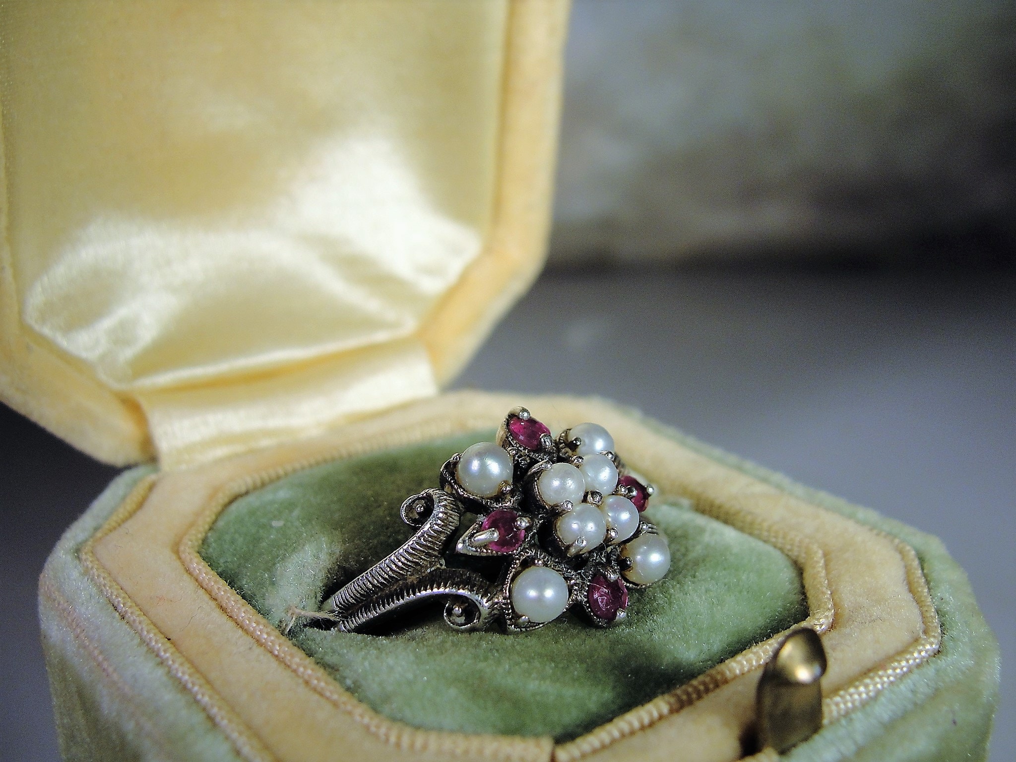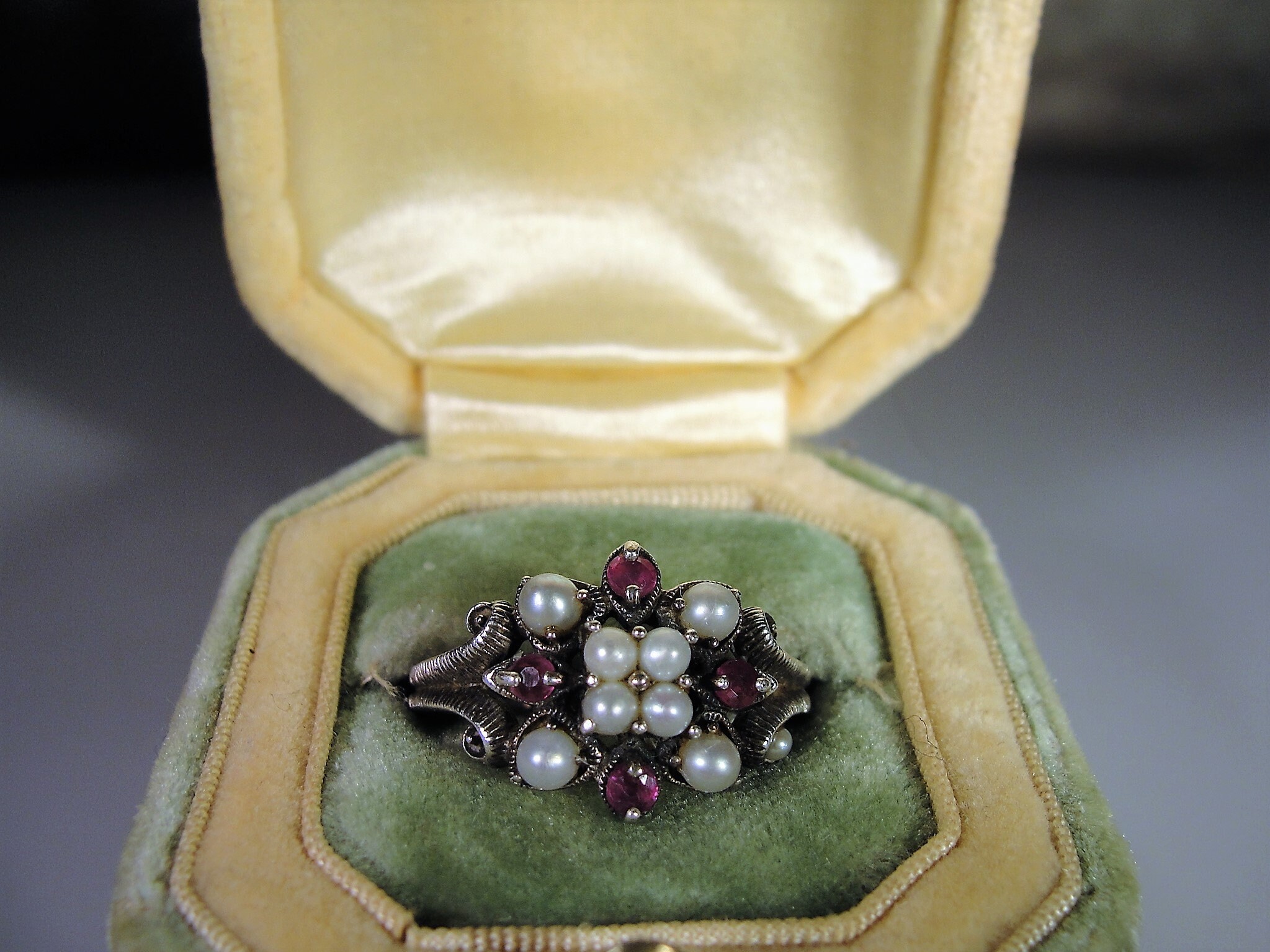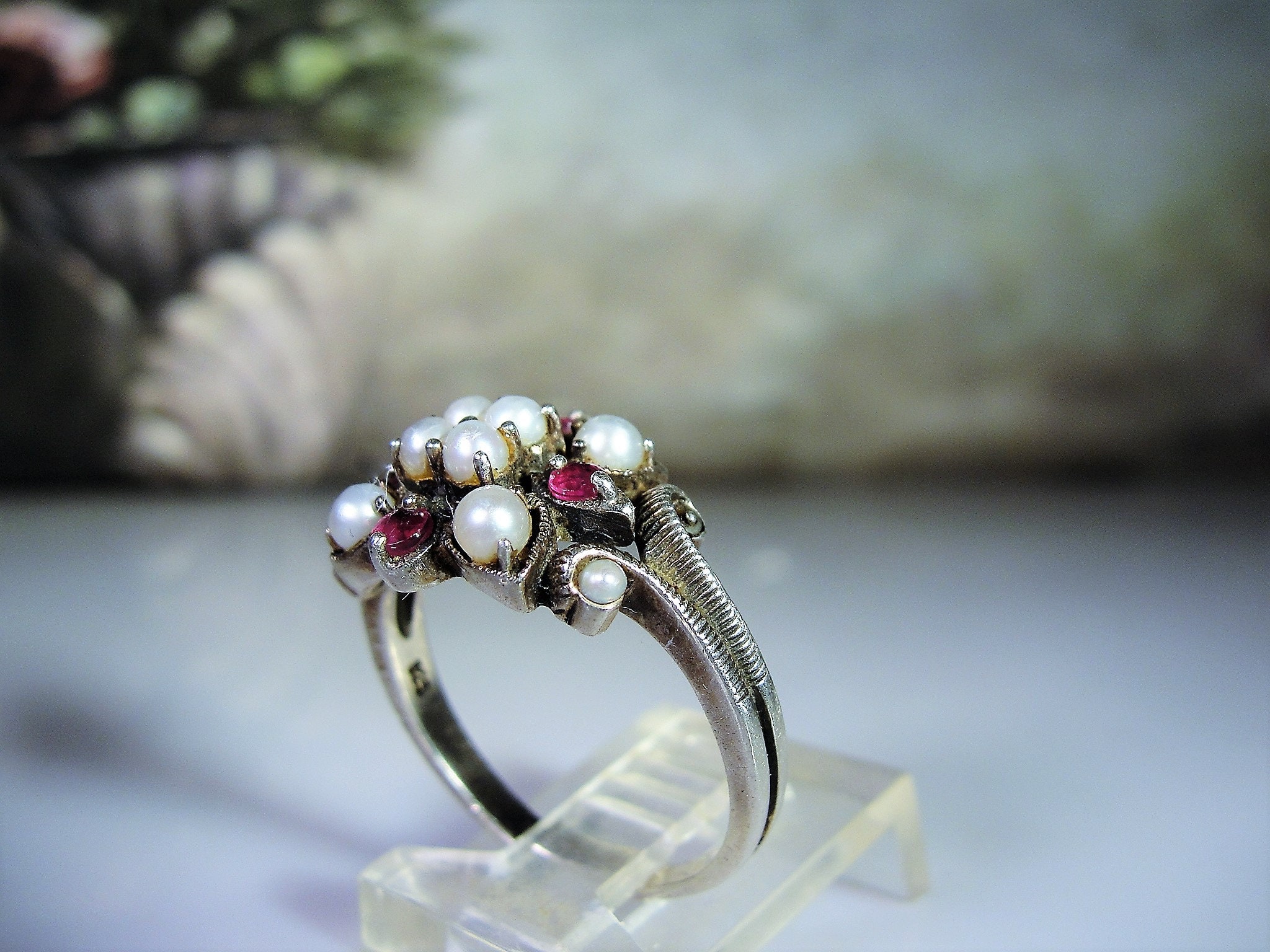 This is a gorgeous genuine ruby and seed pearls ring that is set in Sterling Silver. The ring consists of 8 seed pearls, all nicely matched and 4 genuine faceted round rubies. Down each side of the band is a scrolled decorative milgrain or caviar beaded metal work. Just a lovely, feminine ring from a time gone by!