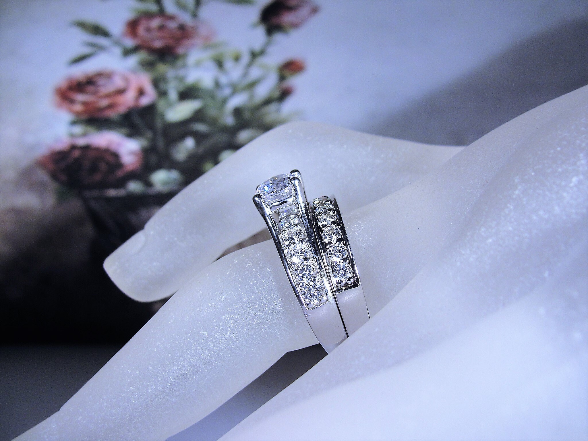This is a Sterling Silver Cubic Zirconia Diamond Bridal Ring Set that was used by my retired jeweler friend to show her customers what this set would actually look like when made with real diamonds. This ring set was in her display case for years and these rings have never been worn for personal use. They are considered a display model.