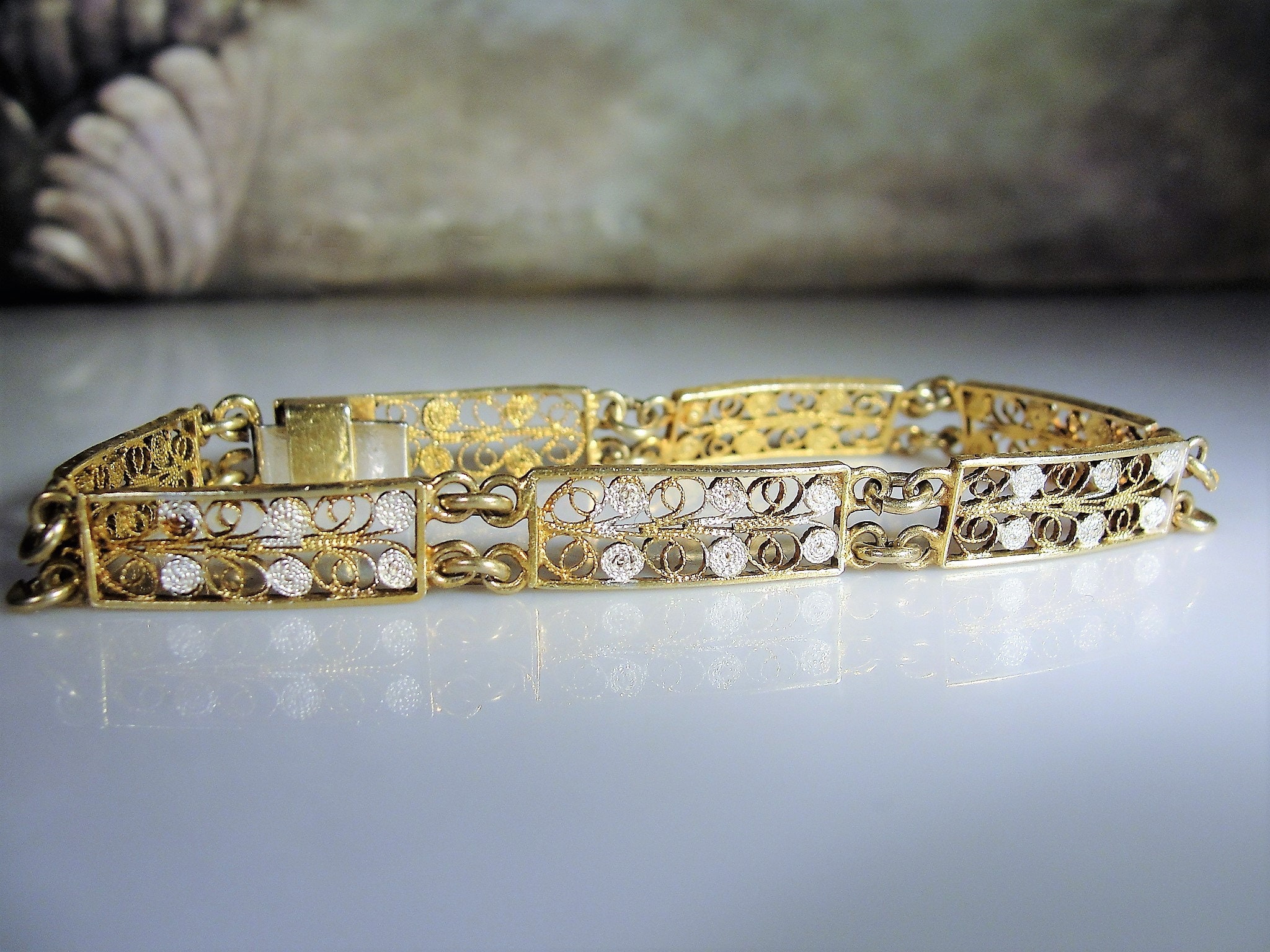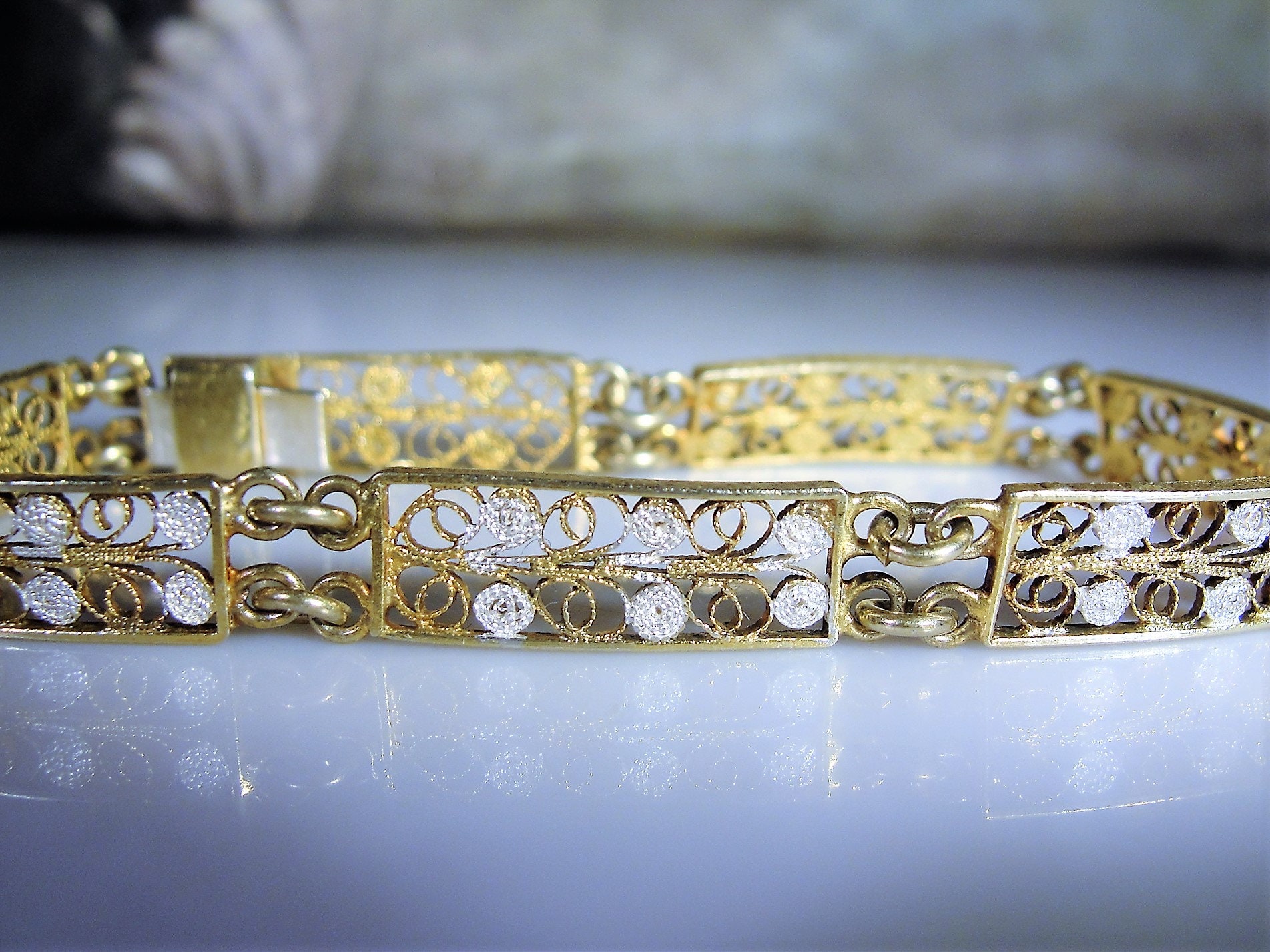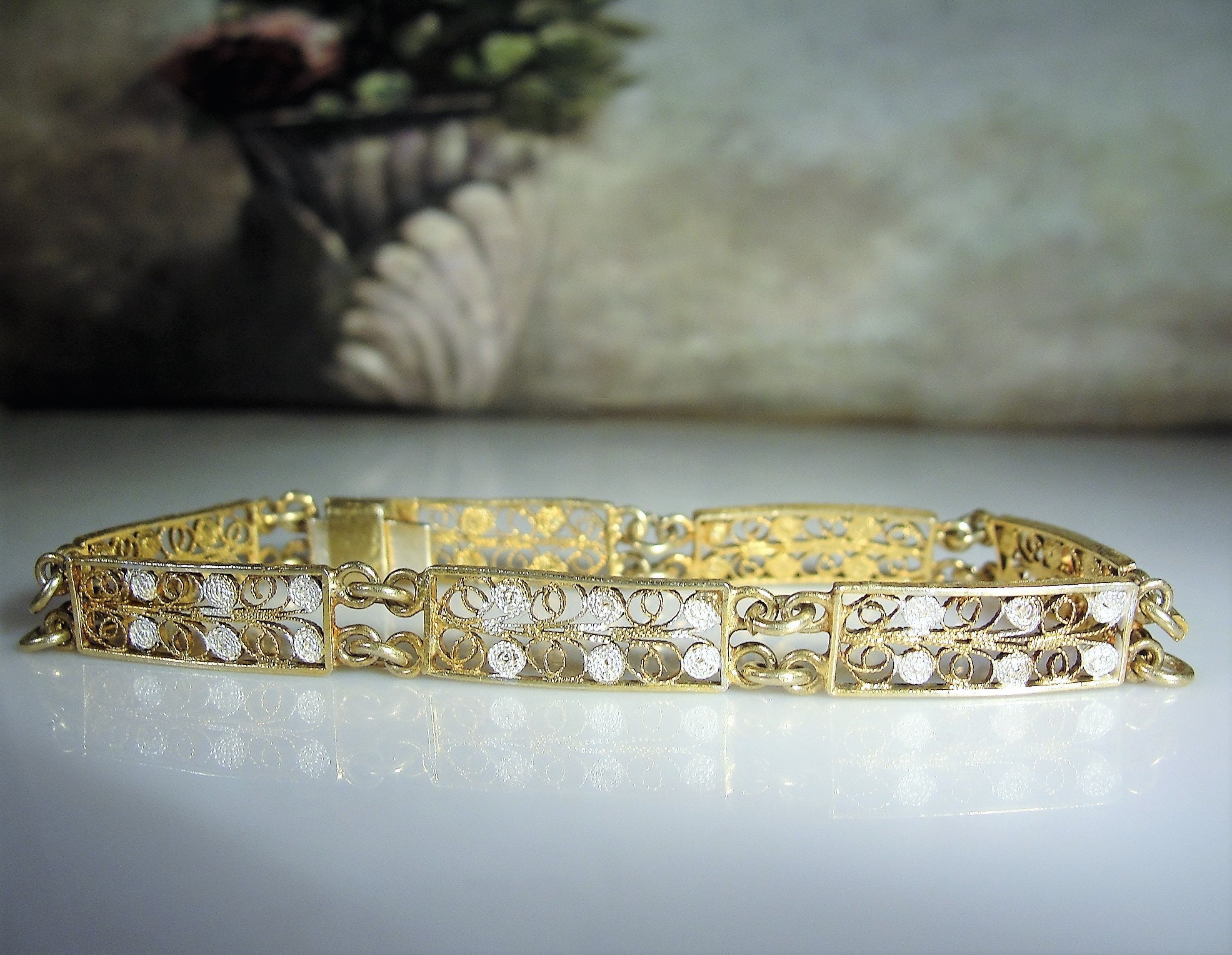 Beautiful Dainty Vintage European 800 Silver with Gold Wash Vermeil/Filigree Panels or Links Bracelet. 7 Filigree Designed Panels, 3/8 of an inch wide. Bracelet 7 inches long, weight 6.6 grams. Very minor wear to the gold wash. Box clasp works well.