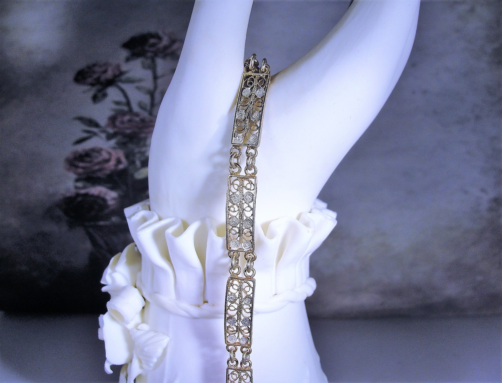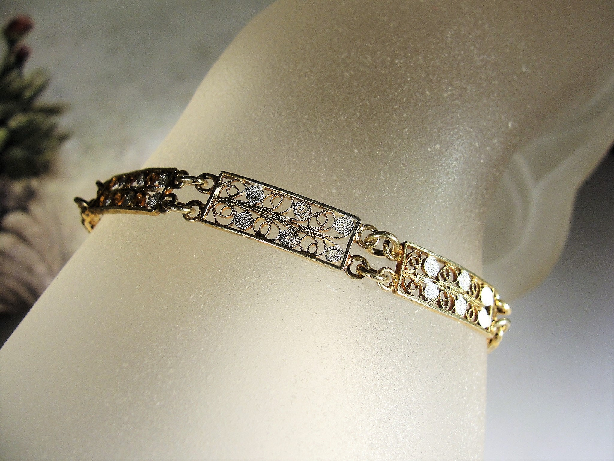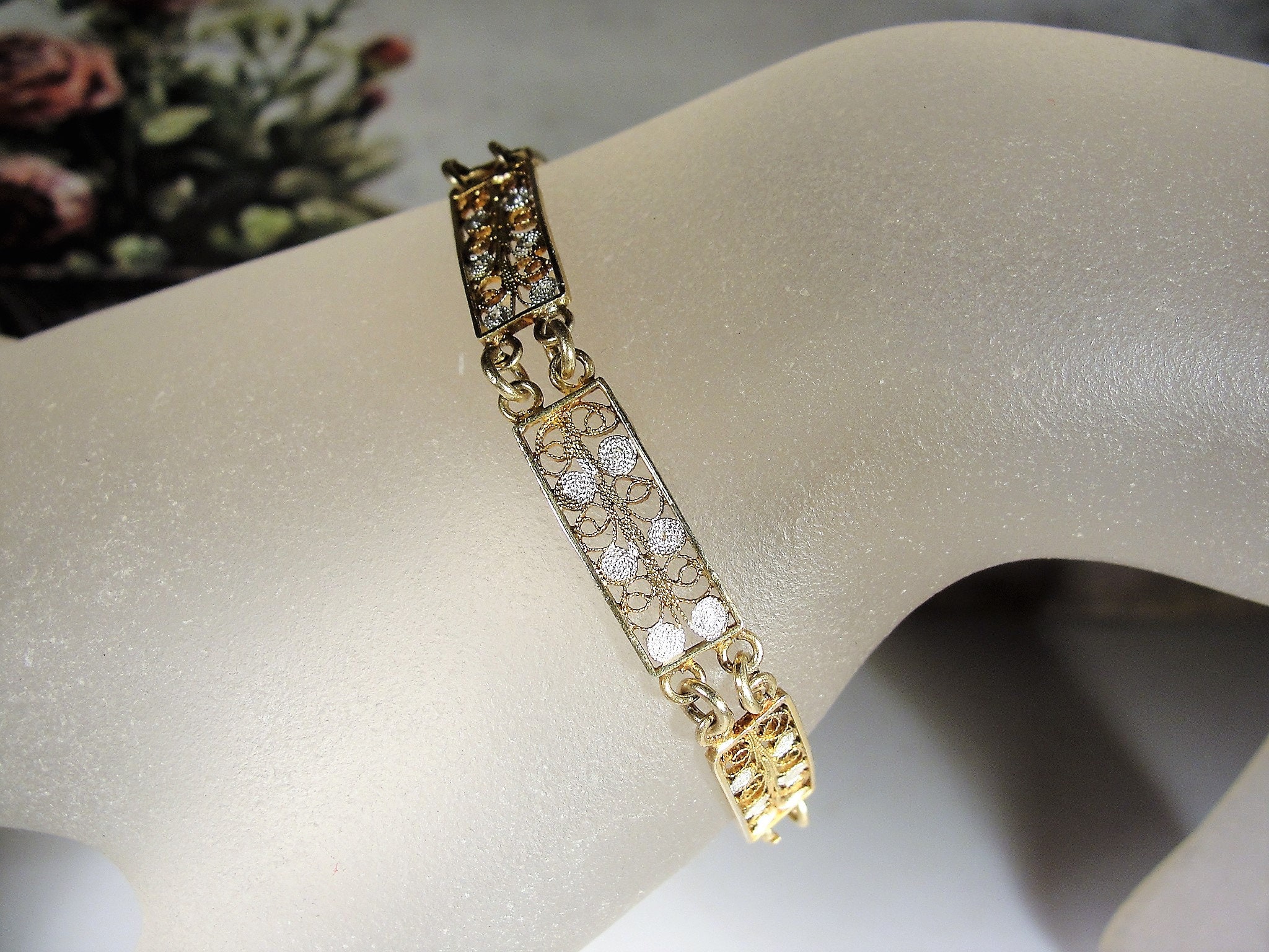 Beautiful Dainty Vintage European 800 Silver with Gold Wash Vermeil/Filigree Panels or Links Bracelet. 7 Filigree Designed Panels, 3/8 of an inch wide. Bracelet 7 inches long, weight 6.6 grams. Very minor wear to the gold wash. Box clasp works well.