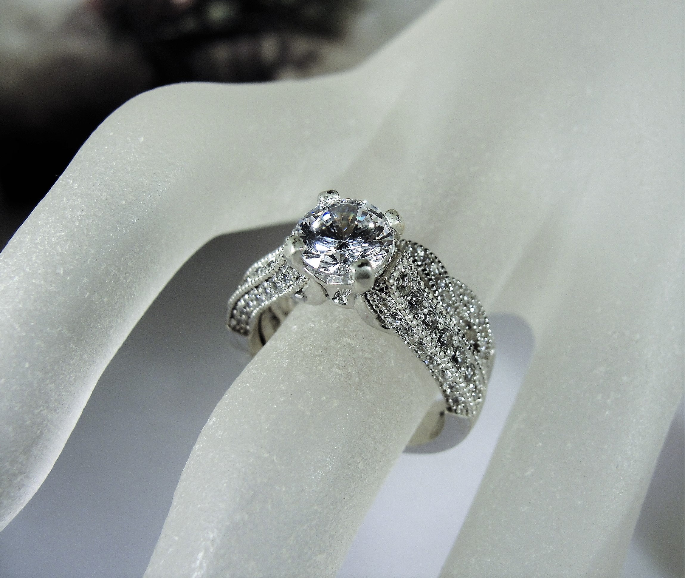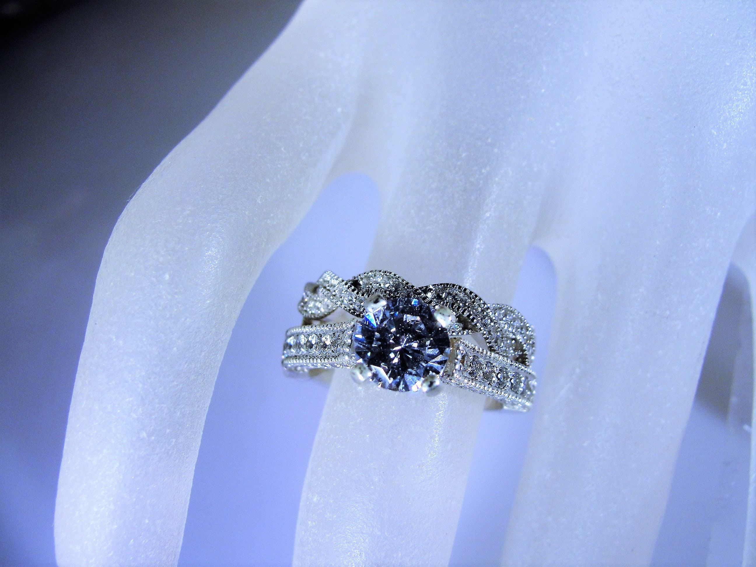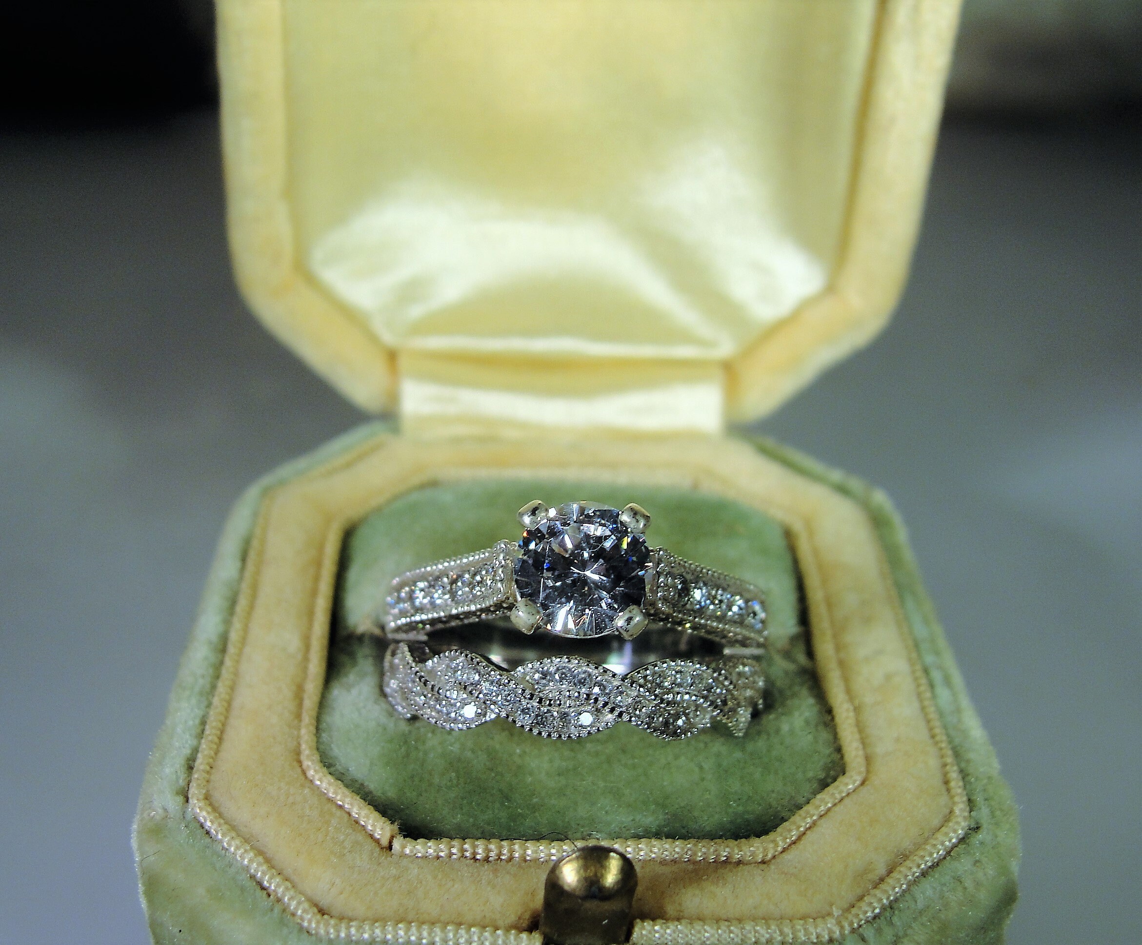 This is a Sterling Silver Cubic Zirconia Diamond Bridal Ring Set that was used by my retired jeweler friend to show her customers what this set would actually look like when made with real diamonds. This ring set was in her display case for years and these rings have never been worn for personal use. They are considered a display model.