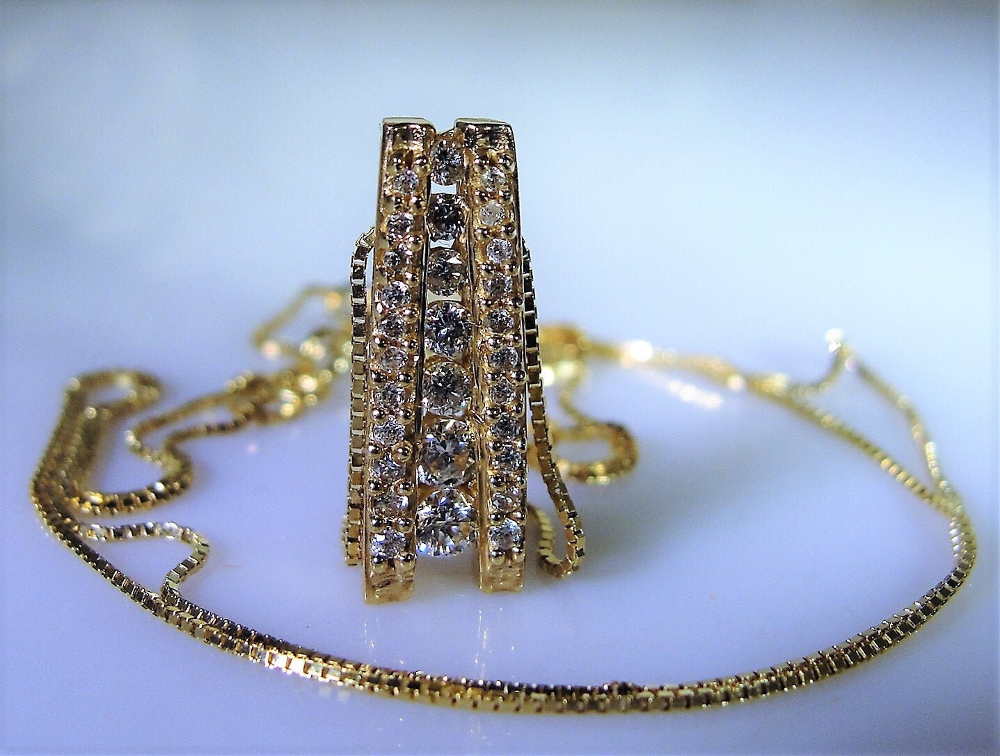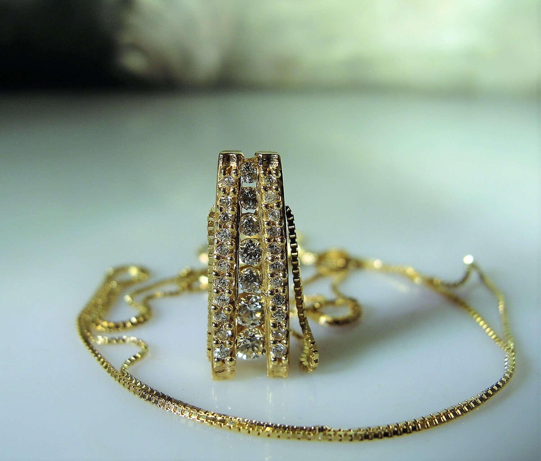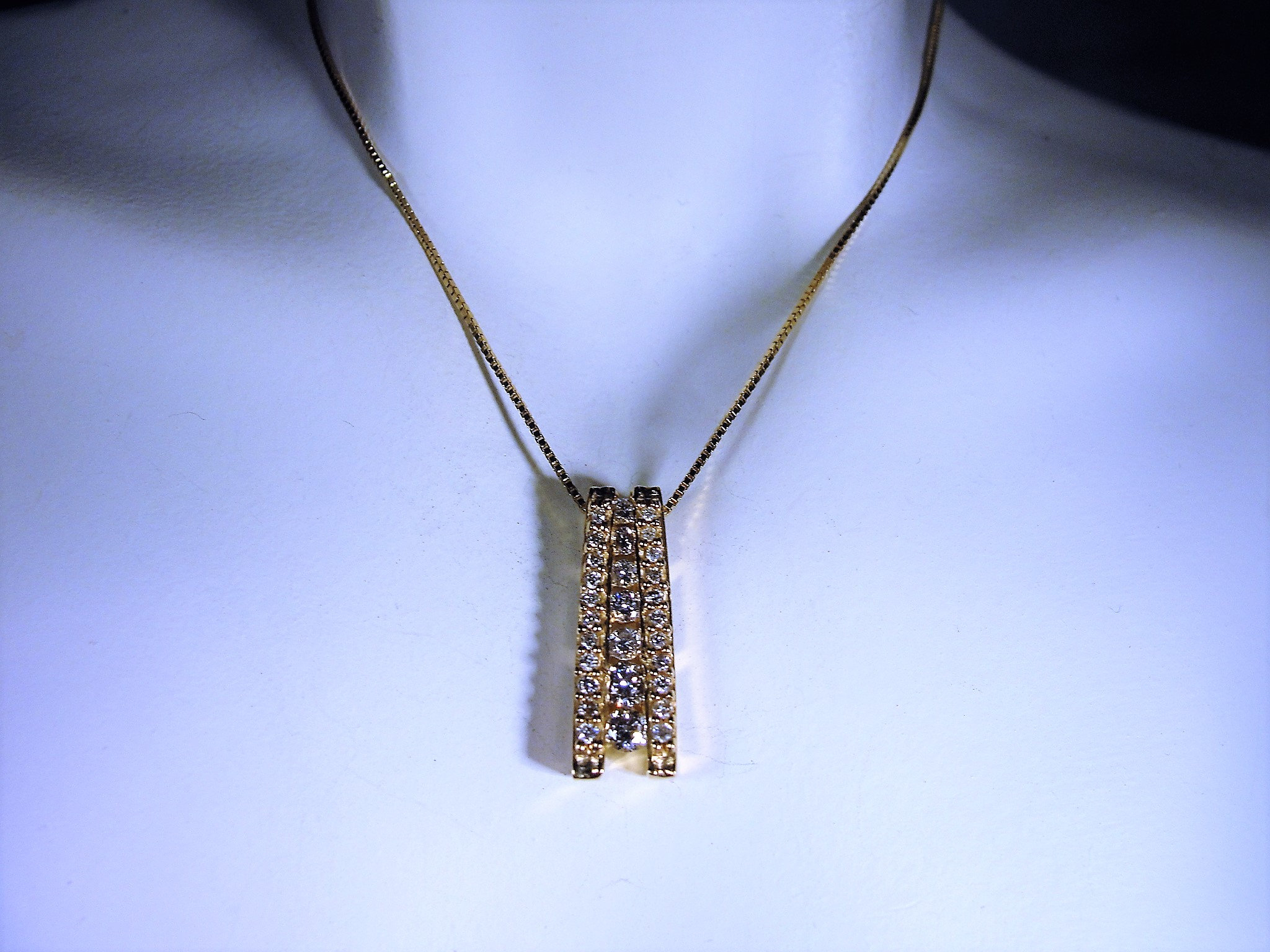 This is a gorgeous Natural Diamond Journey Style Necklace. All diamonds in this necklace are genuine, natural diamonds from the earth. The total carat weight of this necklace is .33 CTW. There are 7 round diamonds that are channel or bar set in the center of the pendant and on each side of the center row of diamonds is a row of 11 small round diamonds enhancing both sides of the center row of larger diamonds. This makes for a stunningly elegant presentation! The smaller diamonds on the sides are all prong set and the quality of all diamonds are very well matched and just stunning!!