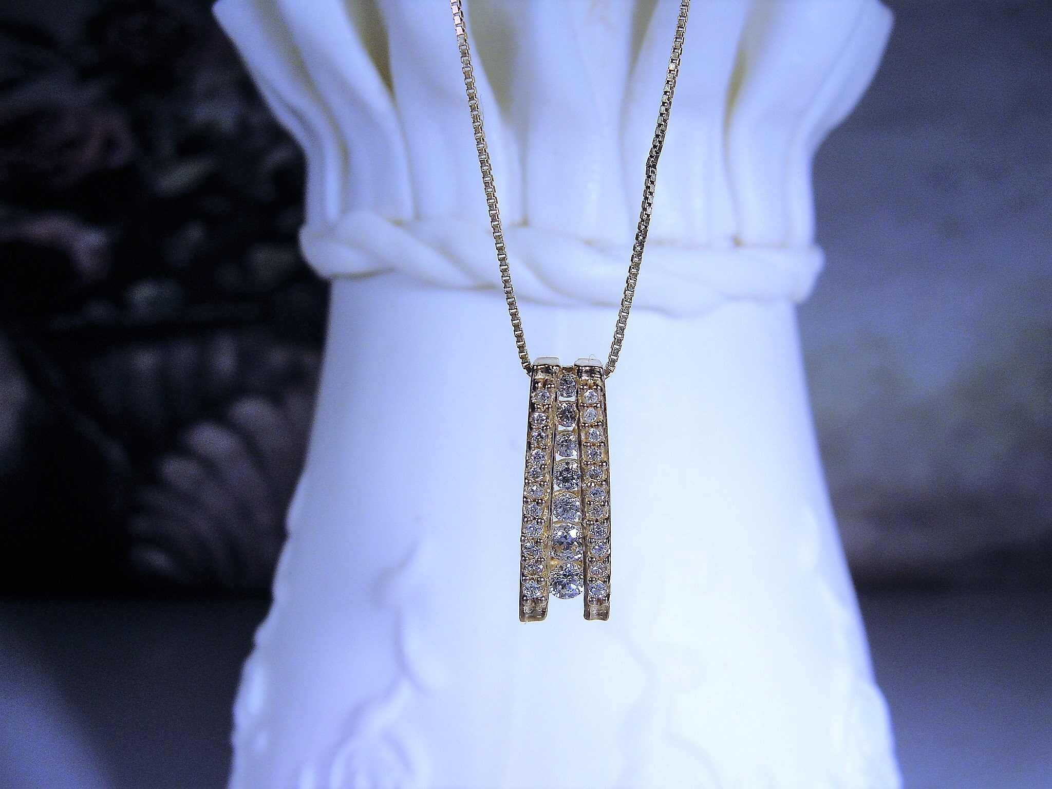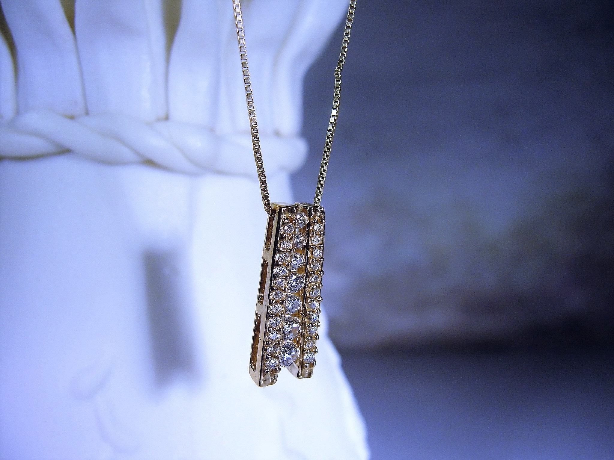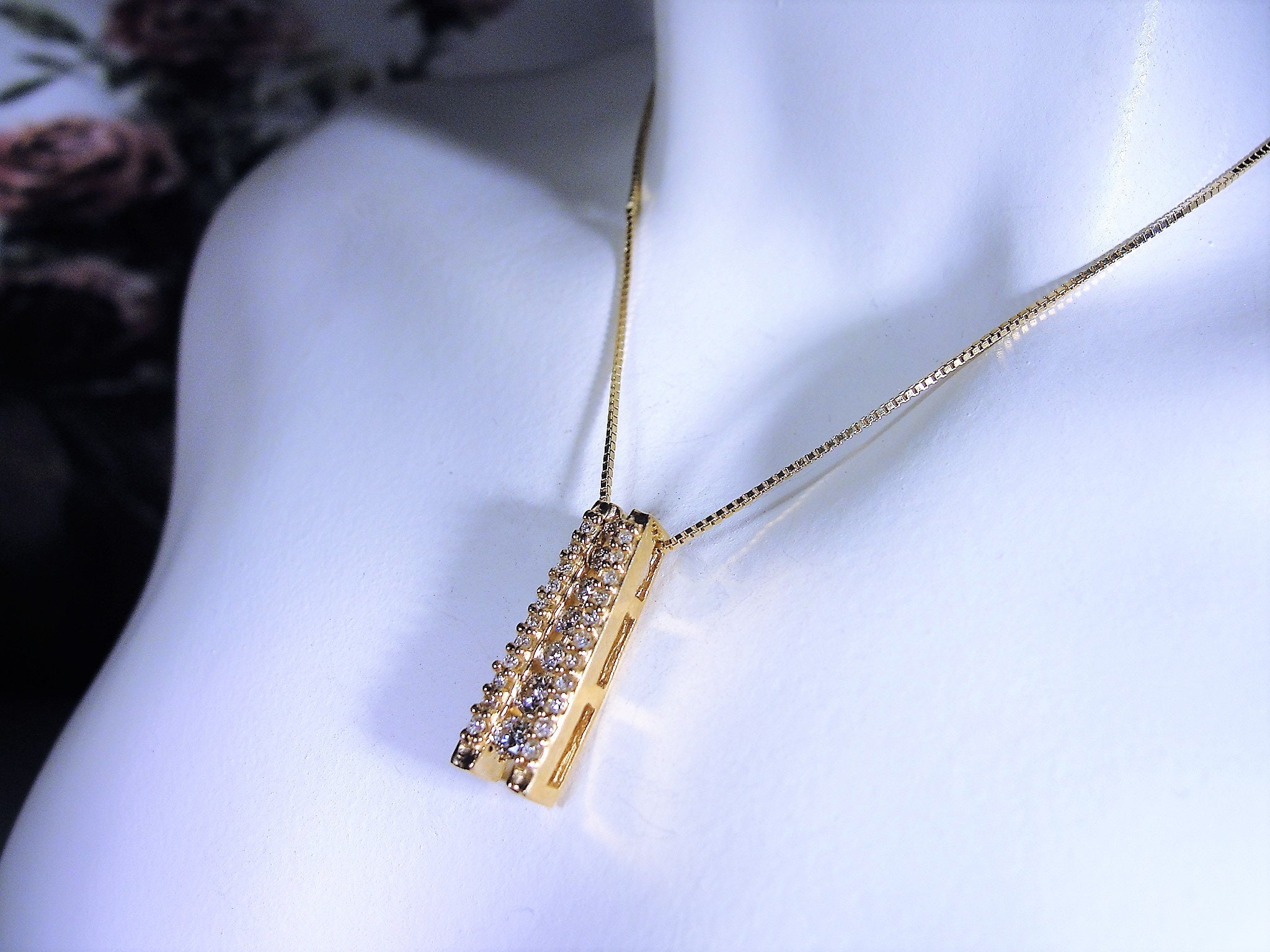 This is a gorgeous Natural Diamond Journey Style Necklace. All diamonds in this necklace are genuine, natural diamonds from the earth. The total carat weight of this necklace is .33 CTW. There are 7 round diamonds that are channel or bar set in the center of the pendant and on each side of the center row of diamonds is a row of 11 small round diamonds enhancing both sides of the center row of larger diamonds. This makes for a stunningly elegant presentation! The smaller diamonds on the sides are all prong set and the quality of all diamonds are very well matched and just stunning!!