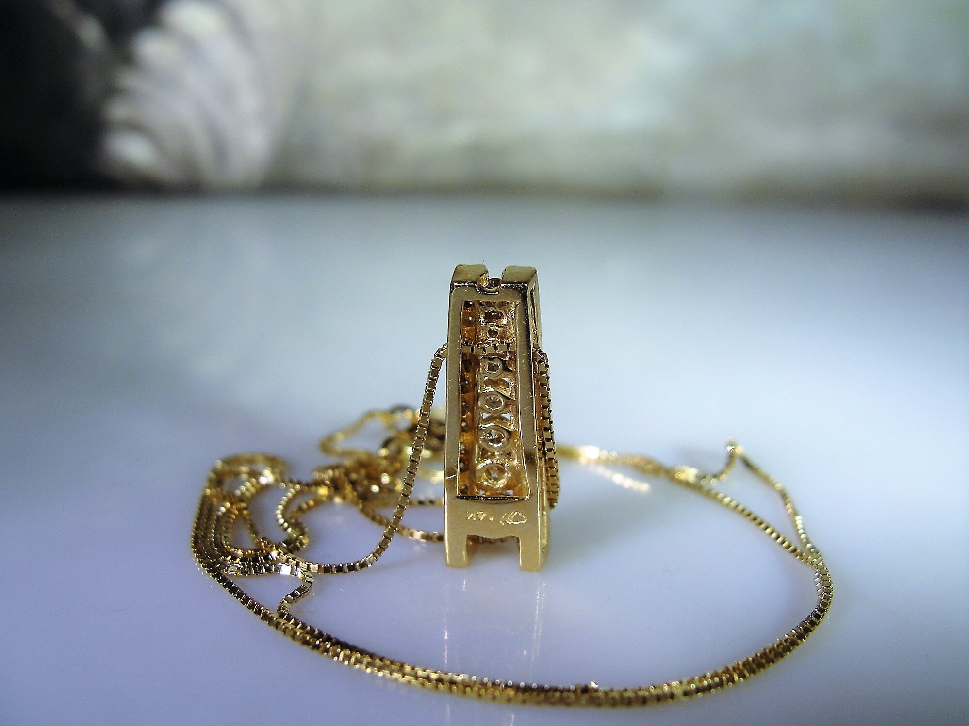 • Hallmarks are found on the chain, the spring clasp and the pendant - “14K” and “XL” is also found on the chain